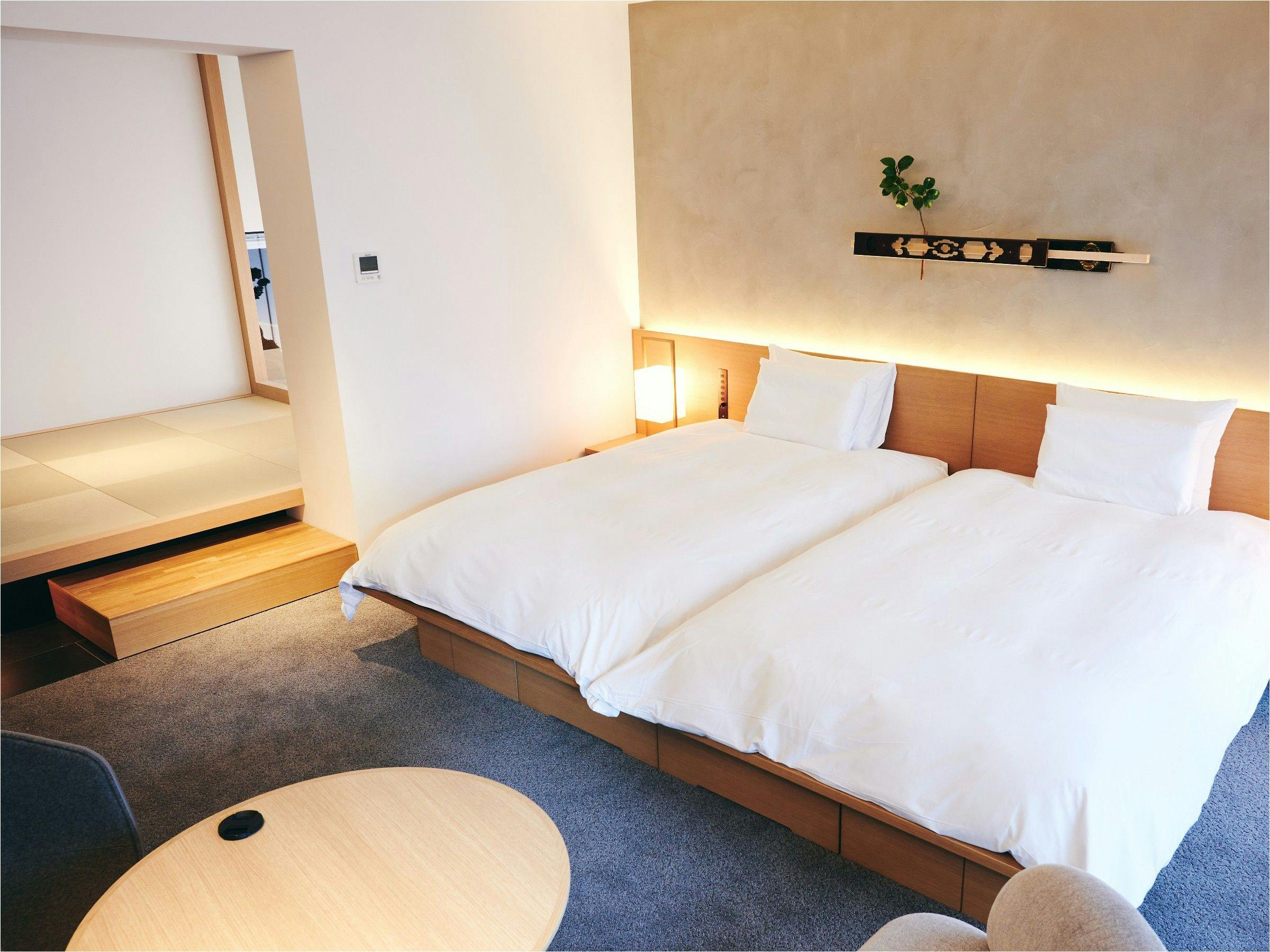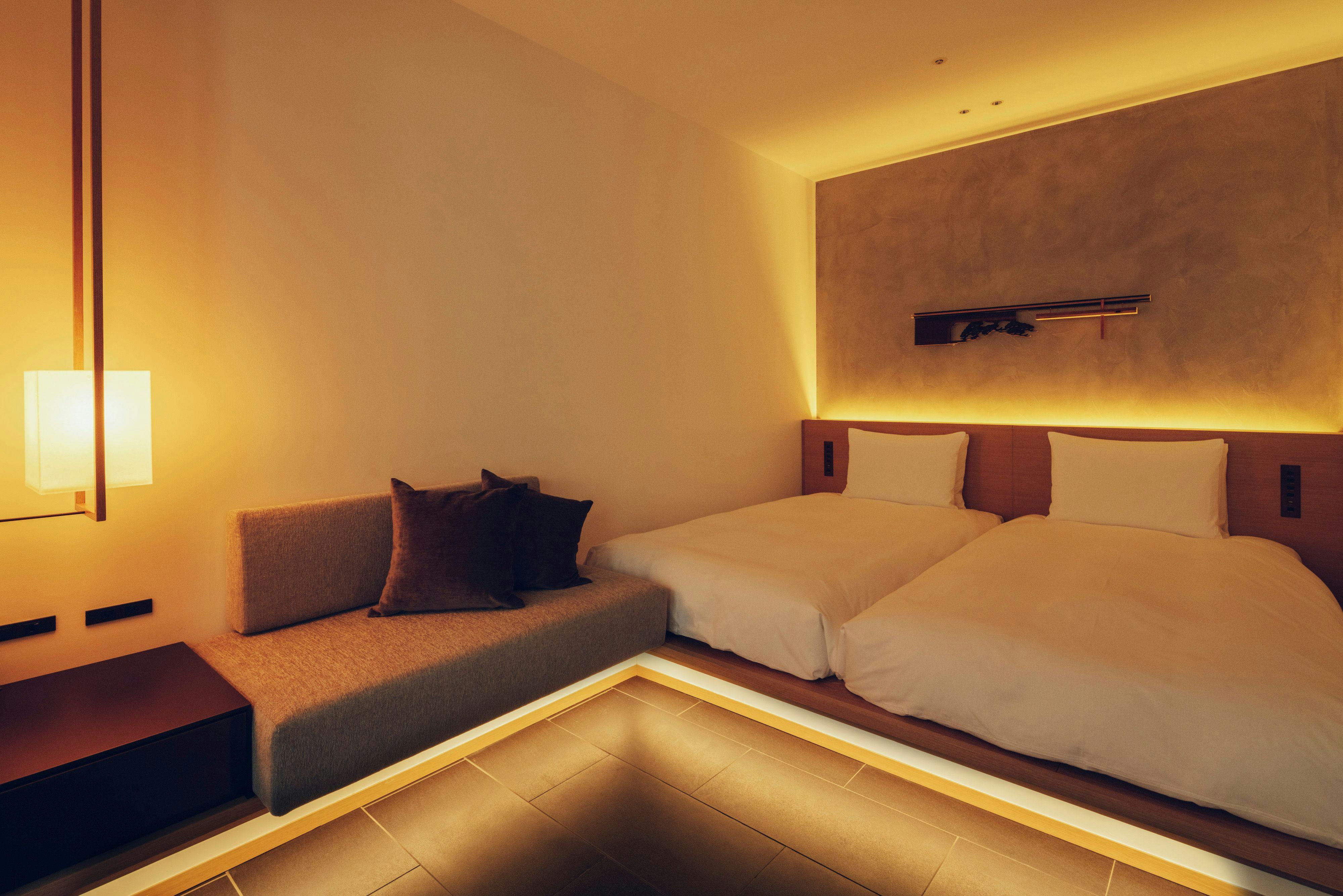 京都の寝具店「寝具御誂専門店IWATA」の天然素材高機能マットレス【ラークオール】を使ったお部屋です。寝具以外はHibaburo Deluxeと同タイプです。【39平米】セミダブルベッド2台(120cm幅)|ヒバ風呂・キッチン・全自動洗濯機・Wi-fi(無料)<ラウンジ利用無料>