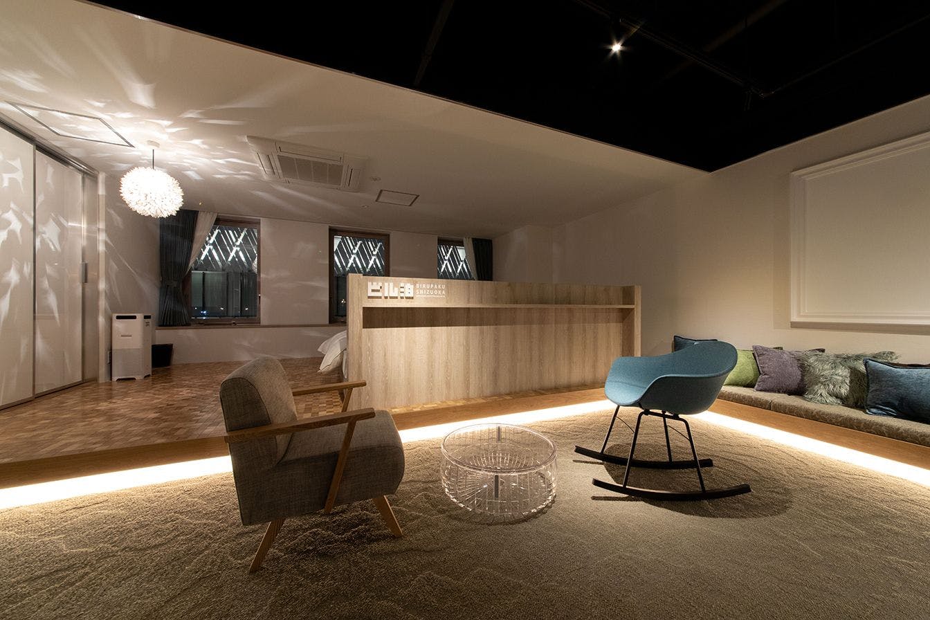 ビル泊で唯一ペットとの宿泊が可能な、一棟貸しメゾネットタイプのお部屋です。開放的なエントランスやお部屋を見下ろせる通路など、レイアウトがじつにユニーク。駿府城公園をはじめ、近隣には散策スポットが点在しているため、ペットとのお出かけも存分にお楽しみいただけます。