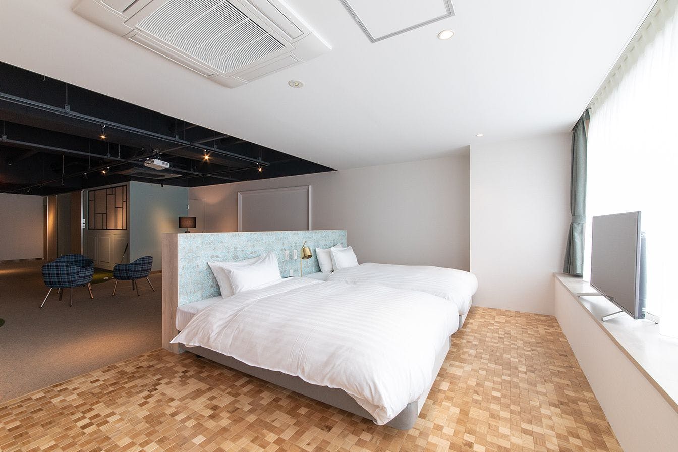 99平米の広さを誇る、ビル泊のフラッグシップルームです。呉服町通りの灯りがやわらかに注ぎ、商店街にステイする非日常体験を存分にご堪能いただけます。401号室と402号室は隣接しており、2グループ最多10名様での利用も可能。街の中心にありながら表立つことのない、隠れ家のような客室です。