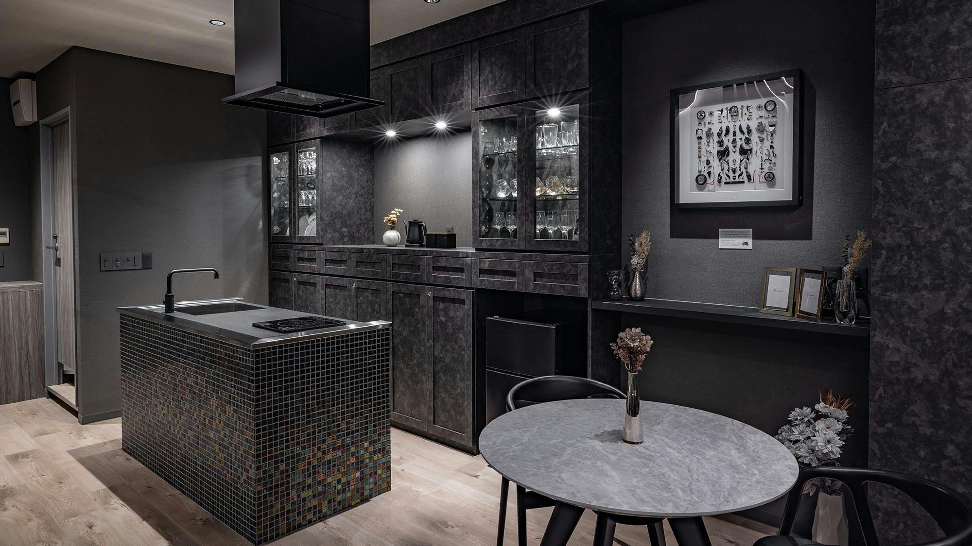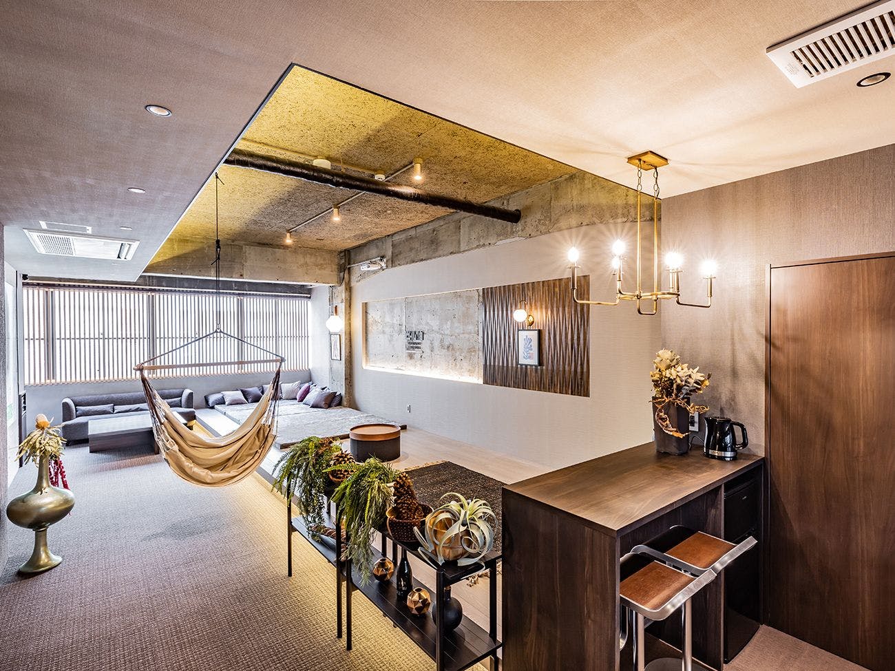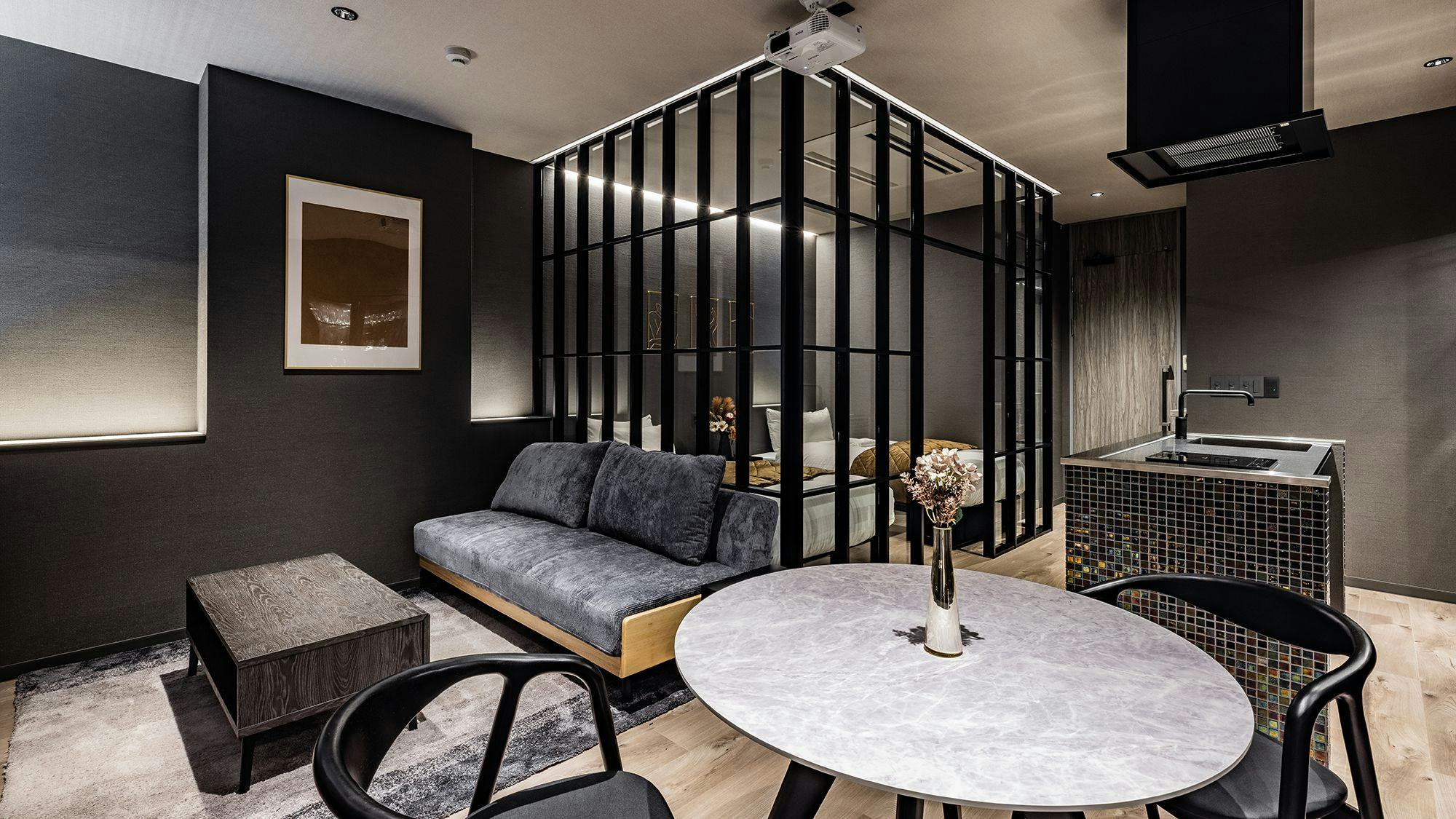 非日常を堪能できる、シックで落ち着いたお部屋です。ベッドルームの周囲をガラス張りにすることで、上質感あふれる空間に。ラインライトがつくりだす、おしゃれな光の演出も魅力です。ミニキッチンが付いているため、長期の滞在や暮らすように泊まりたい方にもおすすめです。
