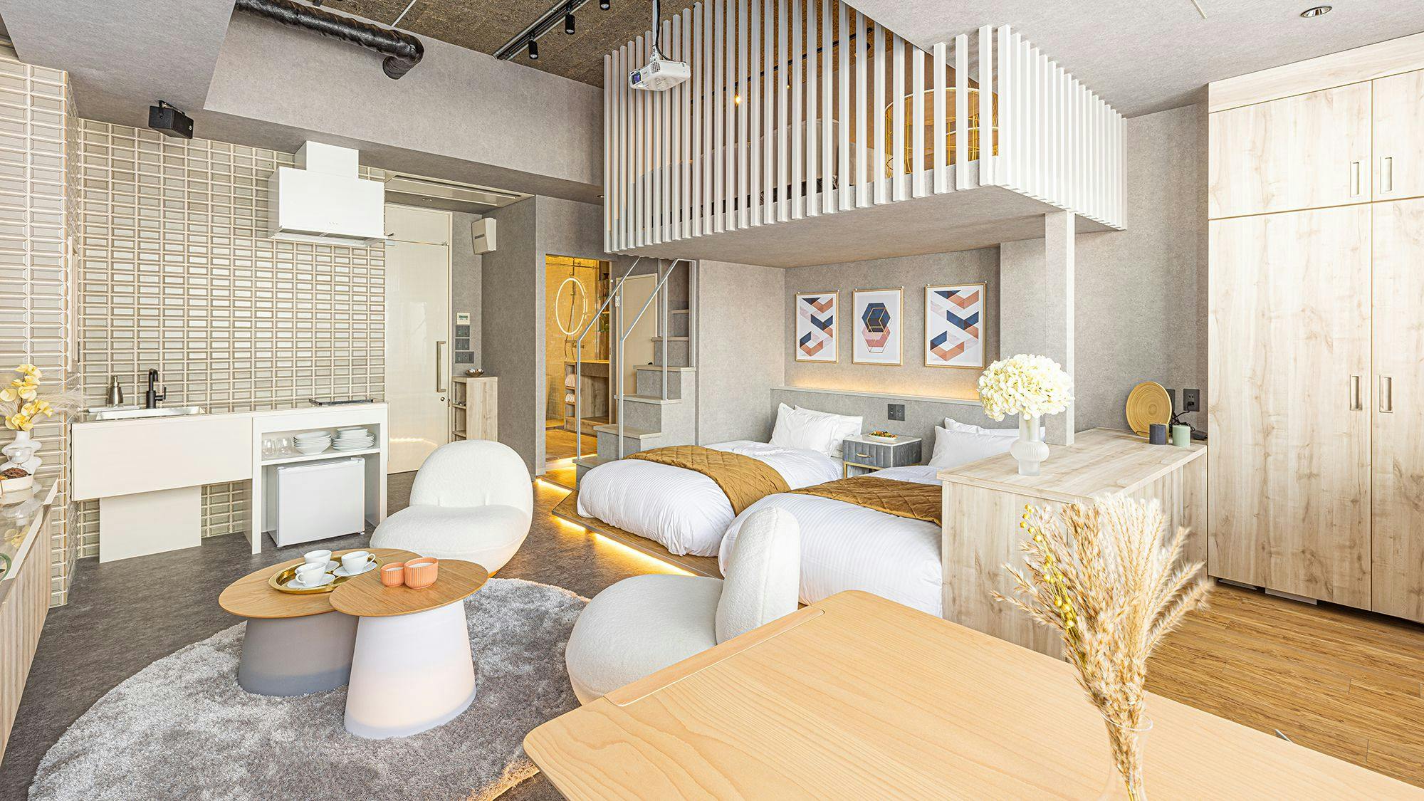 さまざまなマテリアルとカラーを組み合わせた、感性に訴えかけるインテリアが特徴。好奇心の数だけ楽しさが広がる、大人の遊び場であることを実感できるお部屋です。テーブル&チェアやベッドがバランスよく配され、泊まるだけでなく、ステイを満喫したいという方に最適です。