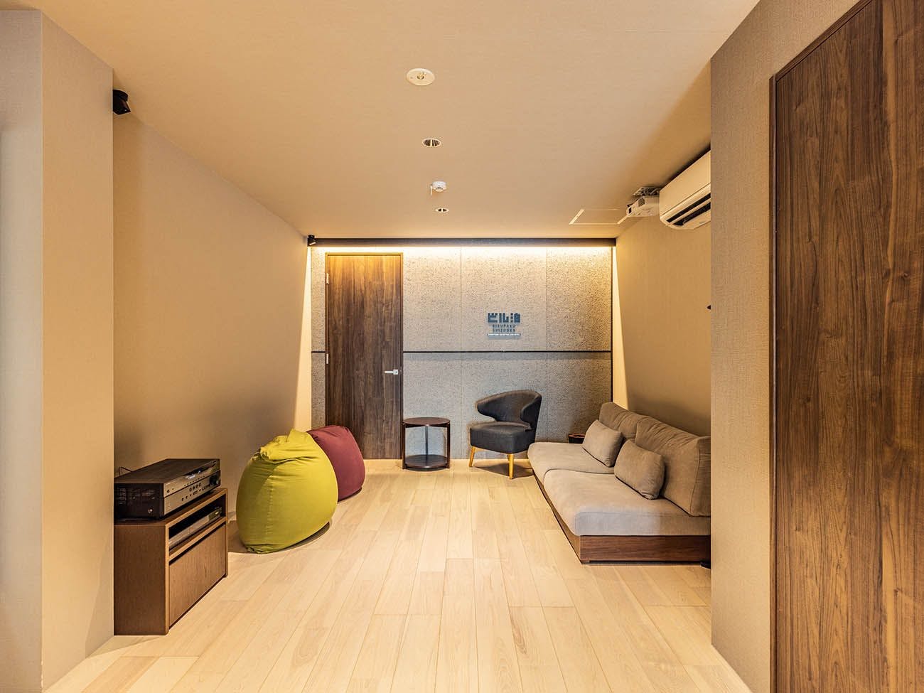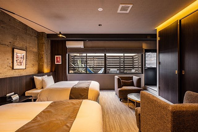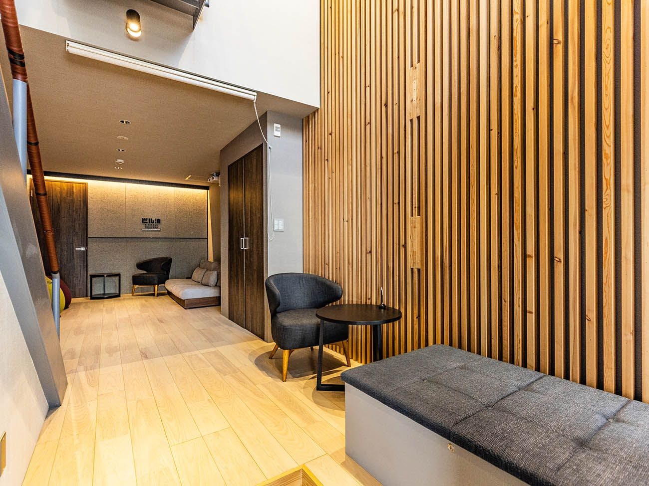 大人の旅を彩る、スタイリッシュなくつろぎ空間。ビルのインダストリアルな雰囲気と上品なインテリアが調和。ビルに囲まれたウッドデッキのテラスでは、お好きなときに食事やお酒をいただくことも。商店街のビルという非日常空間で、上質なステイをお楽しみください。