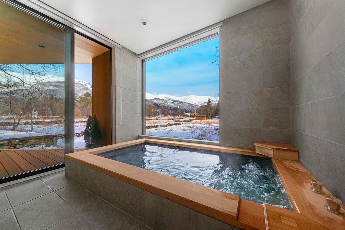 4ベッドルームユニットの八方尾根スキー場と白馬三山が一望できるリビングエリアや和モダンな絶景檜風呂は、特別な空間を演出しています。
