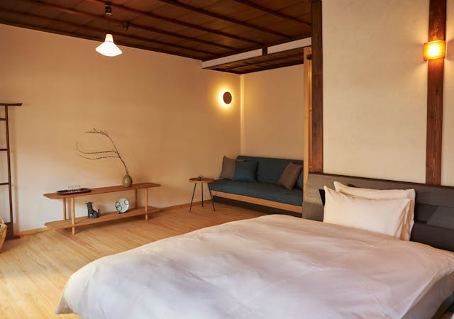 当館は1階客室、2階客室とお部屋をご用意させていただいており、それぞれ畳リビング、ベッドルーム、縁側、檜が香る信楽焼のお風呂、お手洗いがございます。