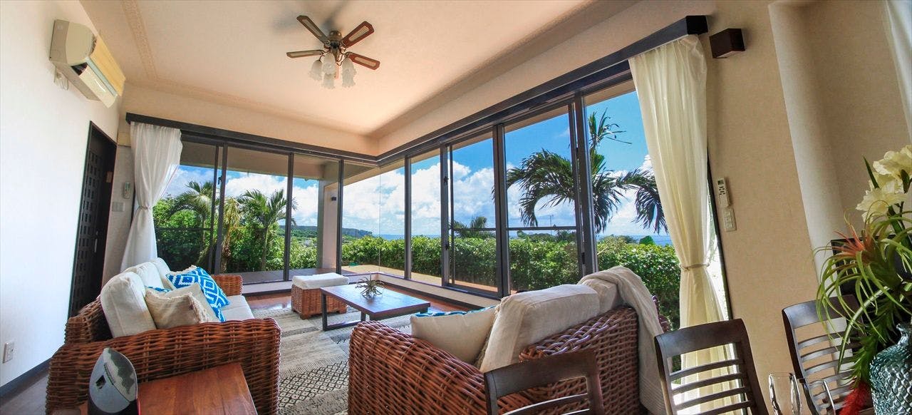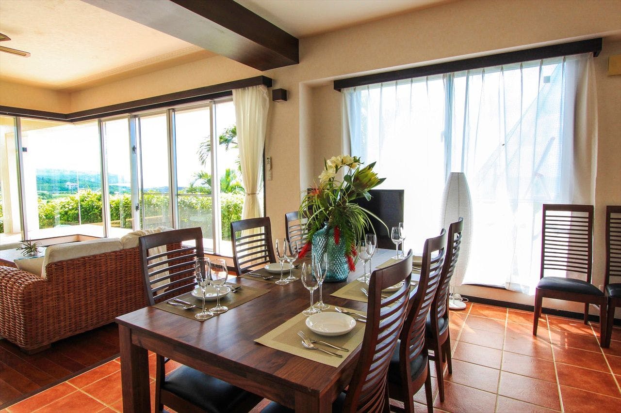 どこにいても海が望める邸内は、開放感溢れる広々とした空間が特長。グループ、複数家族など大人数でもゆったりと快適に過ごせる環境がここにあります。