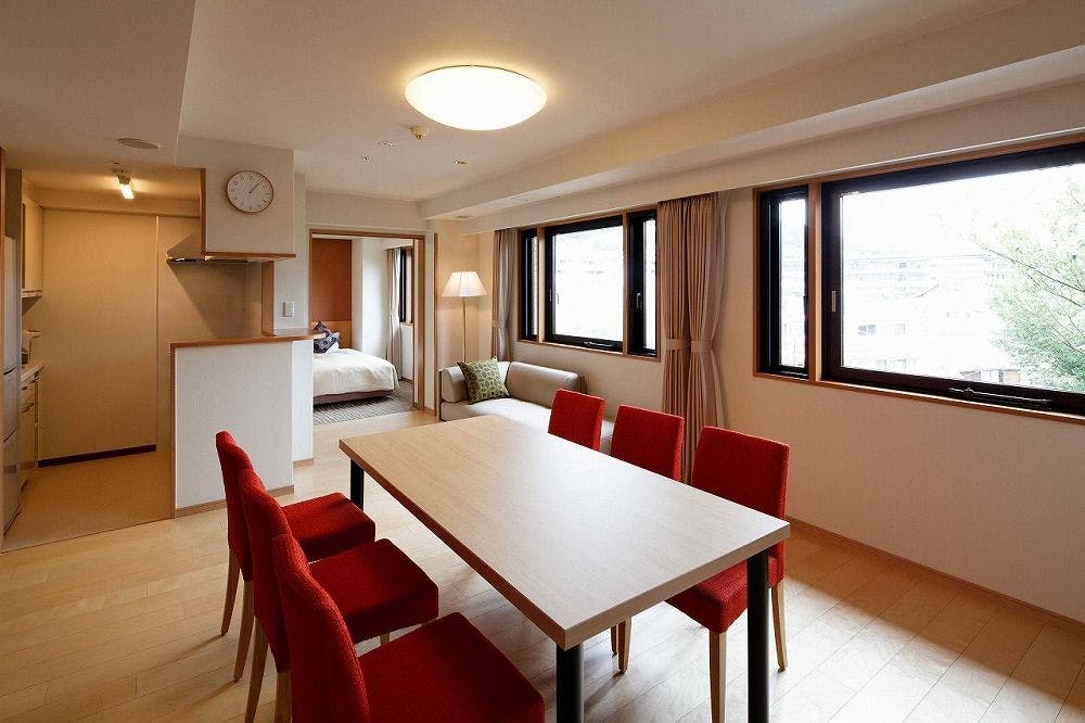 お部屋はリビングダイニング付きの2LDK。地元の食材を調理できるフルキッチンも完備。小さなお子様連れの方も安心してご旅行を楽しめます。
