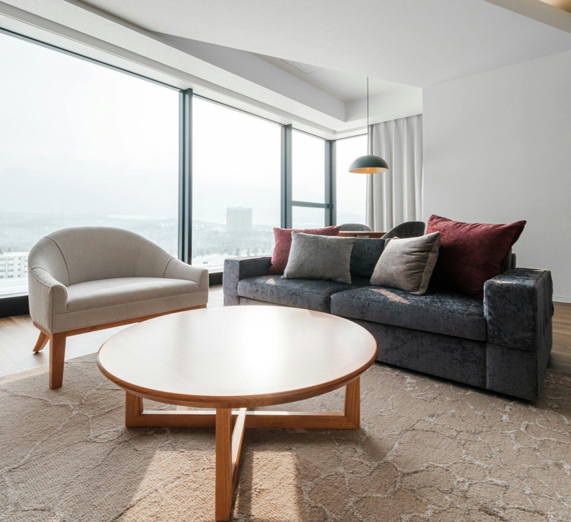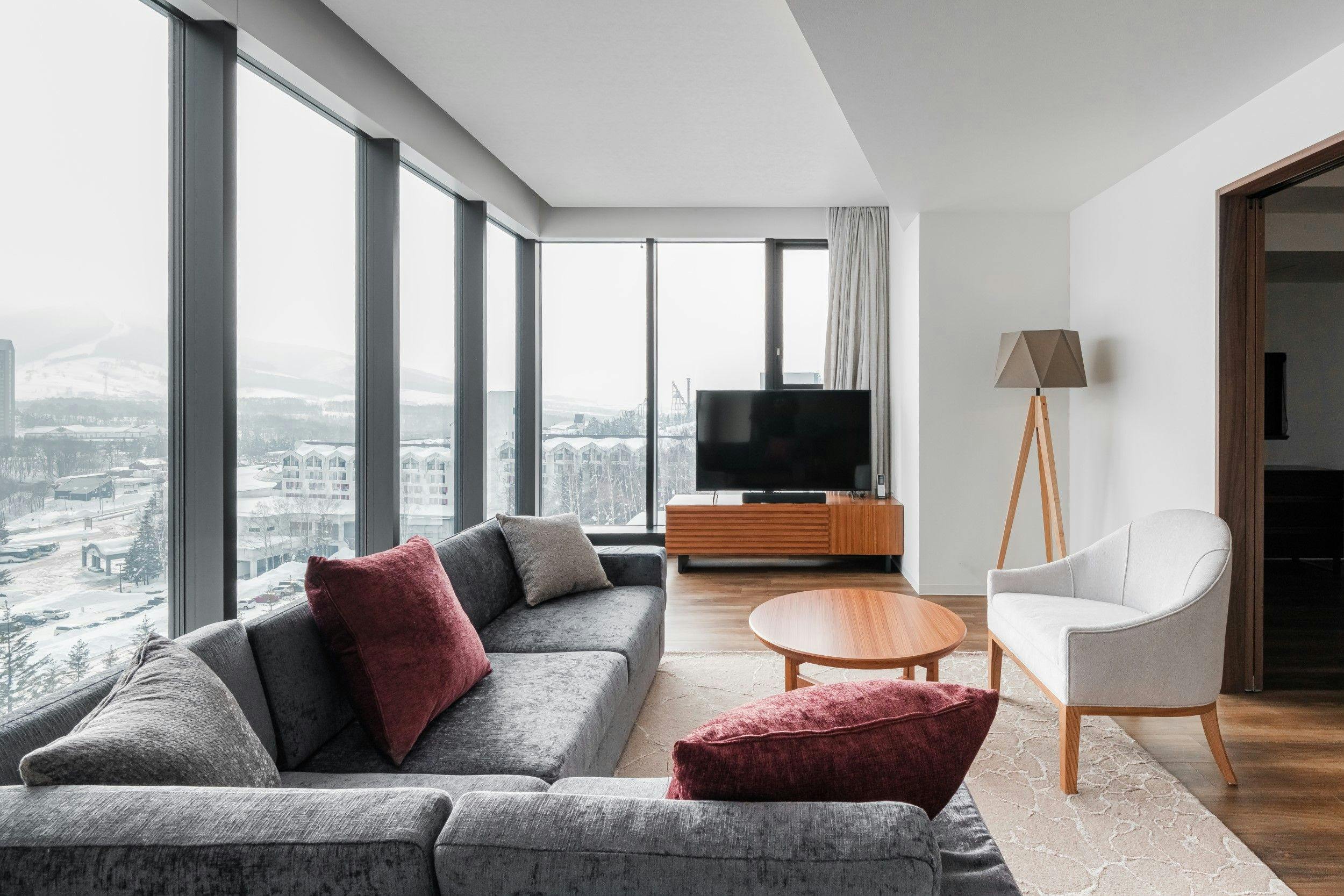 広々としたリビング・ダイニングエリアを囲む大きな窓から圧巻の絶景が広がり、ルスツリゾートの美しい自然の上に浮かんでいるような気分を味わえます。