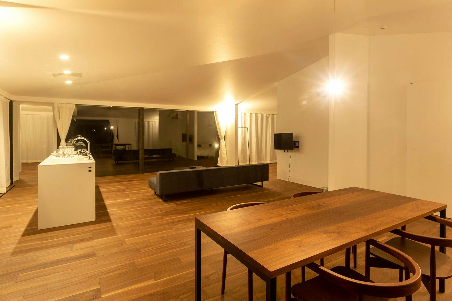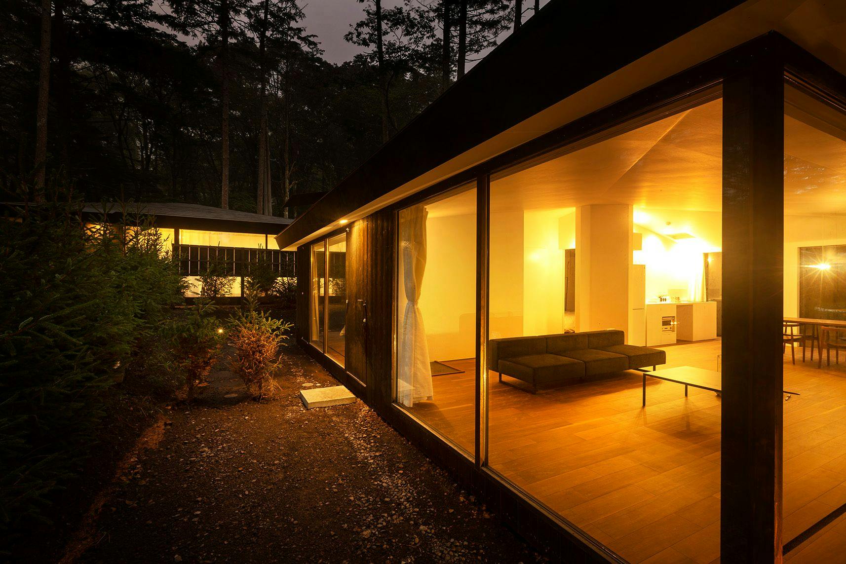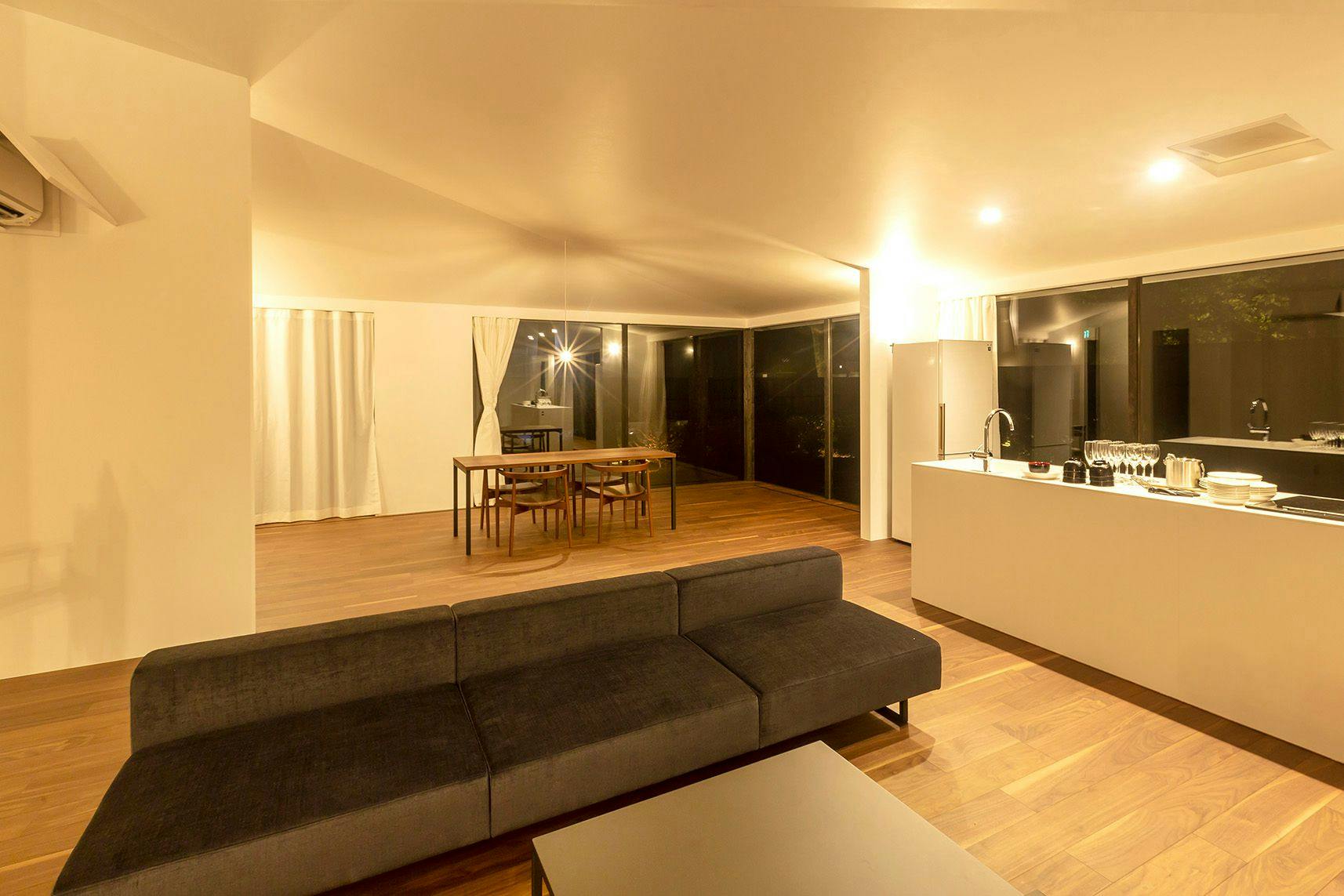 夜はガラスの壁が鏡のようにリビングルームを映し出すため、