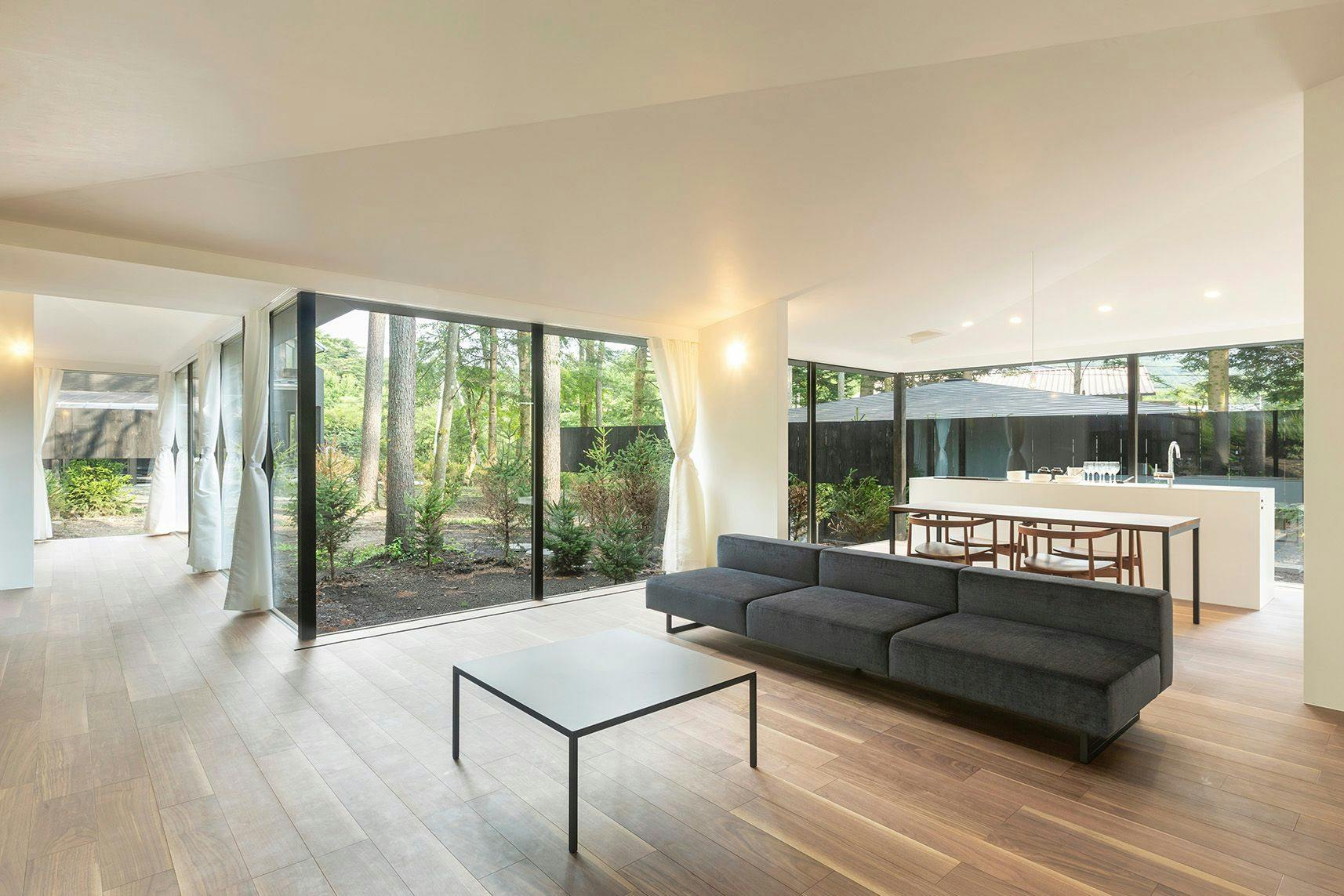 リビングルームのソファから眺めるプライベートなお庭が開放的です。