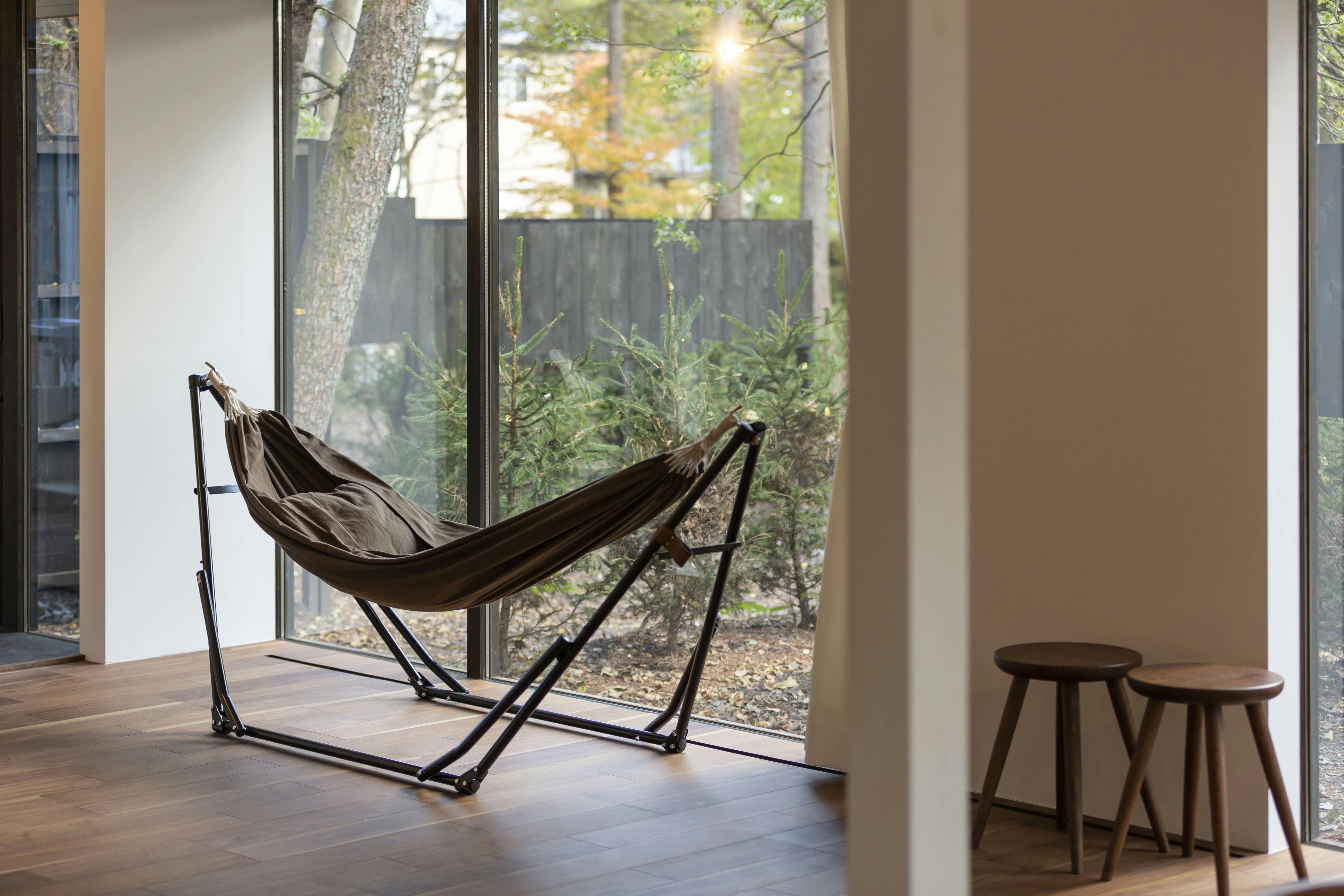 お部屋にあるハンモックから軽井沢の森を眺めながら、