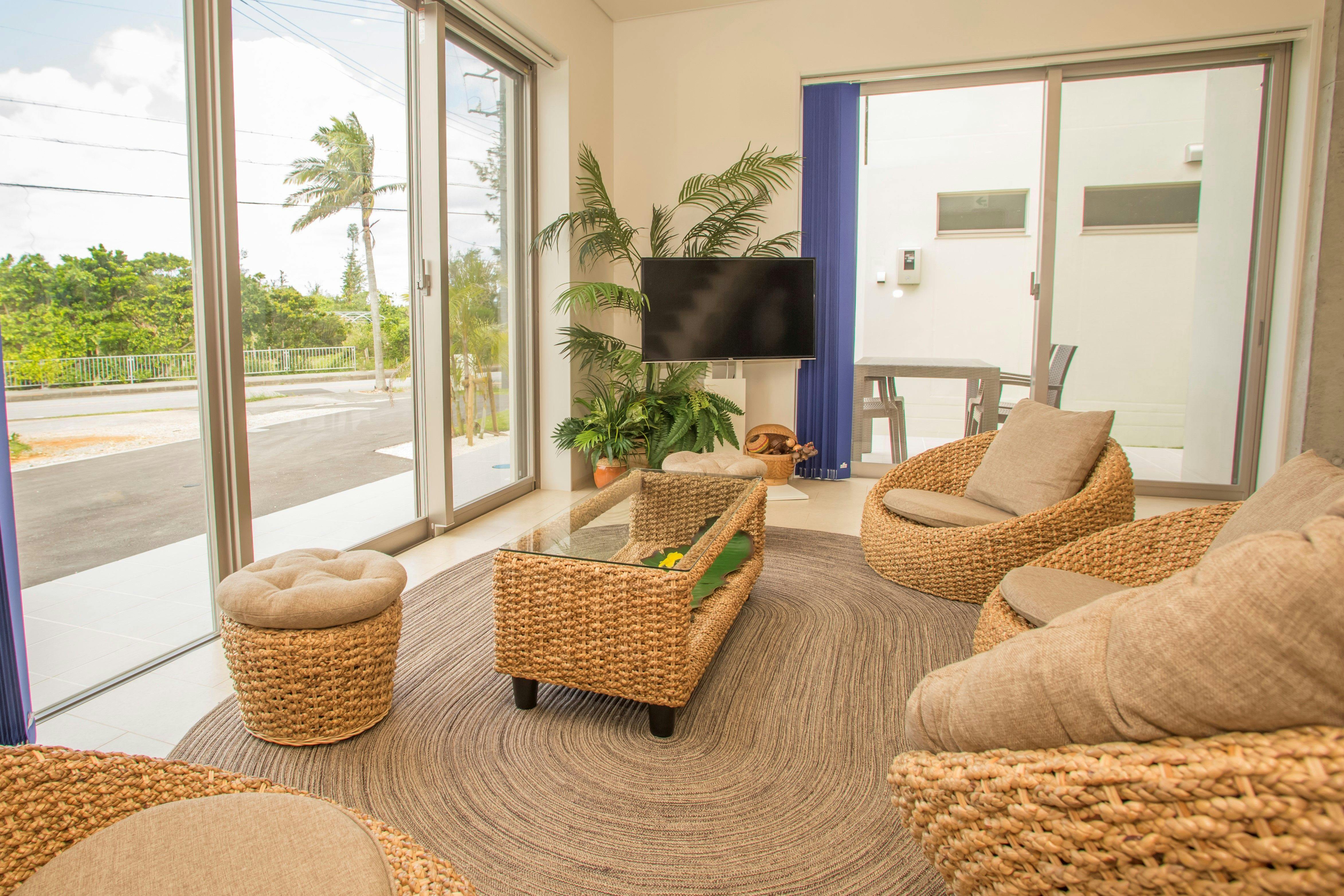 「1日1組限定」のプライベートヴィラです。ヴィラは、2階建ての2LDK(120平米)で駐車場1台完備してございます(敷地内)沖縄でも人気の観光スポットの「青の洞窟」まで車で6分で行くことができます。ヴィラから徒歩5分のところには隠れ家ビーチ(宇加地ビーチ)もあります。人は少ないですが、海の透明度はとっても高くてすごく綺麗なのでおすすめです ヴィラには2階にバルコニーで日光浴ができるようにビーチベッドを置いてますので是非ご利用ください!暖かい空気は感じたいけど直射日光は避けたいなぁという方は、1階の屋根付きテラスでお過ごしいただけます。テラスではBBQ(雨天でも)もできますし、ハンモックに寝そべりながら心地よい風にあたるのはとても気持ちがいいです。室内にはchromecastを設置してますので、夜は大画面のテレビで映画を見たり、お昼間はお子さん向けの動画などをNetflixやAmazonPrimeのアプリから見ることができます。ご旅行の方はもちろん、島にプチ移住や別荘をご検討中の方にも住むように滞在することができる空間づくりを心がけています。海外ビーチリゾートとは一味違う沖縄の素敵な島時間をお過ごしください。※BBQについてはご予約の際にお問い合わせお願いいたします。
