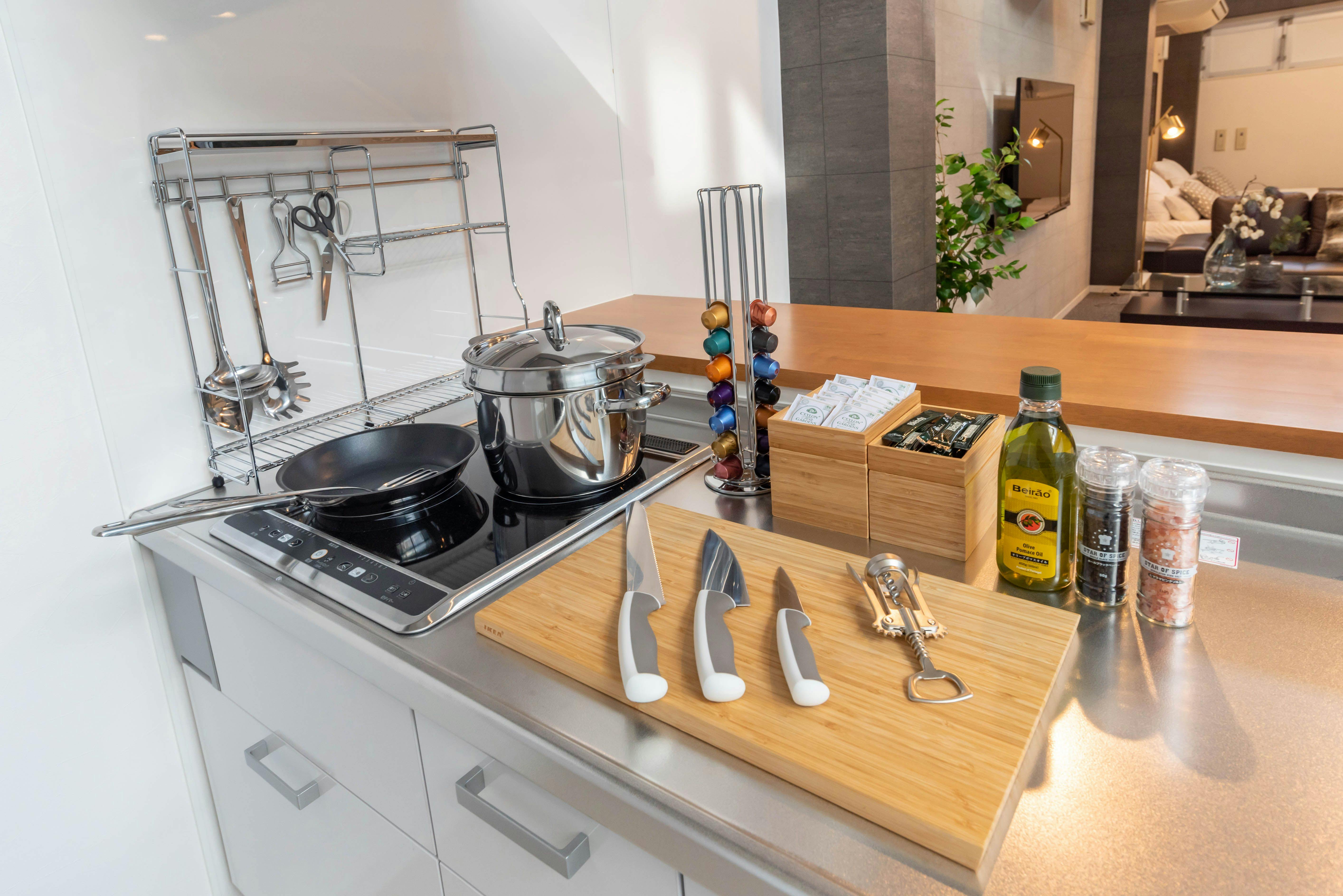 手前にはキッチンがあり、基本的な調理器具と調味料(塩・胡椒・オリーブオイル)がご自由にお使いいただけます。コーヒーマシンもございますので、本格的なコーヒーがいつでもお楽しみいただけます。