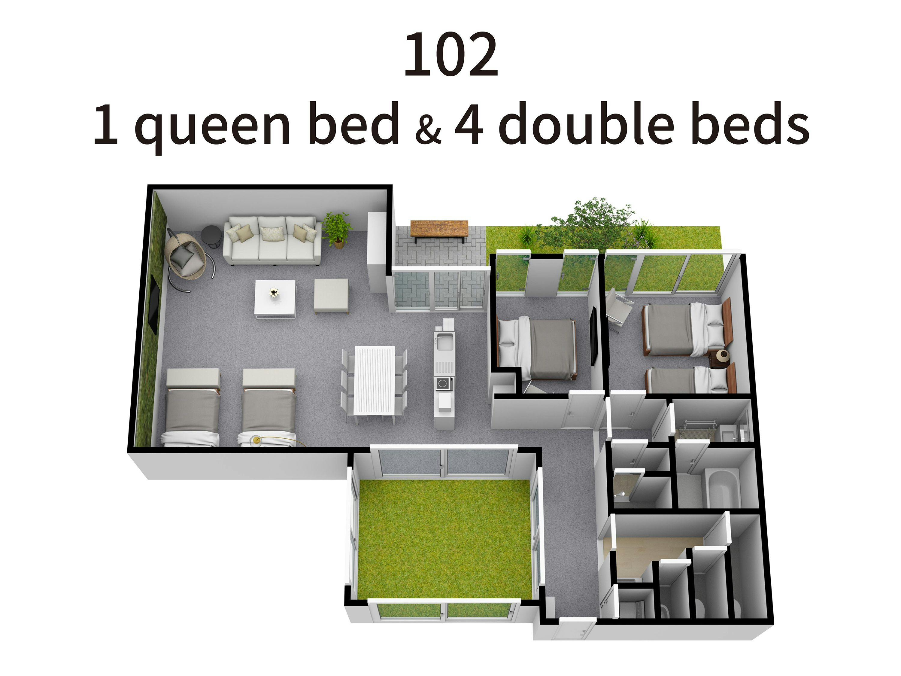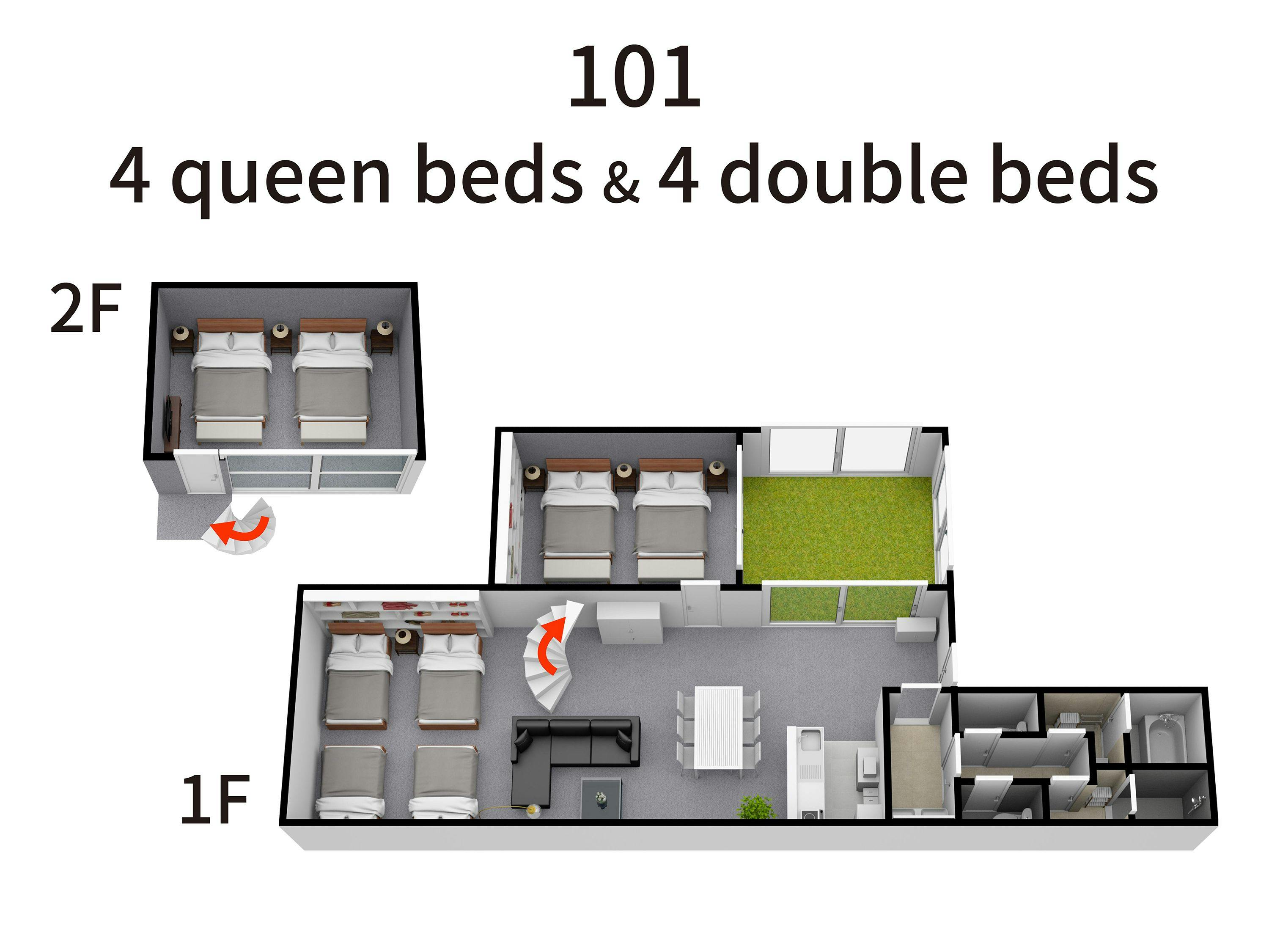 リビング&ダイニングの奥にダブルベッド4台のスペース、また中庭に面してクイーンベッド2台の寝室、螺旋階段を上がった2階部分にもクイーンベッド2台の寝室がございます。