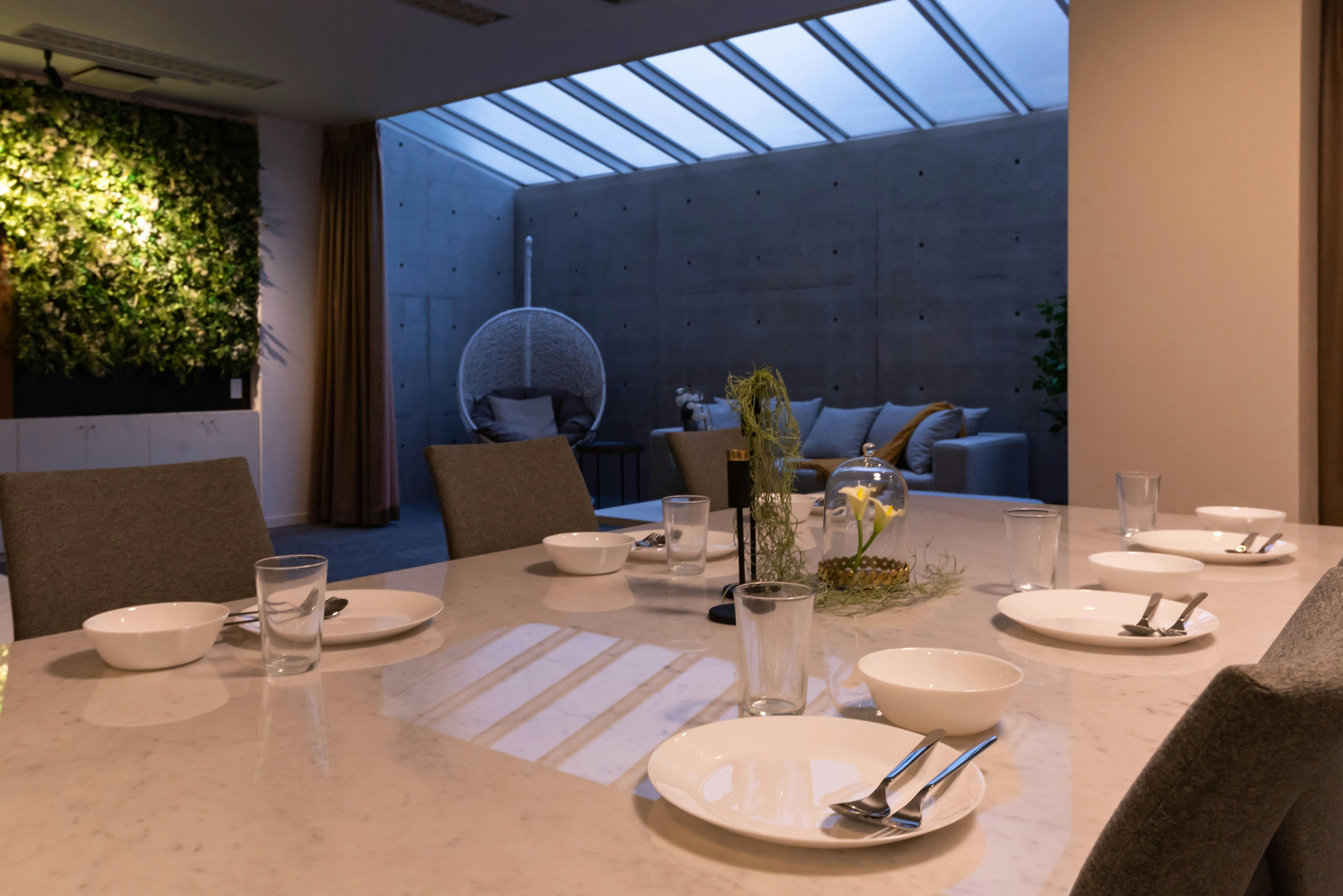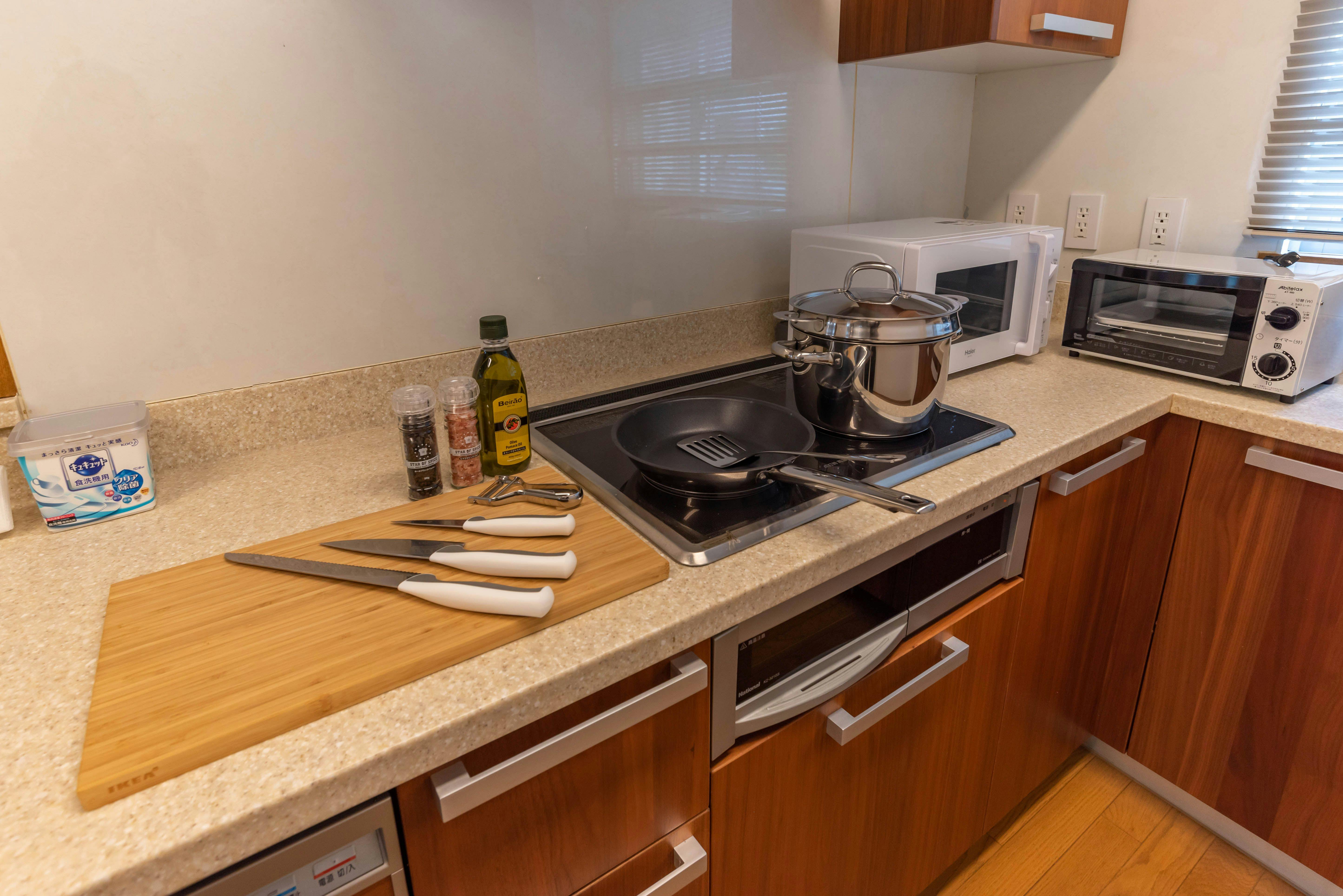 リビング沿いにキッチン&ダイニングと小上がりの畳のスペースがございます。キッチンでは基本的な調理器具と調味料(塩・胡椒・オリーブオイル)がご自由にお使いいただけます。コーヒーマシンもございますので、本格的なコーヒーがいつでもお楽しみいただけます。