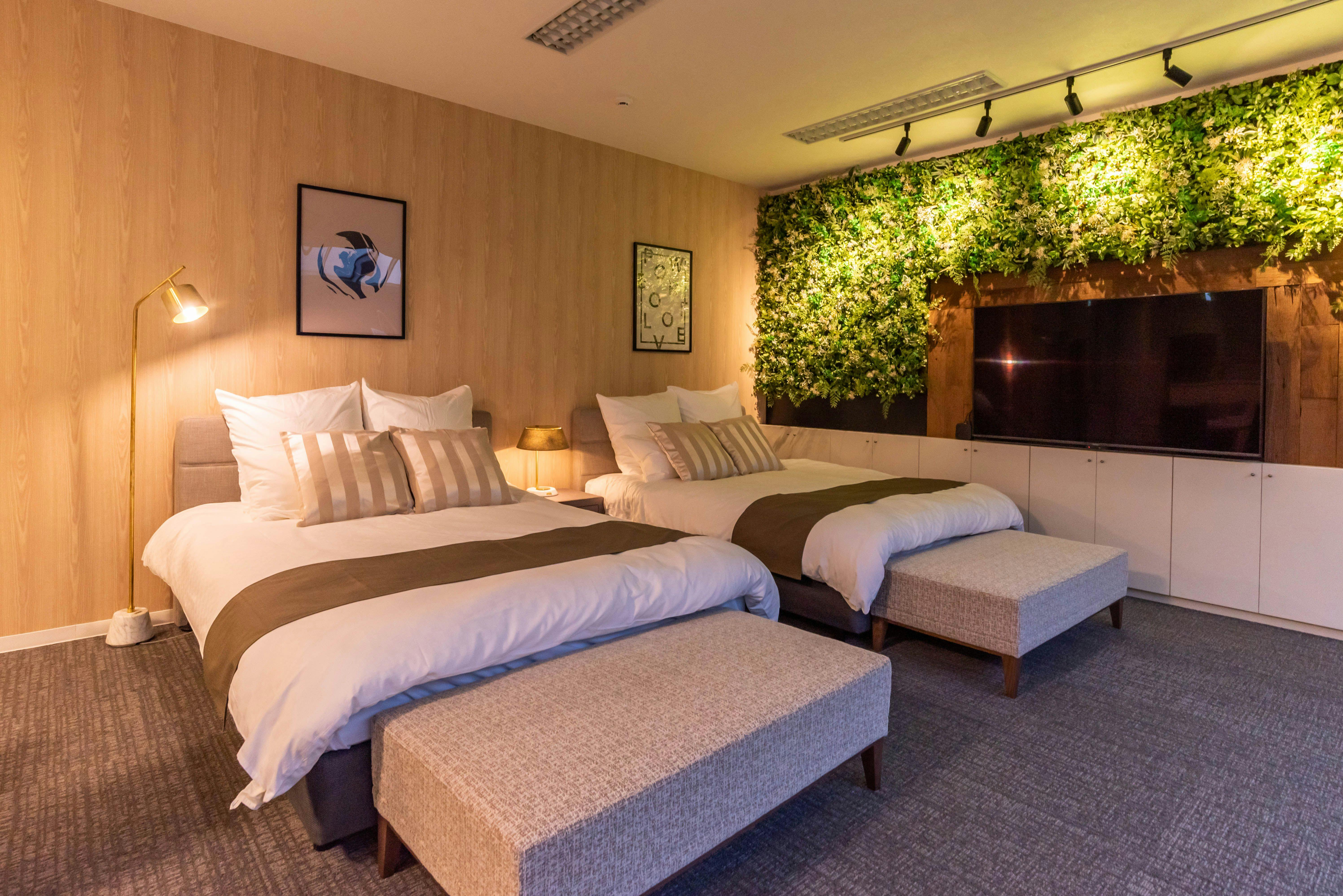 ダイニングの奥にダブルベッド2台のスペースがございます。ベッドは世界的に有名な寝具メーカー「シモンズ」を使用しております。