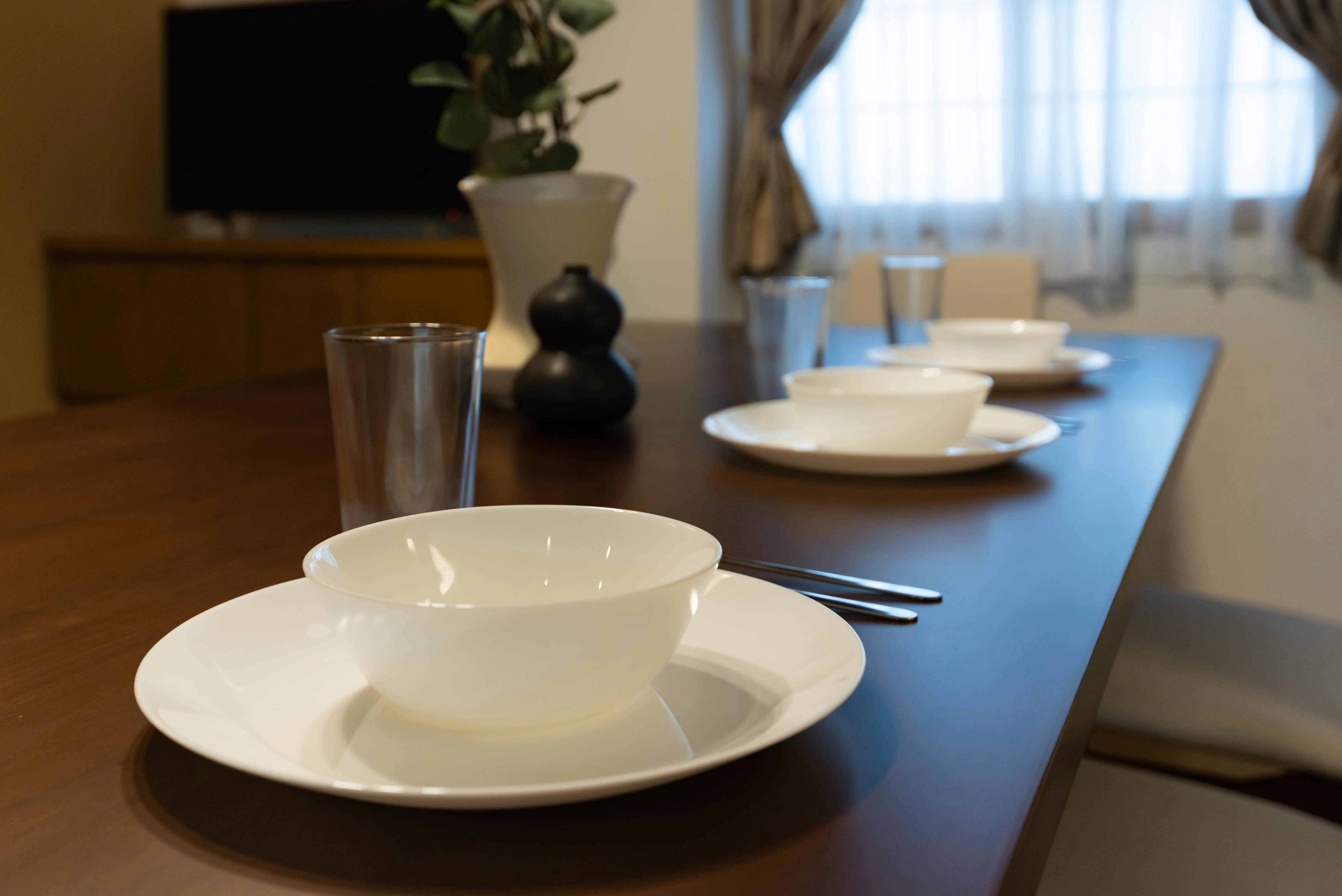 廊下を曲がるとダイニング&キッチンです。キッチンでは基本的な調理器具と調味料(塩・胡椒・オリーブオイル)がご自由にお使いいただけます。コーヒーマシンもございますので、本格的なコーヒーがいつでもお楽しみいただけます。