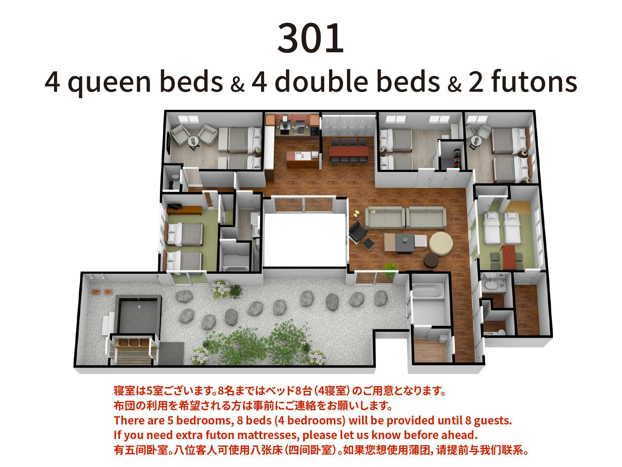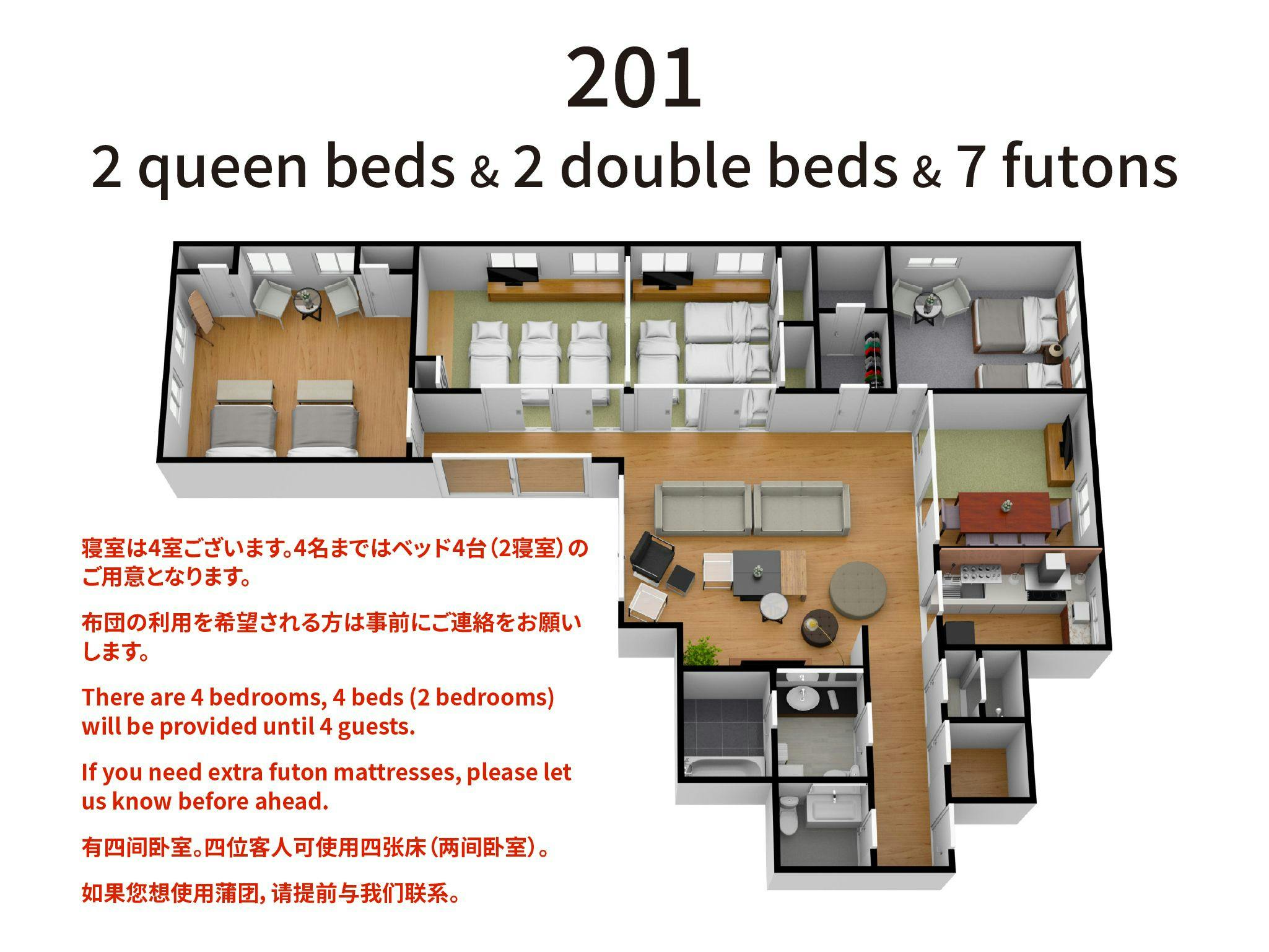 リビングに面して、2組の布団を敷いていただける和室、クイーンベッド2台の寝室、ダブルベッド2台の寝室がございます。