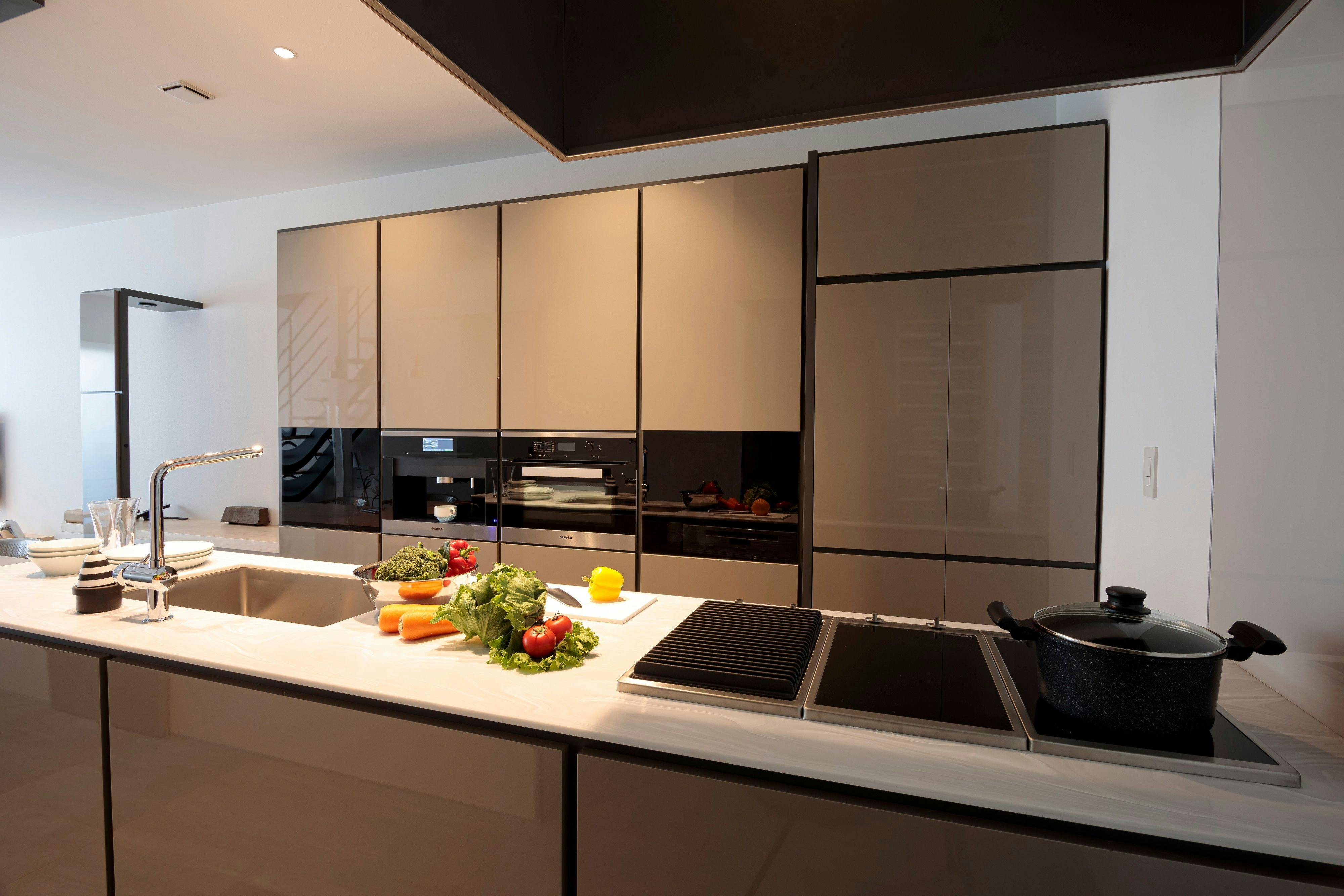 入室してすぐ目につくペニンシュラキッチンはガンメタリックの鏡面仕様となっており、MAGIS(マジス)のダイニングチェア、Miele(ミーレ)のIHやレンジ、コーヒーマシーンを取り揃えております。Arflex(アルフレックス)のソファはモールドウレタンを採用しました。