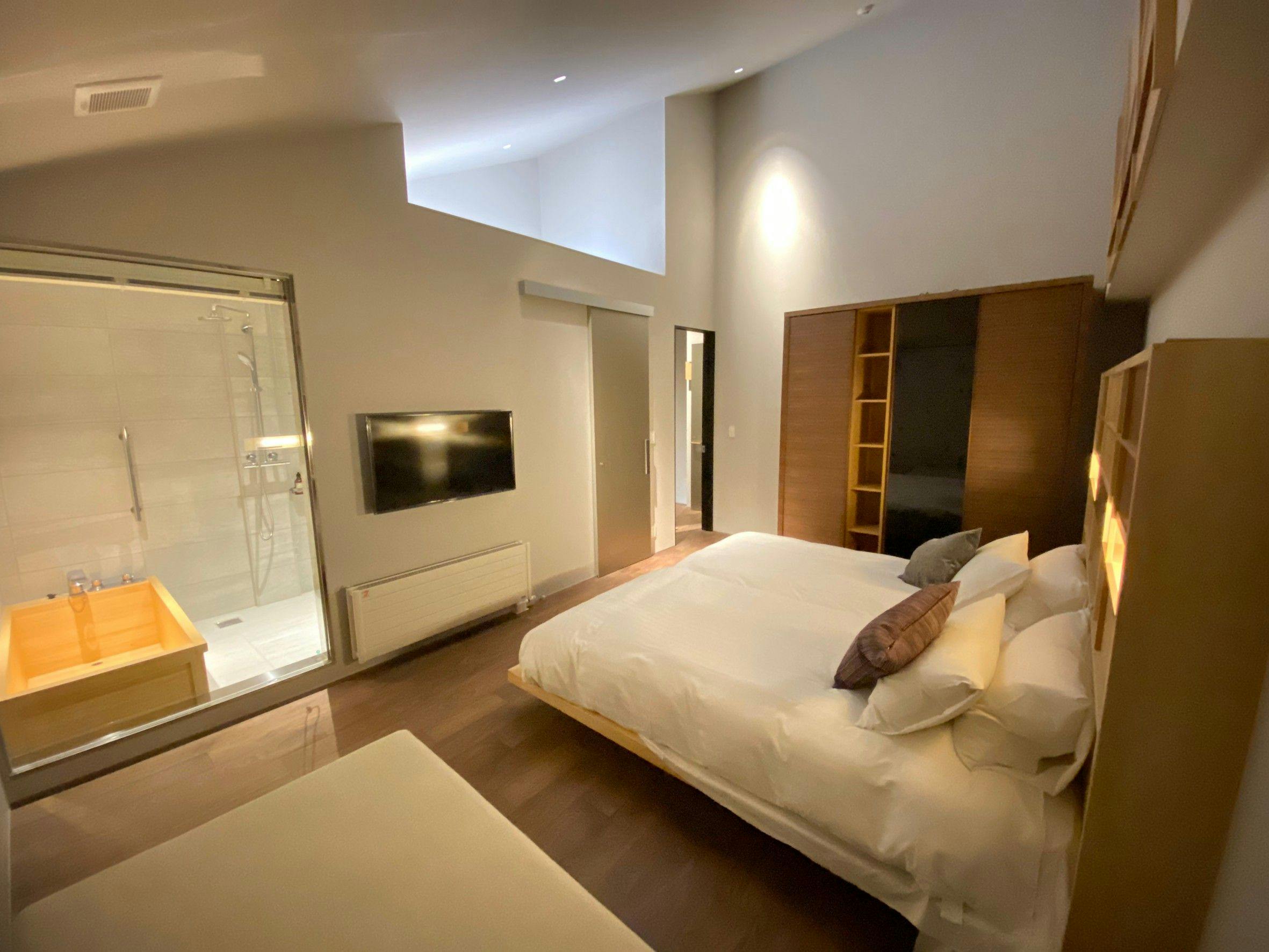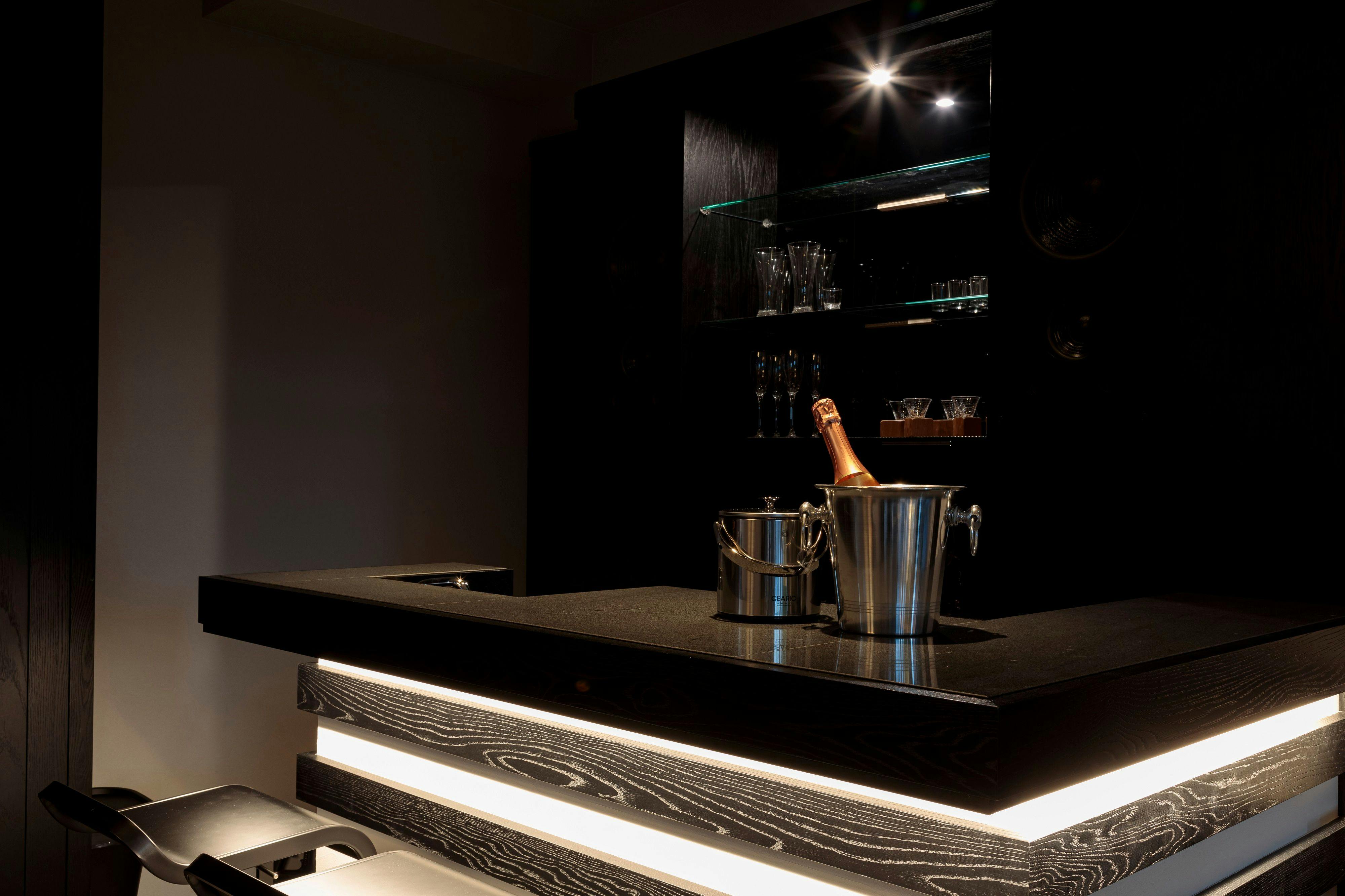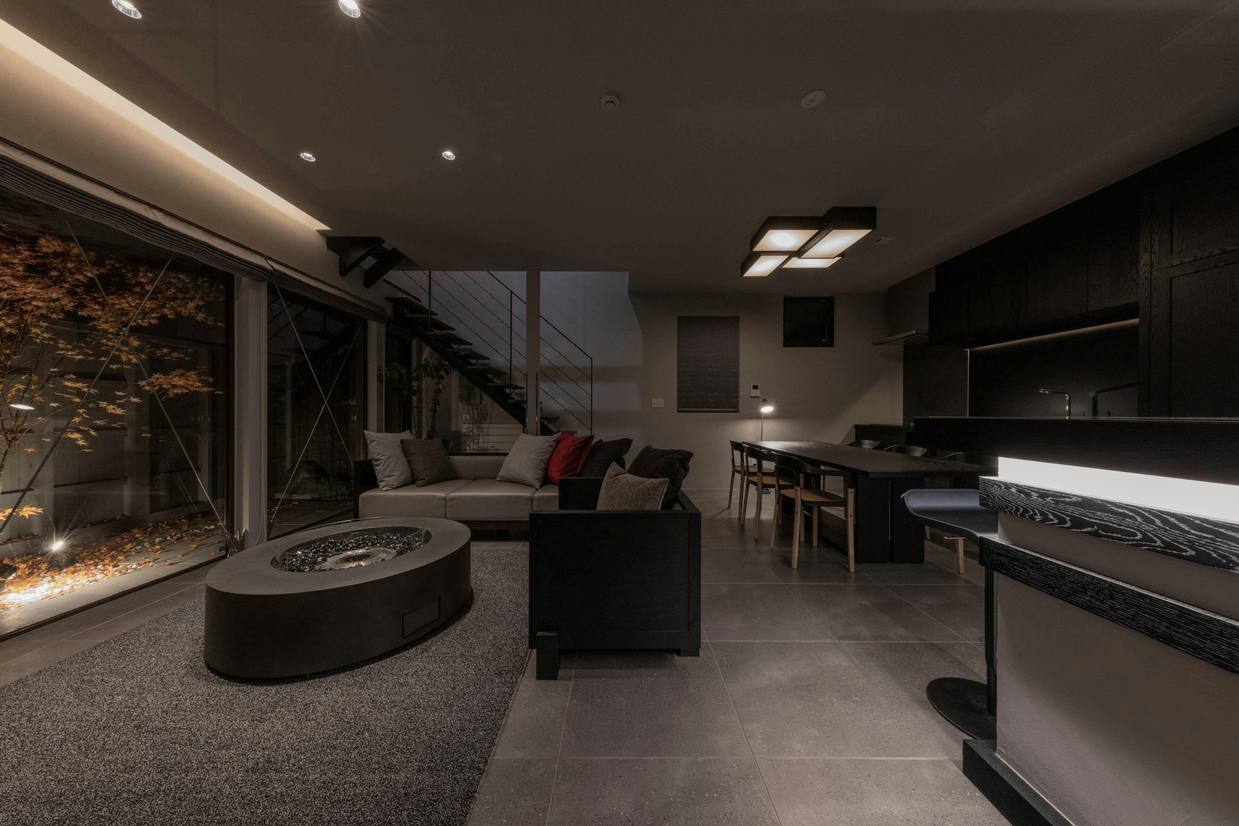 黒を基調としたこのお部屋は、大人の滞在を実現させます。石造りのバーカウンターとMAGIS(マジス)のハイスツールで上質な夜のひと時をお楽しみください。バーカウンター後ろにはスピーカーも設置しております。広々としたうづくり加工のキッチンテーブルとMAGIS(マジス)のキッチンチェアで、最大6名様がゆったりとお食事をしていただけます。BALMUDA(バルミューダ)のオーブンレンジはこのお部屋のみの備え付けですので、ぜひお食事をアレンジしてみてください。シックなレザーソファの横には、ラウンド型のエコスマートファイヤー「ARK40」を設置しました。
