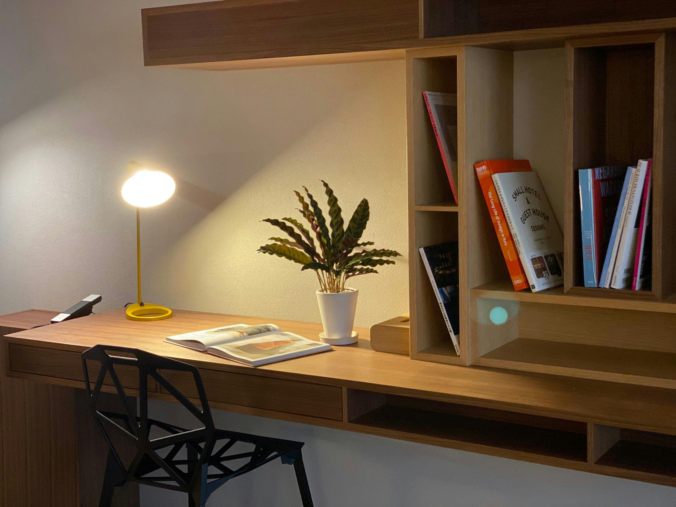 6部屋の中で一番大きいこのお部屋は、オークとウォールナットを基調とした温かな雰囲気を感じられます。読書をお楽しみいただけるCassina(カッシーナ)の本棚とlouis poulsen(ルイスポールセン)の照明を設置しました。ソファの背にも本棚を設置し、遊びゴゴロも加えました。キッチン台にはセラミック素材を惜しみなく採用し、ダイナミックな隠し戸に冷蔵庫を設置しています。階段から2階を見上げると開放的な高さの天井に、印象的な壁飾りがご覧いただけます。
