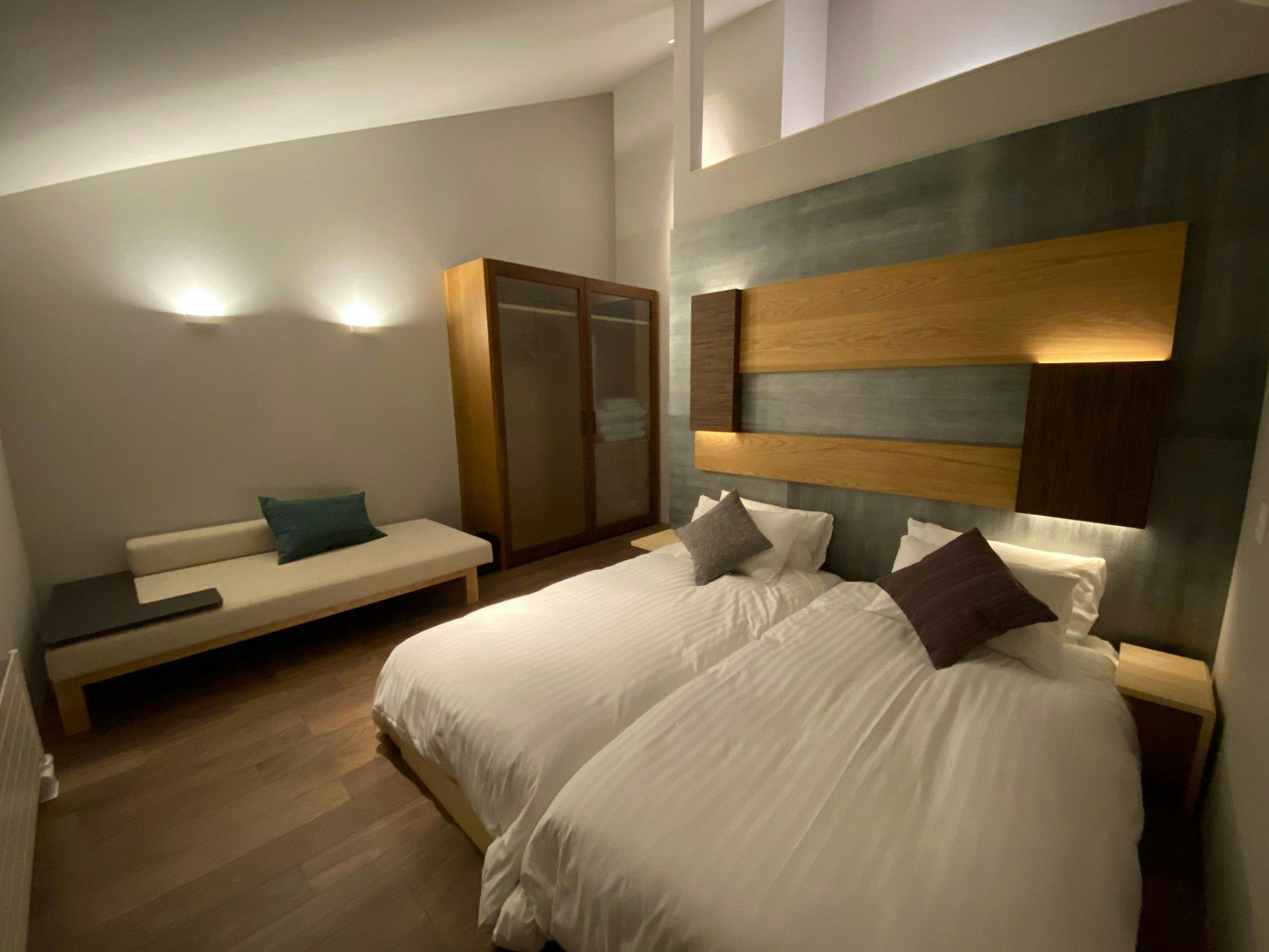 2階にはベッドルームが2部屋あり、それぞれハリウッドツインで2名ずつお使いいただけます。石をイメージした収納台を開くと、テレビとテーブルとしてお使いいただける機能的なデザインを採用しました。楓の木材を敷いた明るい色味の床と上品なゴールドに塗装したドアが、ベッドルームを暖かな雰囲気にします。
