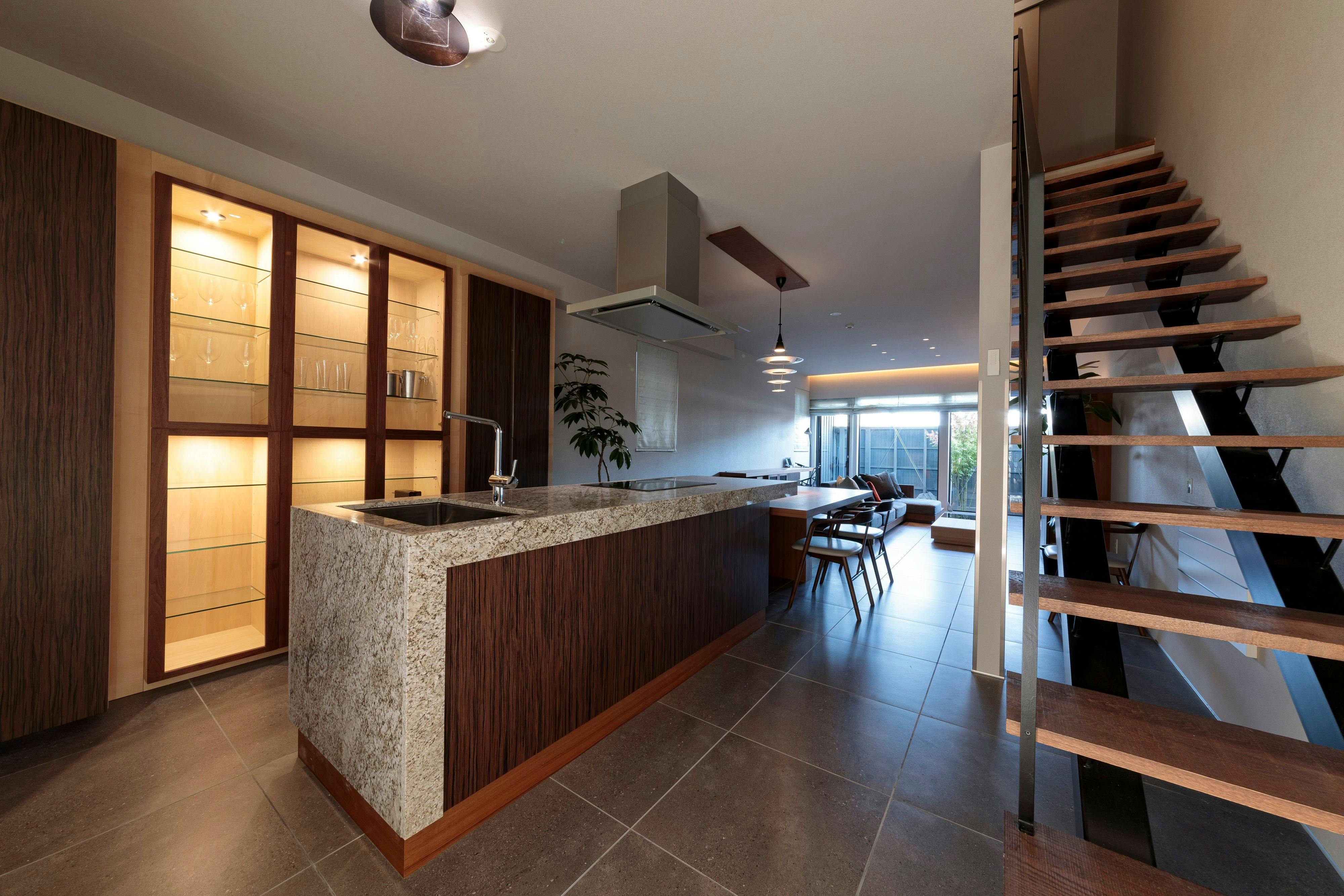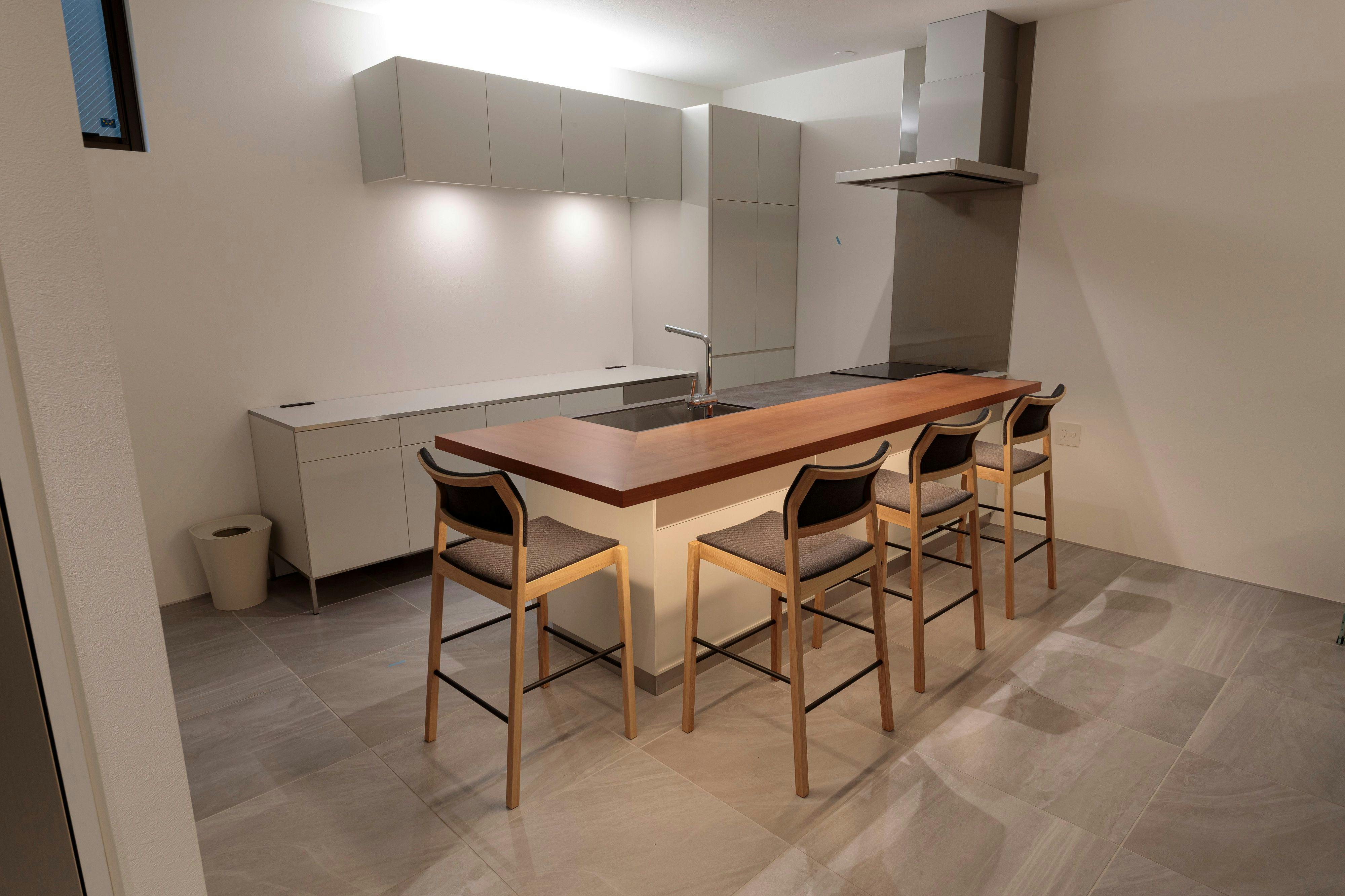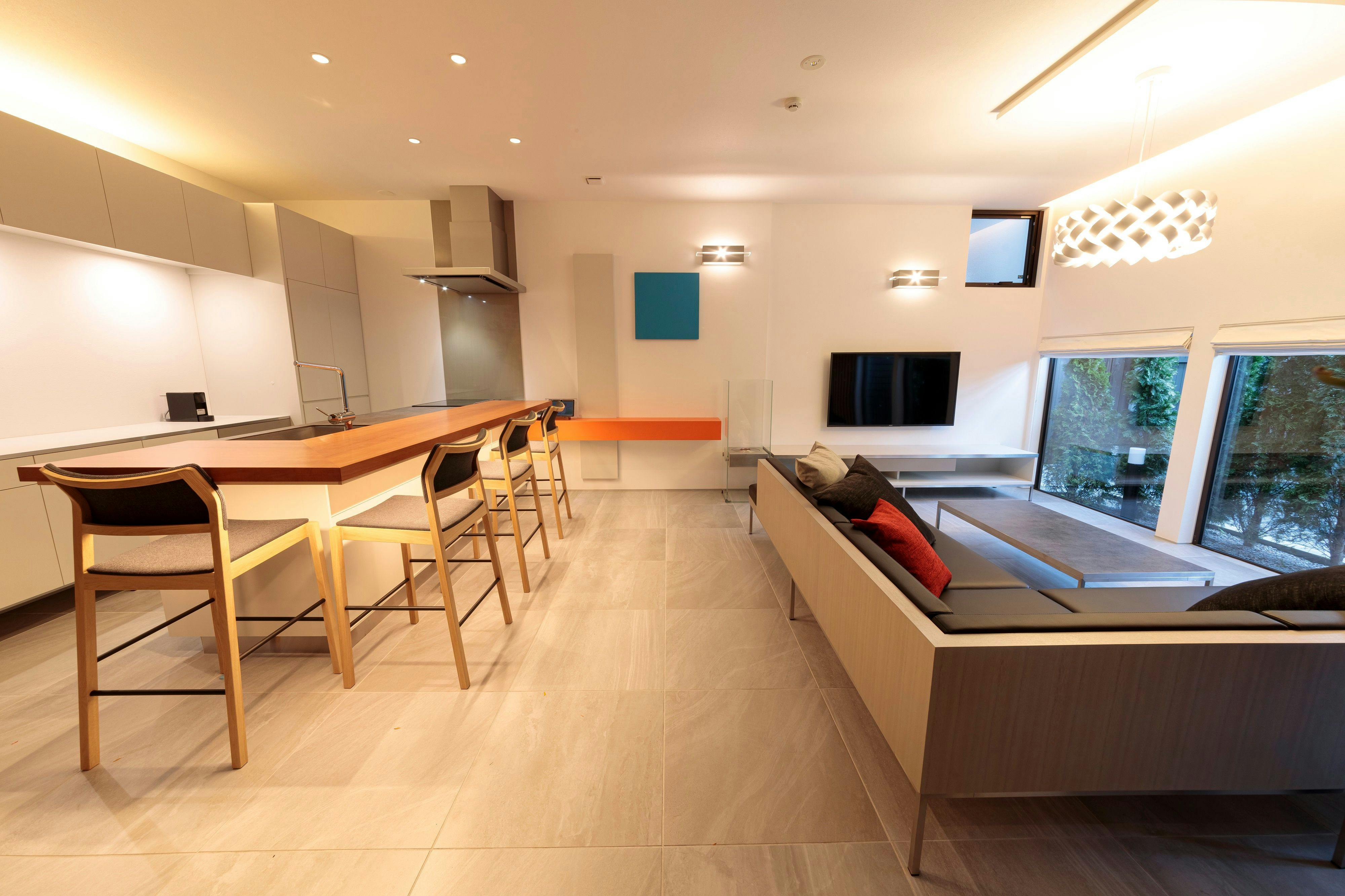 リビング一面の窓から差し込む日の光と、こだわりの照明がお部屋を照らします。ダイニングテーブルとキッチン台はセラミック素材のものを設置しています。キッチンカウンターは椋(むく)材の継ぎ目を大胆にカットしたデザインで、ハイスツールは旭川家具・匠工芸のAG bar stoolを4脚ご用意しました。階段横には唯一の自転車を置く為のスペースがあり、階段を見上げると鏡面仕上げを施した新月をイメージした階段照明が昇っております。