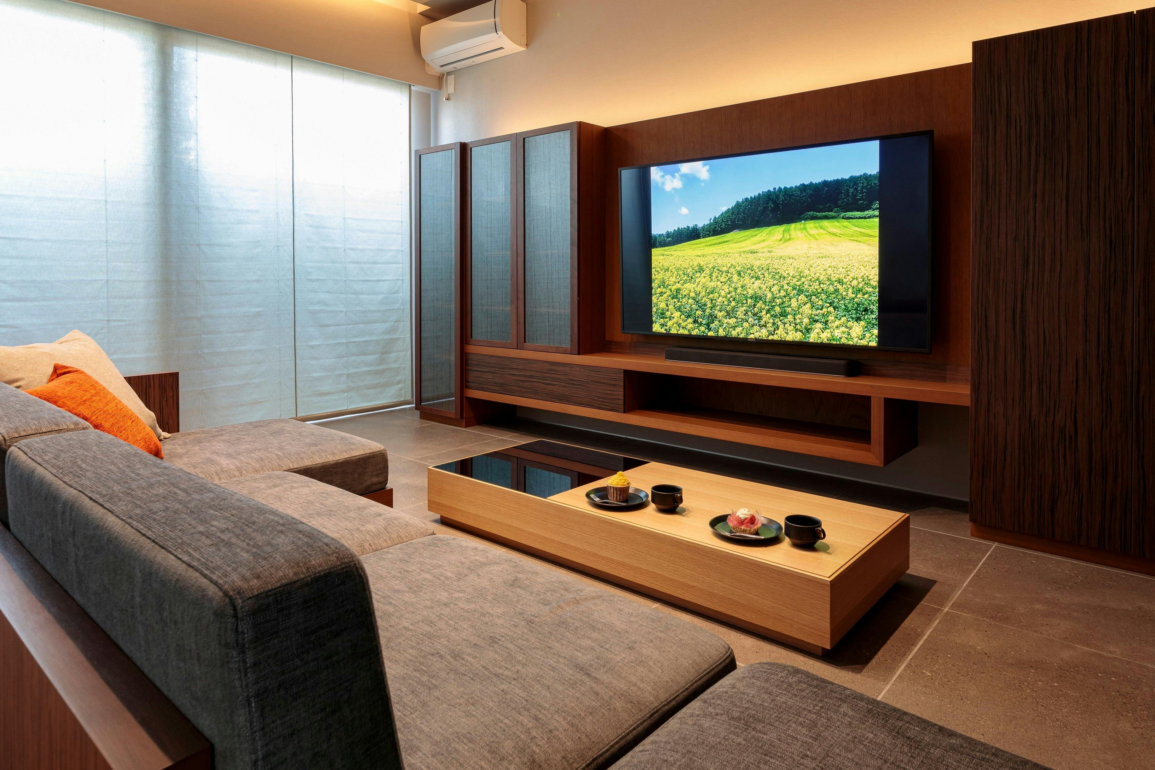 ふらので撮影した写真、今まで撮りためた写真、思い出の写真を大切な人と寄り添いながら大画面で鑑賞する、心温かな時間。そのひと時を石の温かさ感じるタイルと木肌温もる家具たちが、静かに見守ります。