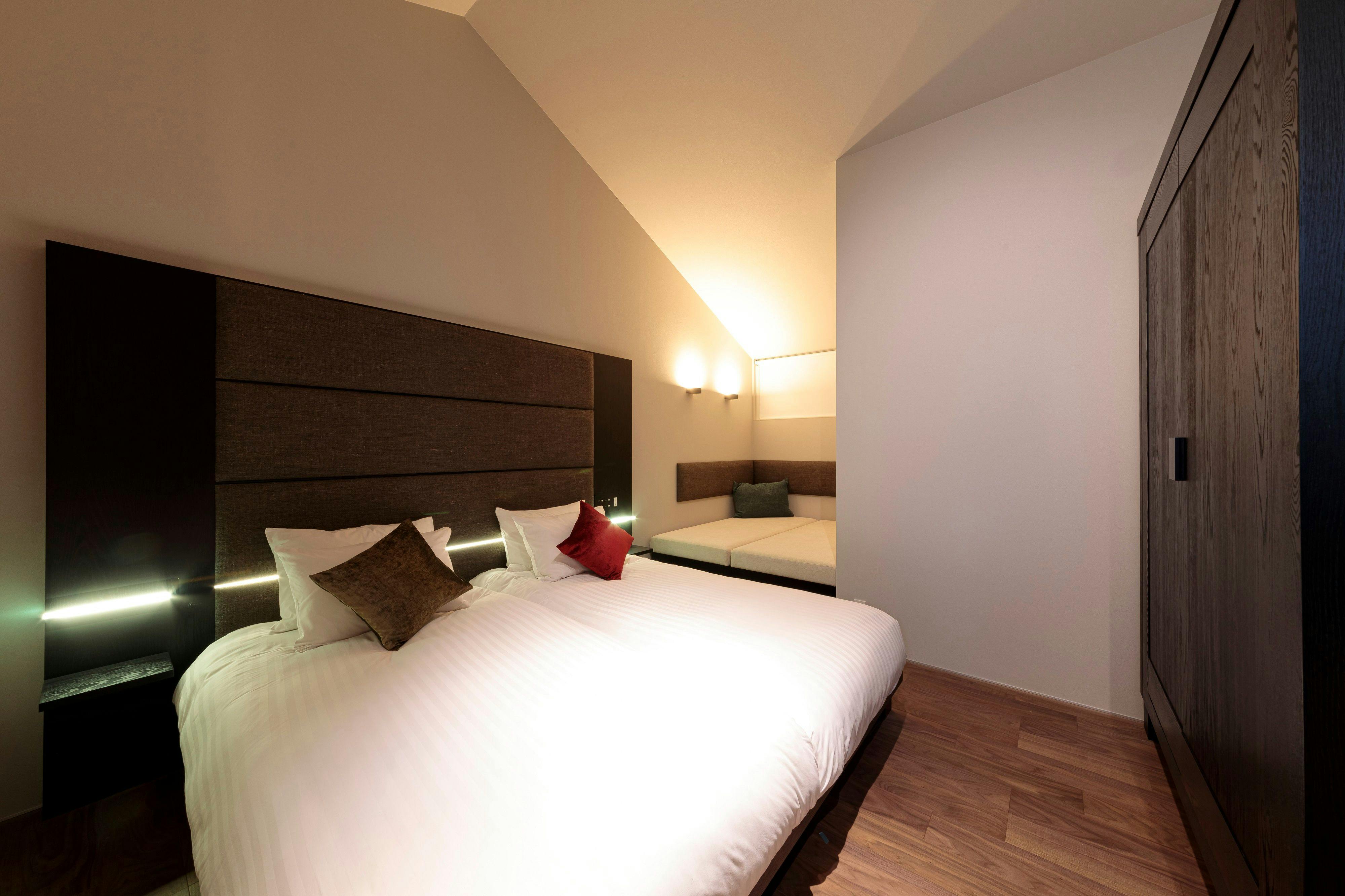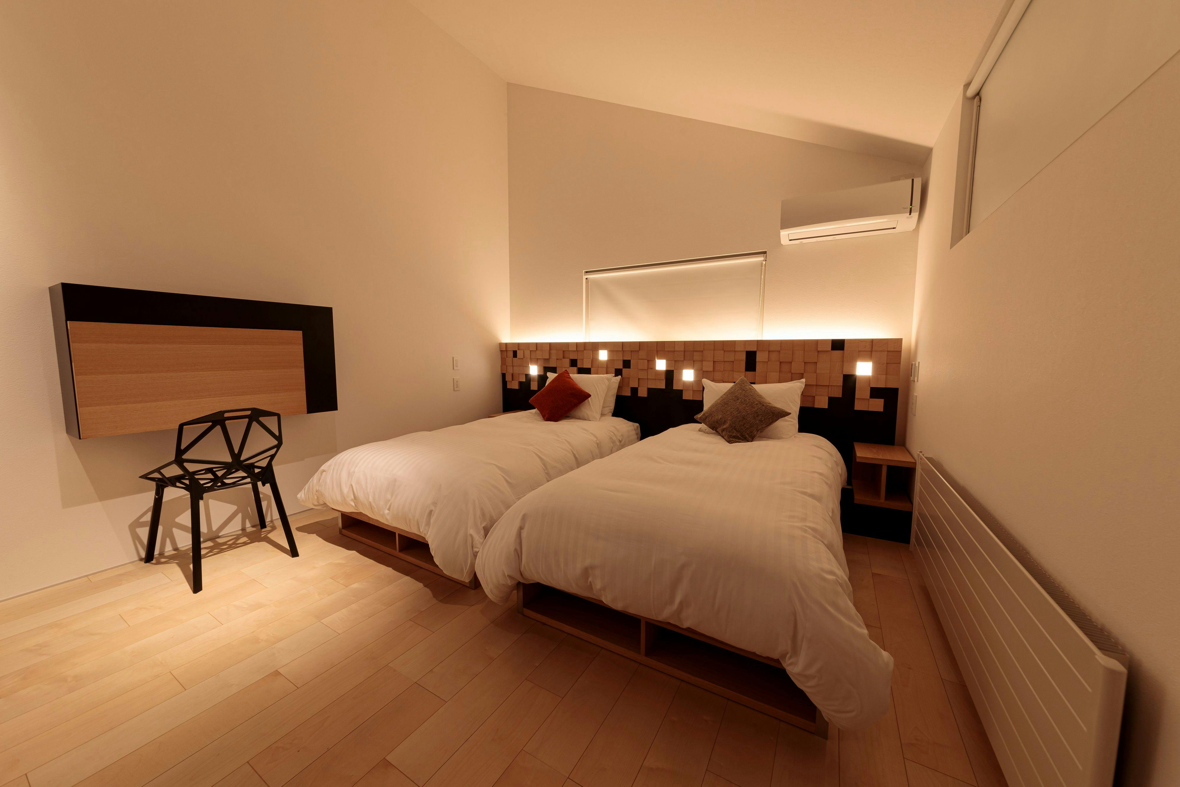 2階にはベッドルームが2部屋あり、ハリウッドツインタイプのベッドと、ソファベッドを利用すると最大3名ずつお使いいただけます。ヘッドボードはゴールドとシルバーに染色した桐材を張り付け、その上にジャパニーズシダーとウォールナットを使用したデザインのものをあしらいました。