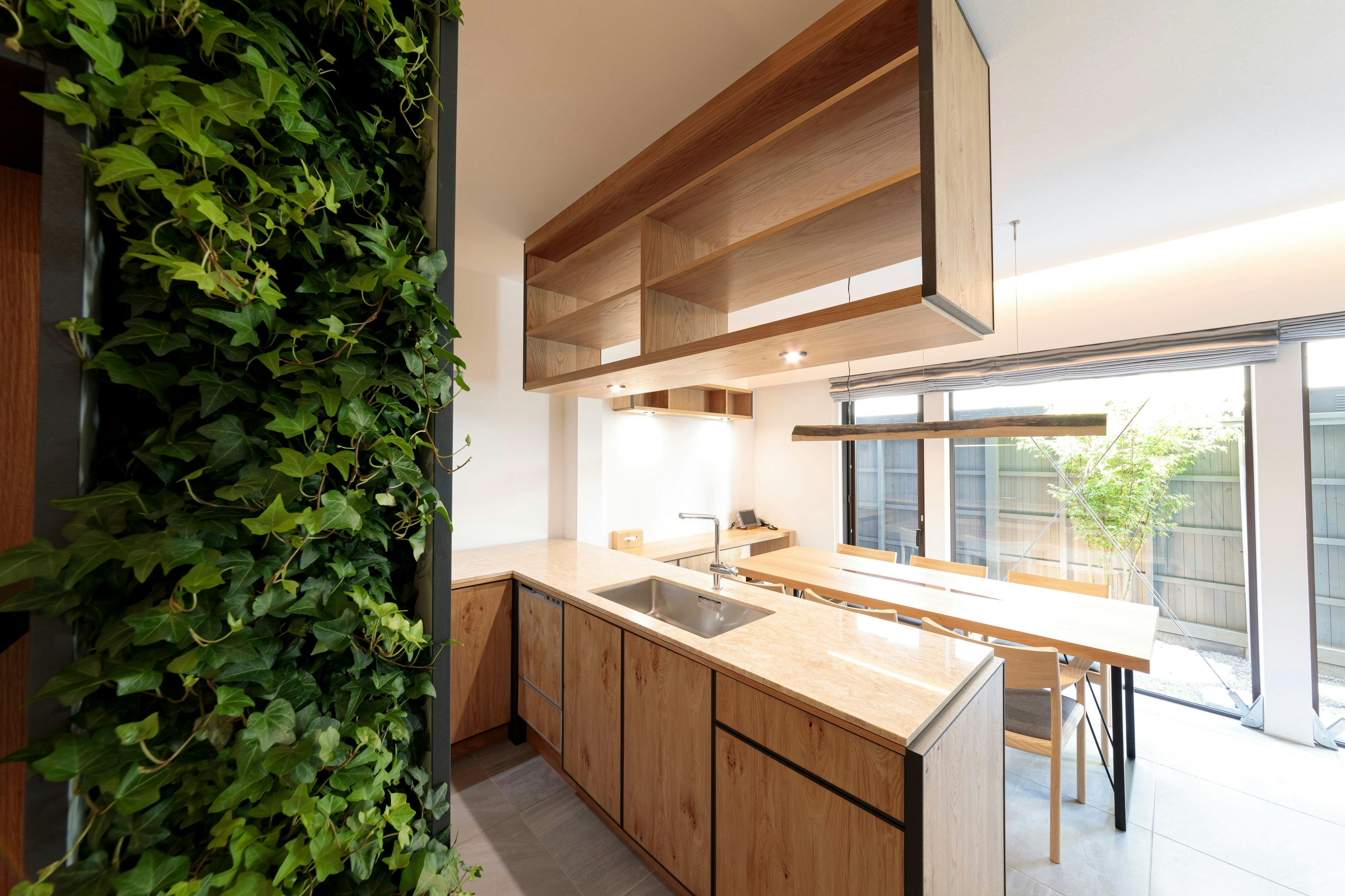 壁面植物が印象的なお部屋です。サンセベリアとアイビーをあしらいました。リビングには大きなアイアンスチールの棚をそのまま壁に、Minotti(ミノッティ)のソファを中央に設置いたしました。大理石と木目調のキッチンは大地を彷彿とさせる色味で暖かい印象です。ダイニングテーブルは椋の一枚板をレンジで調節し、それを照らす照明も丸田をくり抜いた大胆なオリジナルデザインです。ダイニングチェアも石邸富良野のこのお部屋のためだけにデザインしていただきました。