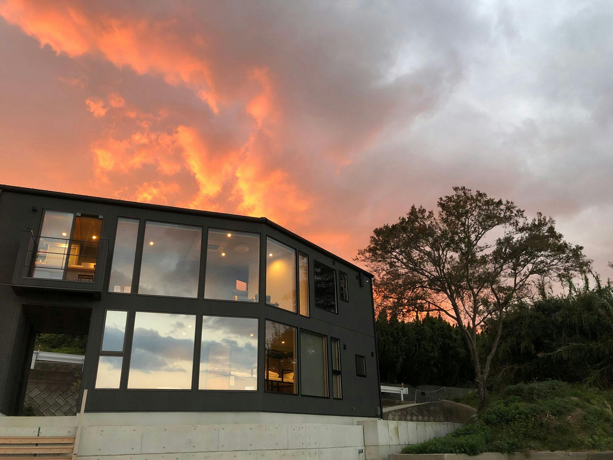 【瑠璃色の空と藍緑の海に映える墨色壁の総二階建てオーシャンフロントヴィラ】