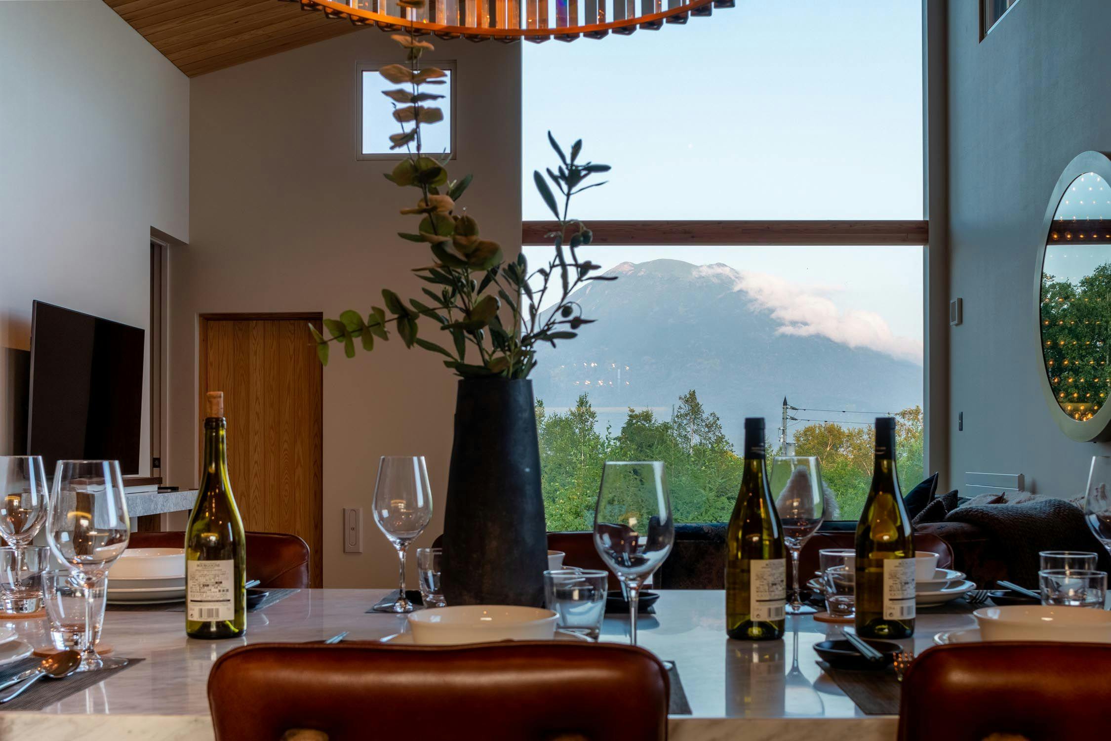 2階の広々としたリビングキッチンからは羊蹄山とニセコの自然が一望できます。夏はさわやかな風と鳥のさえずりが聞こえ、冬は雪景色が楽しめる特別なプライベート空間です。