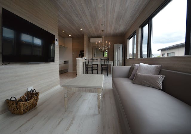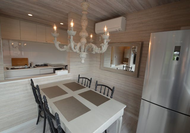 寝室のベッドは高級ホテルでも使用されているシモンズを使用しています。お布団は全て西川の高級羽毛布団となりますので、快適に睡眠を取ることができます。リビングには高級ソファAlflexのレザーソファやシャビーシックな高級ダイニングセット、照明等、普段の生活ではできないおしゃれでラグジュアリーな気分を体験できます。
