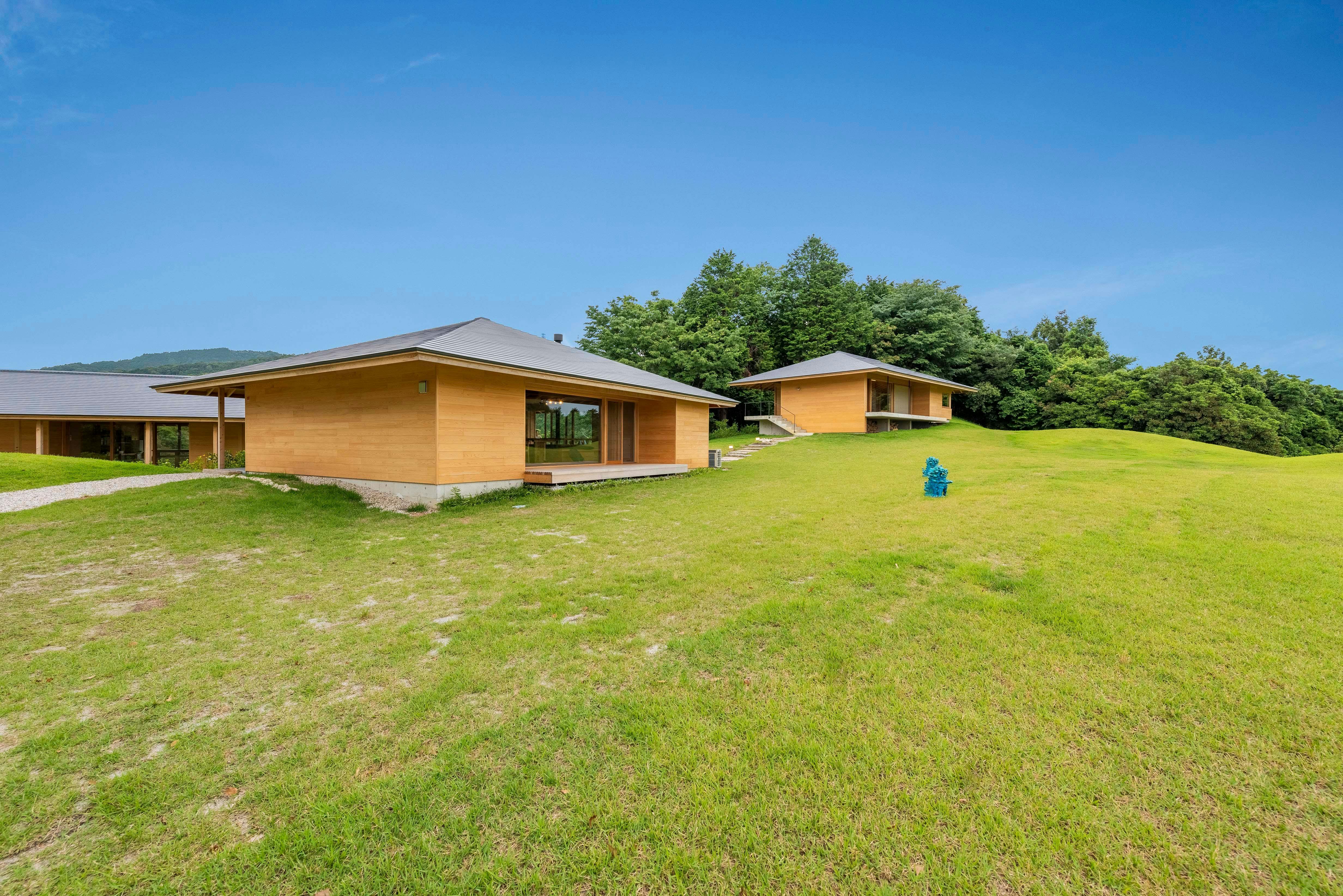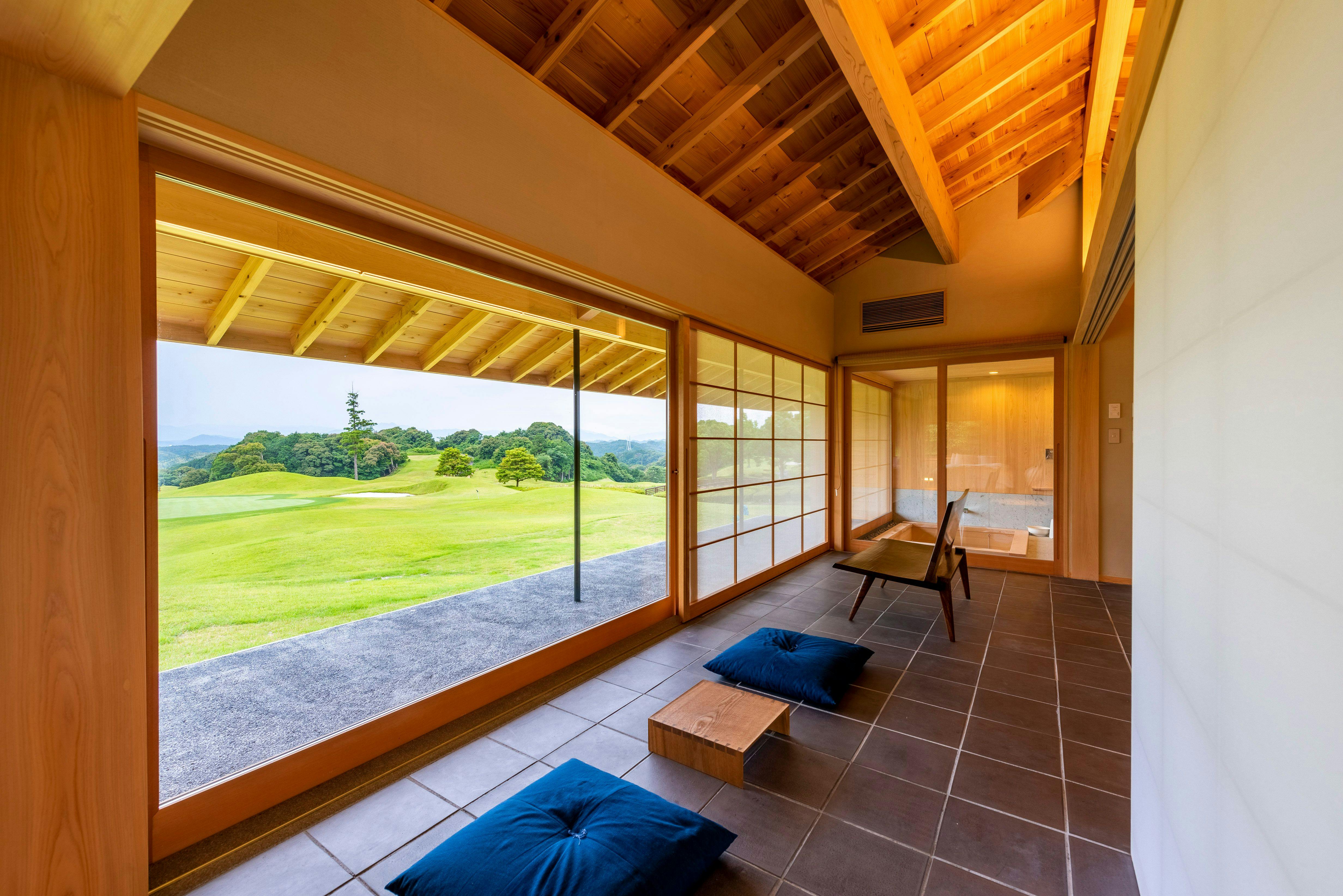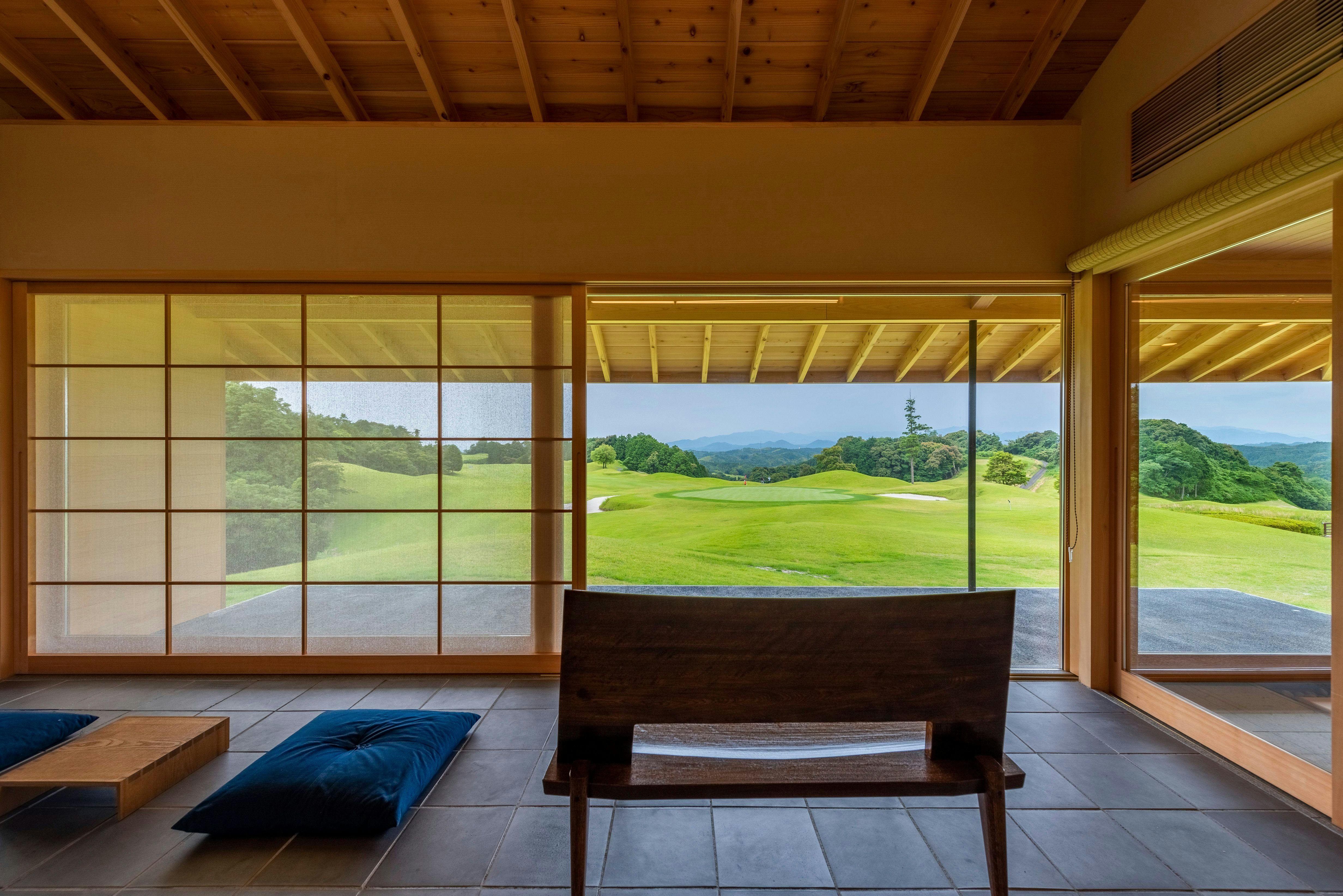 スルーザグリーンで過ごせる語らいとくつろぎ、食楽のアコモデーション。目の前にはグリーン、裏には里山を望む抜群の眺望。山からも海からも心地よい風が吹き抜けるロケーションです。