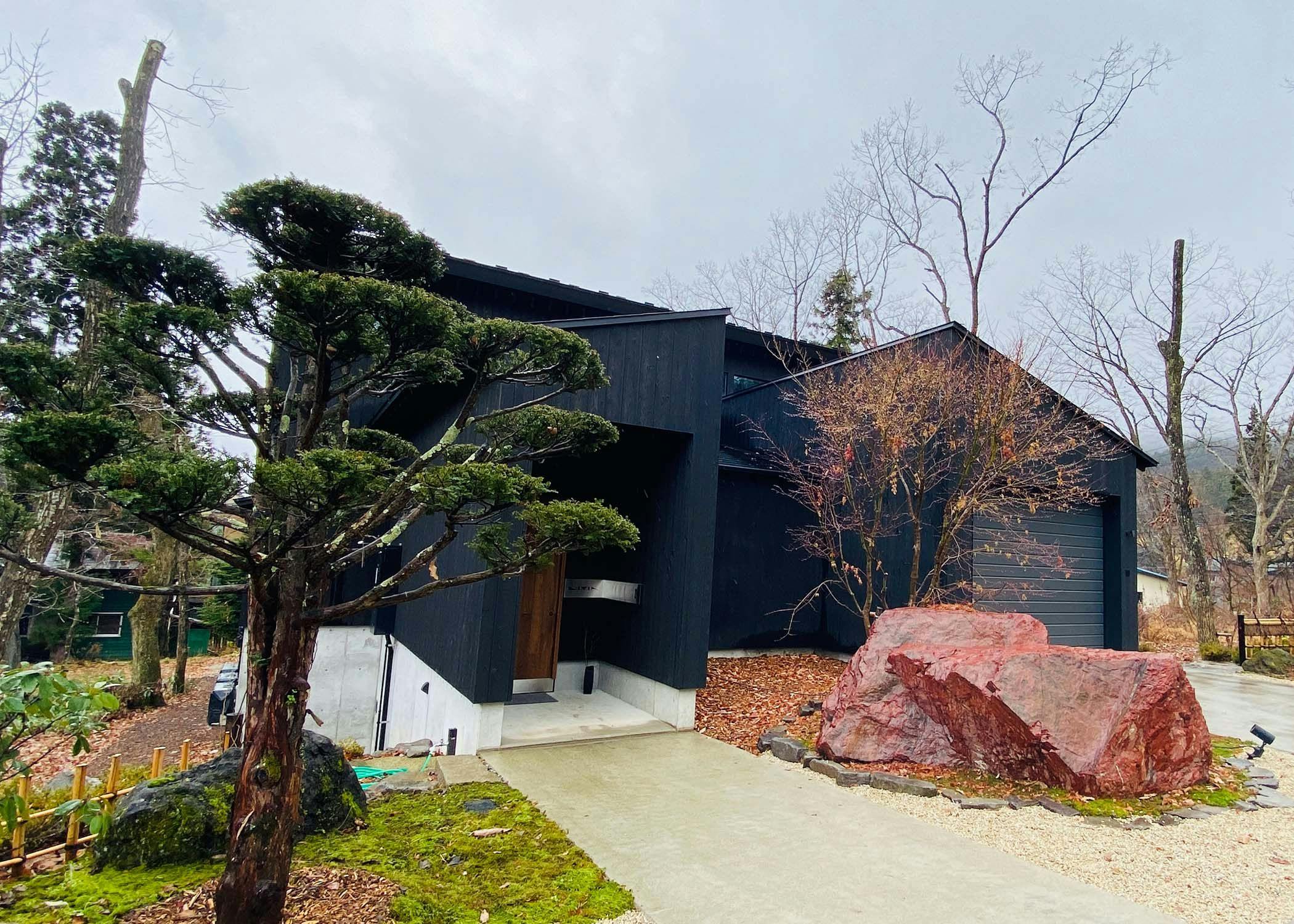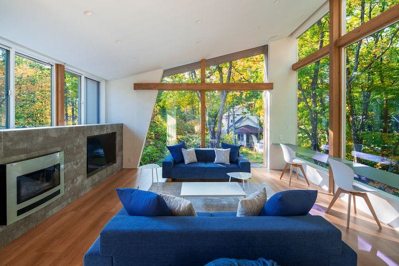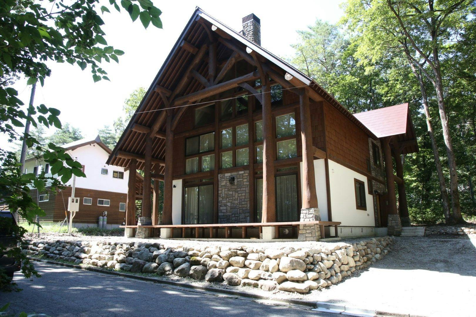 エコーランド地区のメインエリアから徒歩約5分の好立地にある高級貸別荘「白馬三山リゾート」。 四方の大きな窓と異国の雰囲気を醸し出すガス暖炉がある広々としたリビングが贅沢なステイを演出。