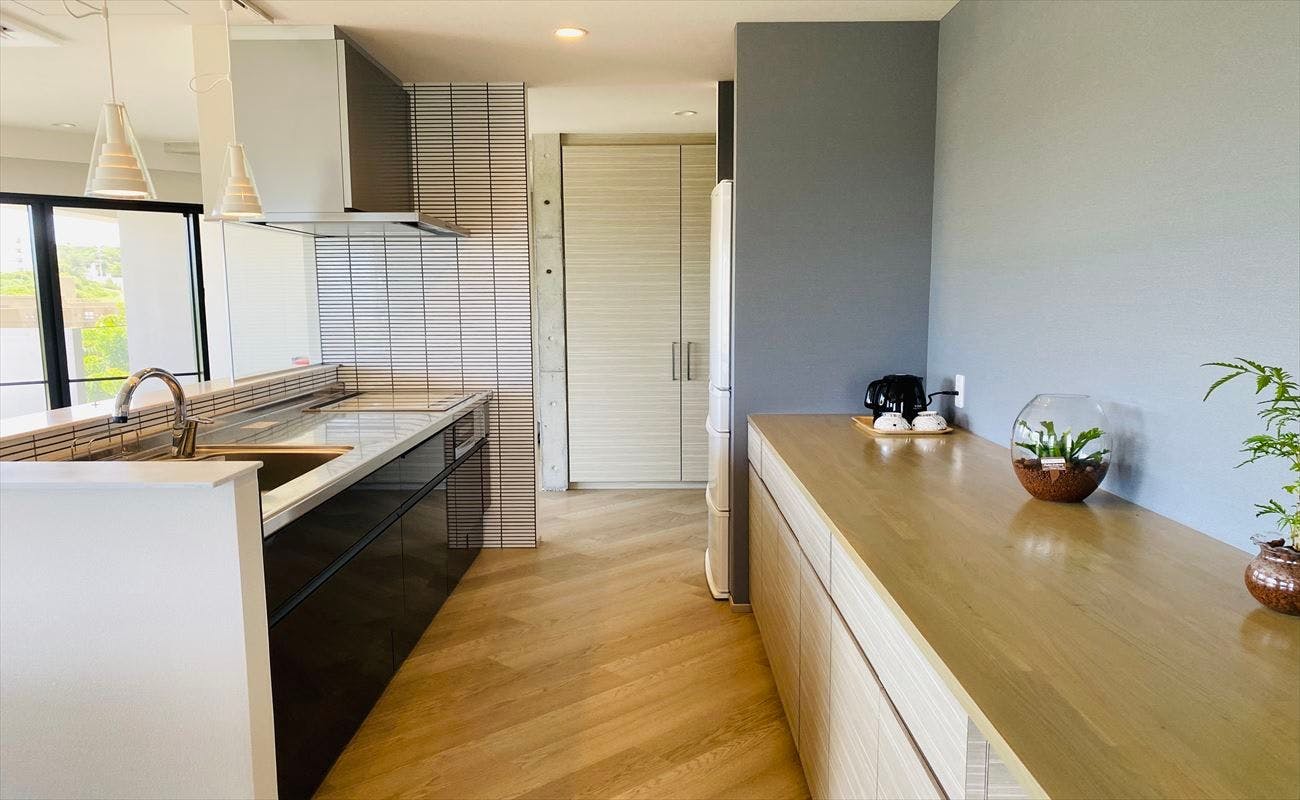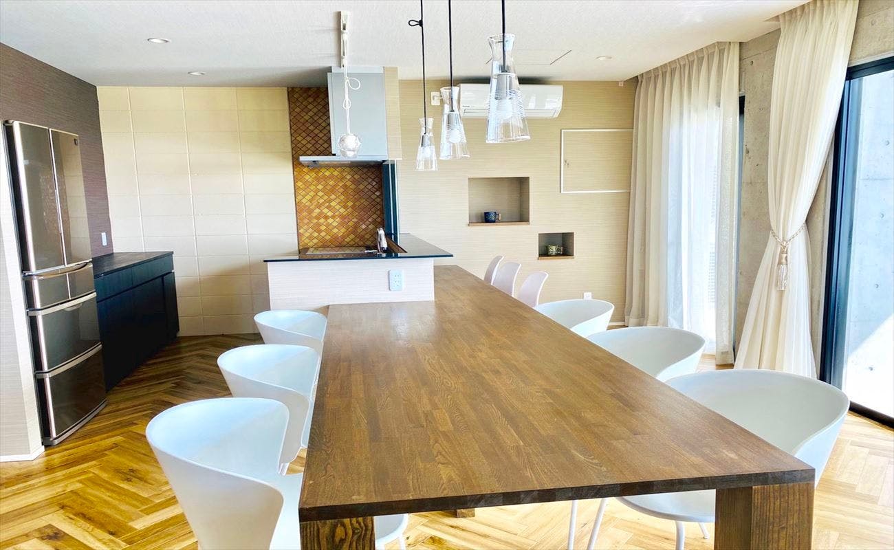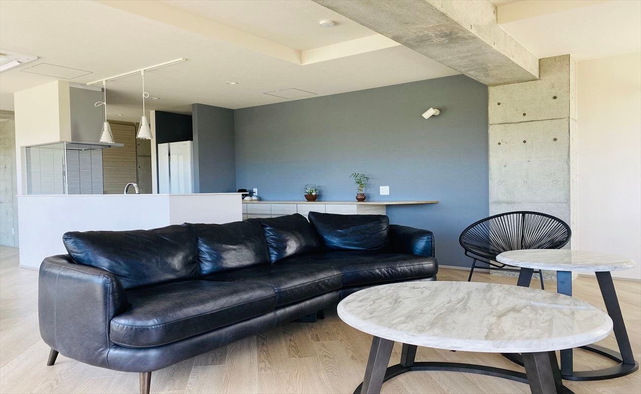 冬のお部屋。グレーとホワイトを基調としたシックな内装デザイン。ベッドルーム3室。バスルーム2室。長期滞在用にウォークインクローゼットも完備。広々としたオープンテラスには温水ジャグジー完備。バーベキュー(別途ガスグリルレンタル)もお楽しみいただけます。