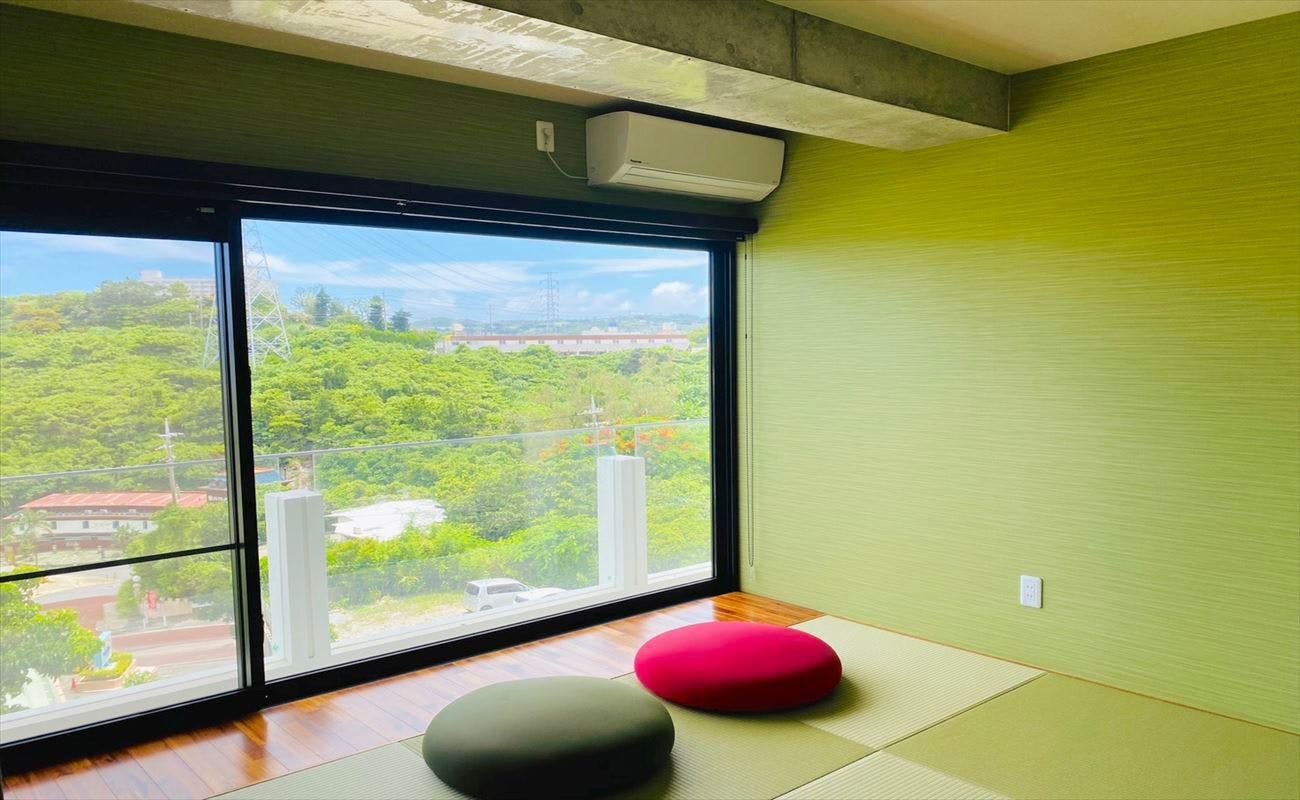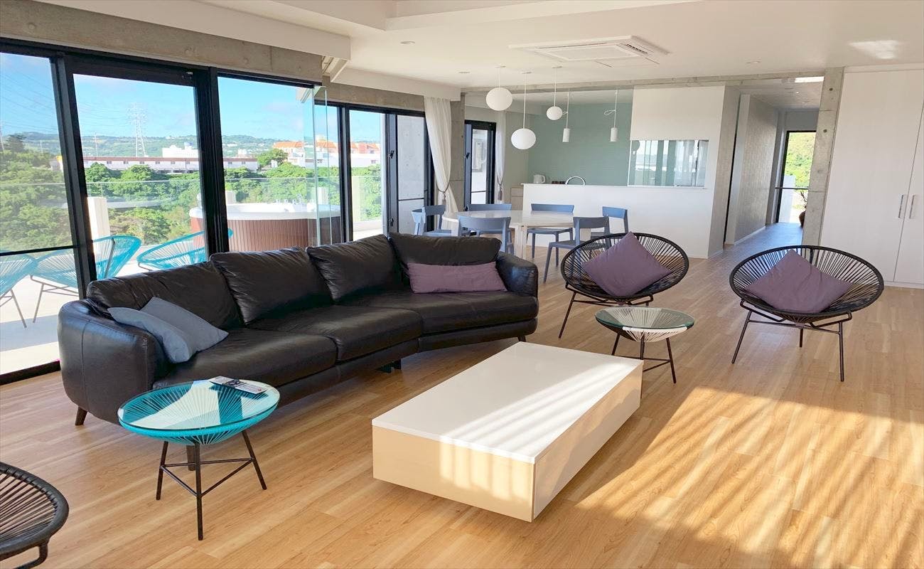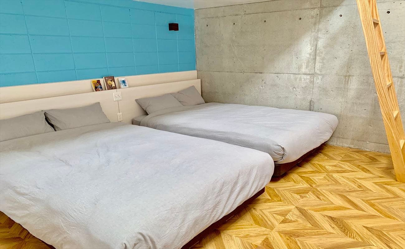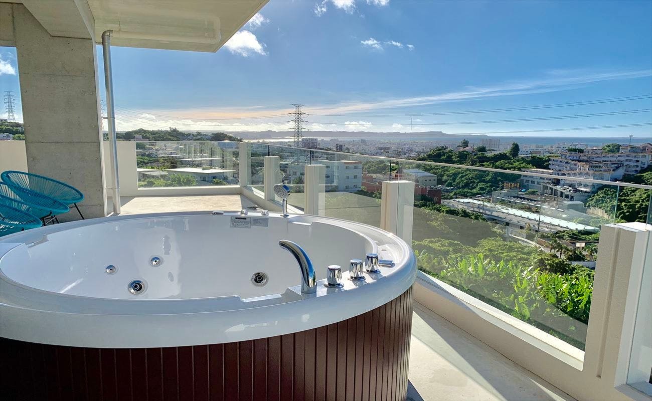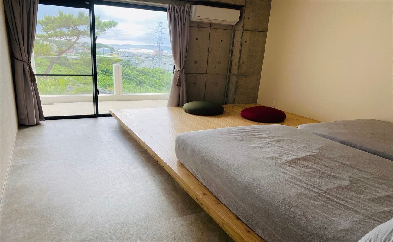 夏のお部屋。日当たりが良くホワイトを基調としたさわやかな内装デザイン。隠れ部屋のロフト付き。お子様連れに安心の琉球畳和室も完備。ダブルサイズの布団2組ご用意しております。眺めの良い広々としたオープンテラスには温水ジャグジー完備。バーベキュー(別途ガスグリルレンタル)もお楽しみいただけます。
