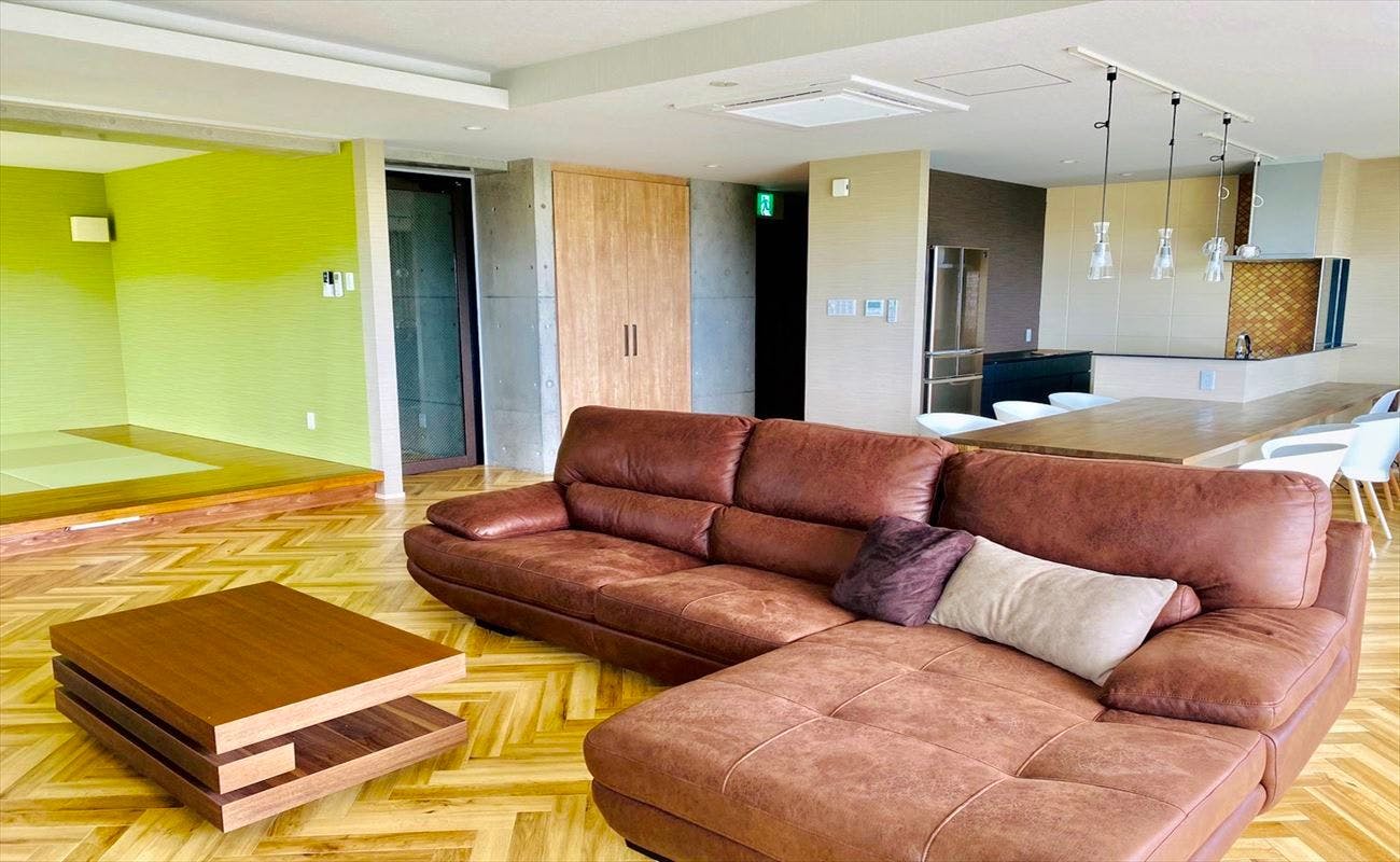 秋のお部屋。ブラウンカラーを基調としたアメリカンな色合い。ベッドルーム3室のうち1室は琉球畳の和室。お子様連れに人気のお部屋。広々としたオープンテラスには温水ジャグジー完備。バーベキュー(別途ガスグリルレンタル)もお楽しみいただけます。ダブルサイズの布団も2組ご用意しております。