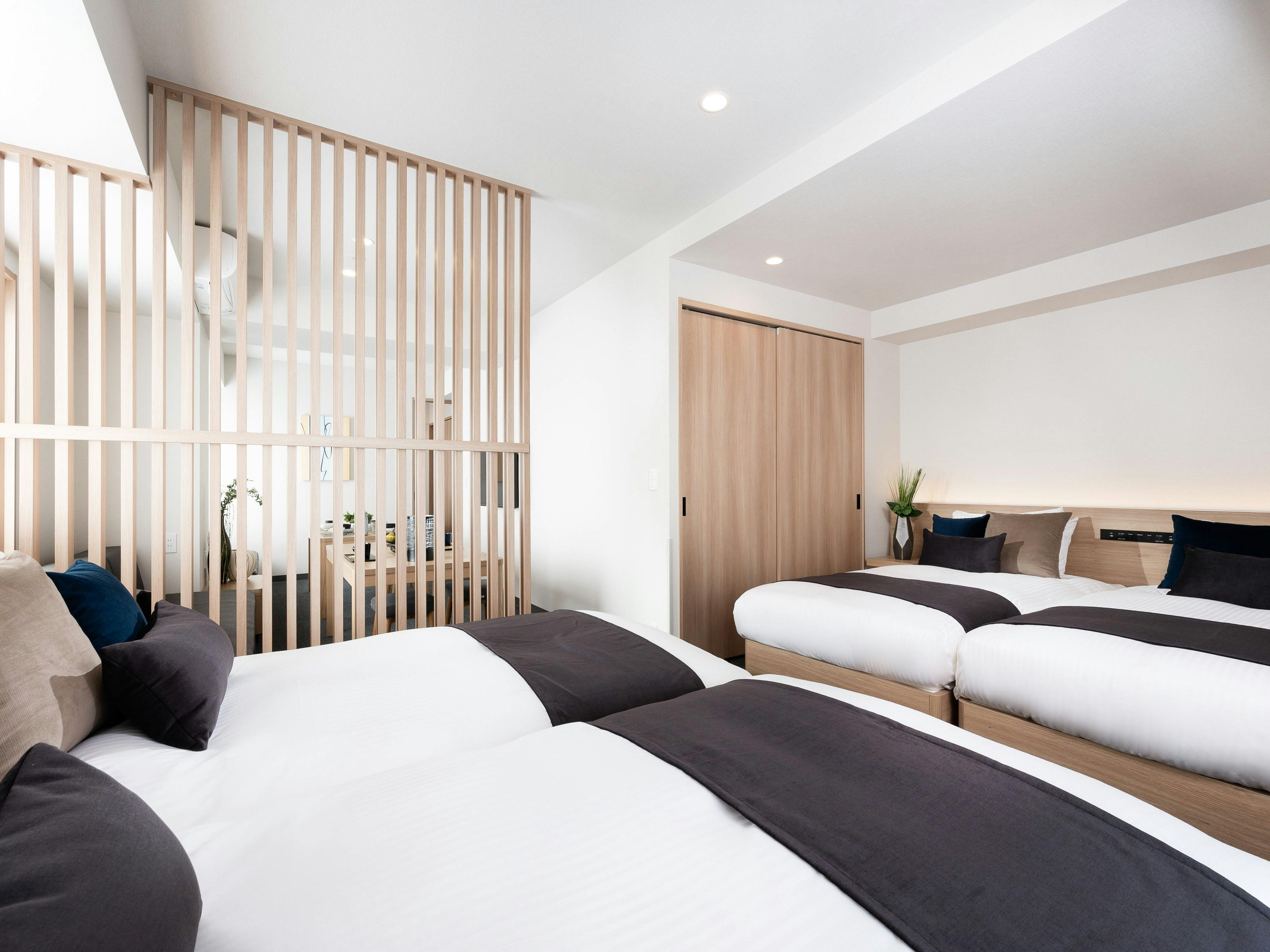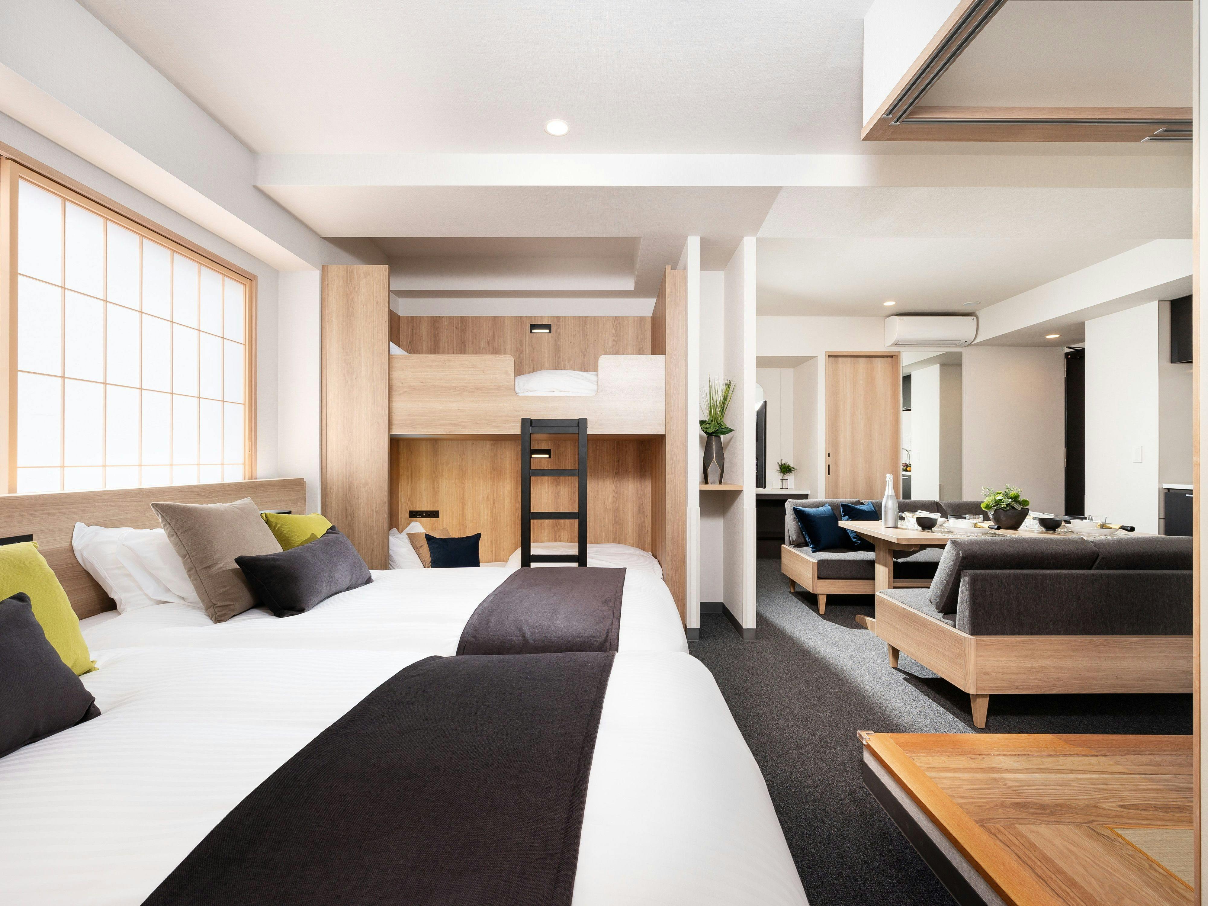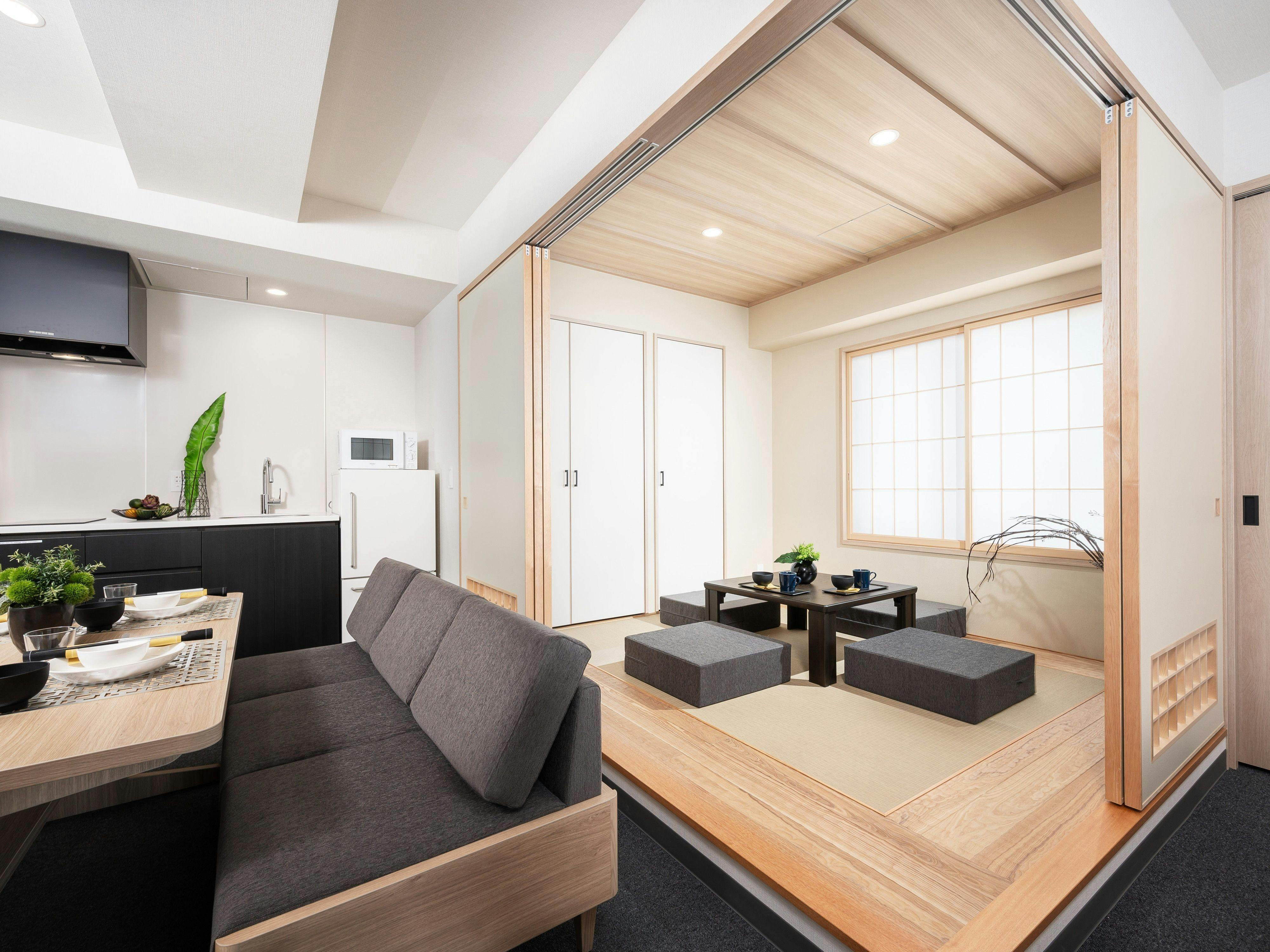 MIMARU東京上野御徒町は、滞在宿泊人数4名から、電子レンジ・2ドア冷蔵庫・キッチン付き、バス・トイレ別、ダイニングテーブルが備え付けの広々とした空間をご提供しております。