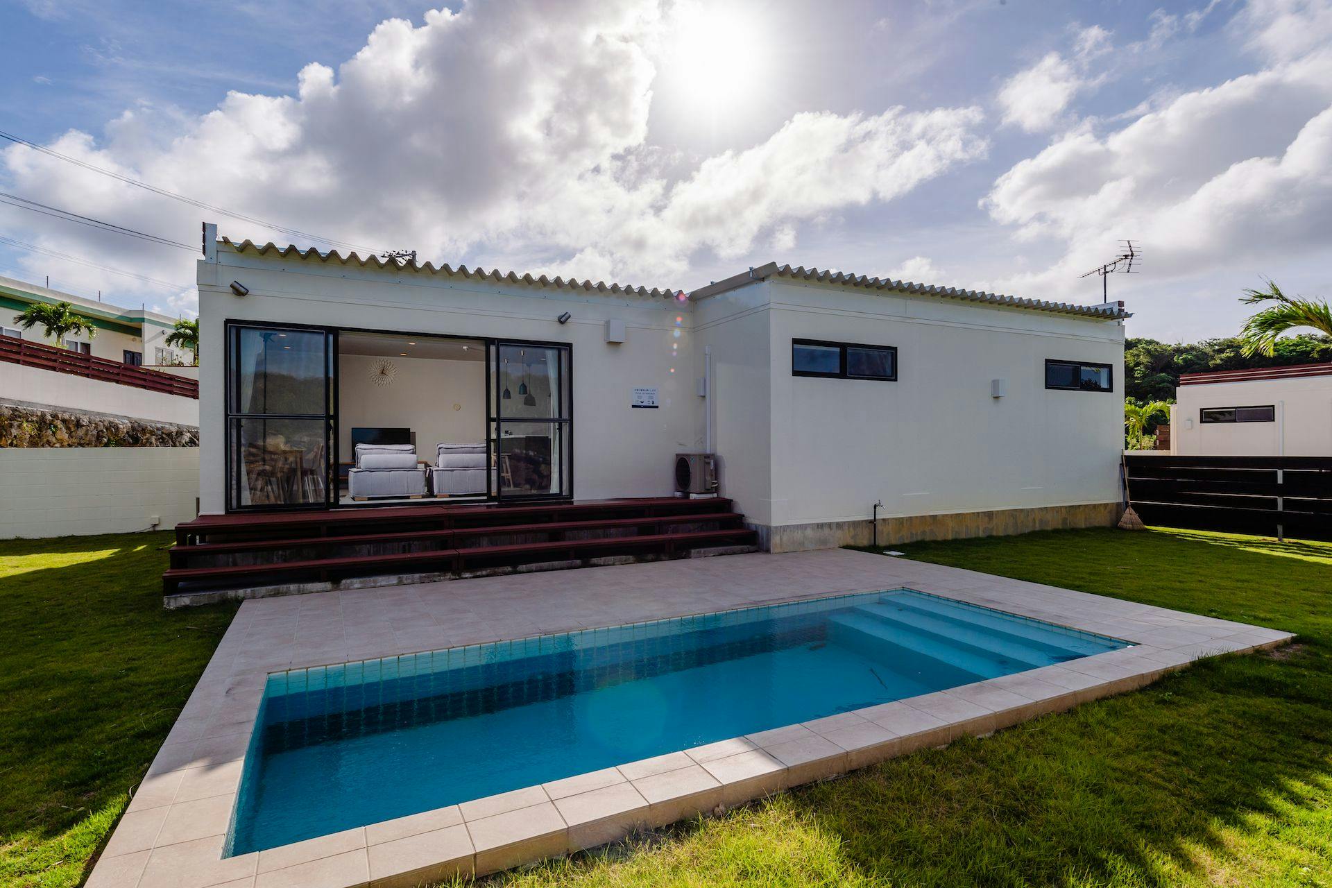 今帰仁村字運天にある平屋のプール付き一軒屋です。