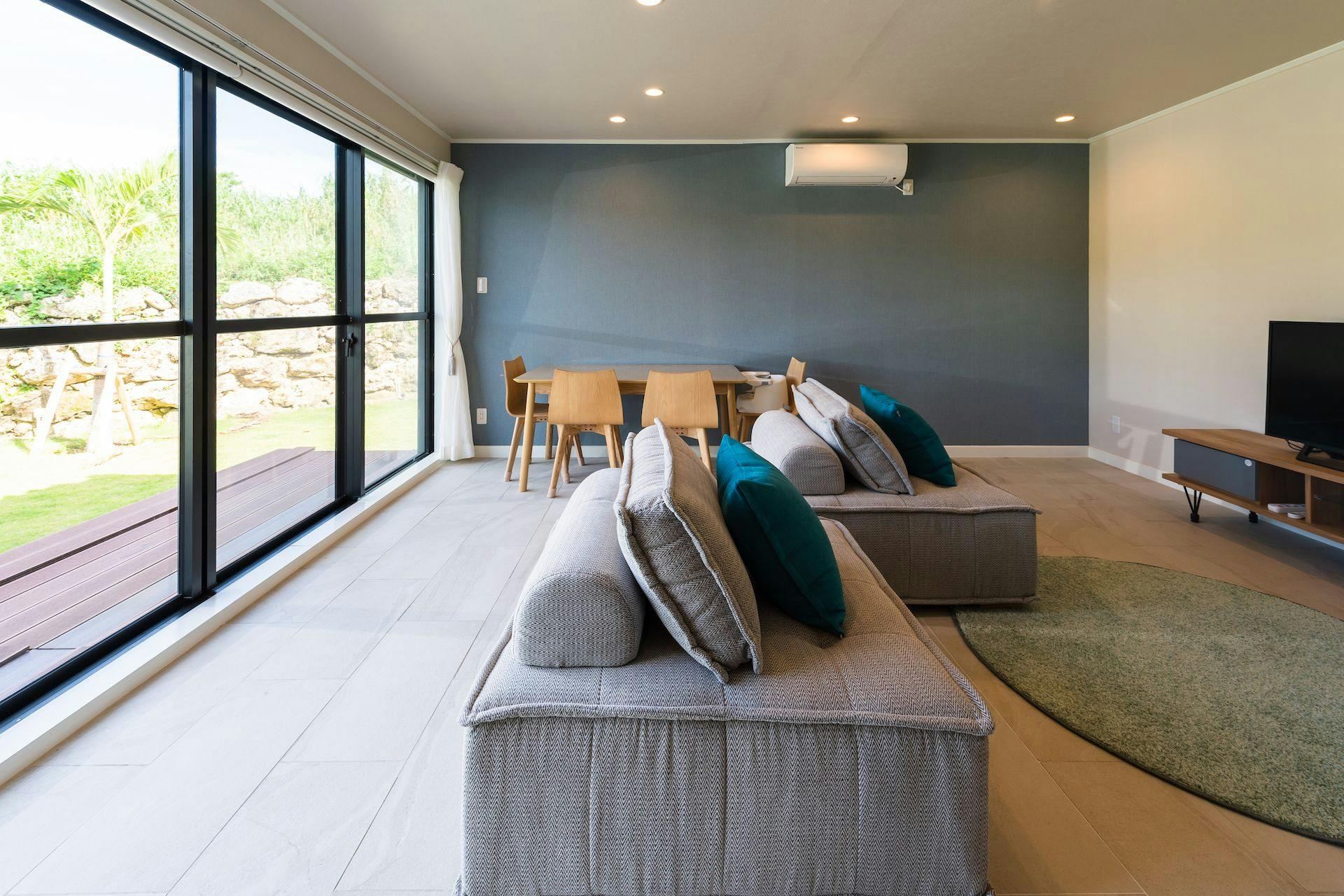 室内には、快適に過ごすための設備が充実しています。リビングには広いソファと大型テレビがあり、みんなで翌日の旅行プランを練りながら、和気藹々と一緒にくつろぐことができます。また、広いキッチンには調理器具や食器、カトラリーが揃っているため、地元の食材を使った美味しい料理を作ることも可能です。