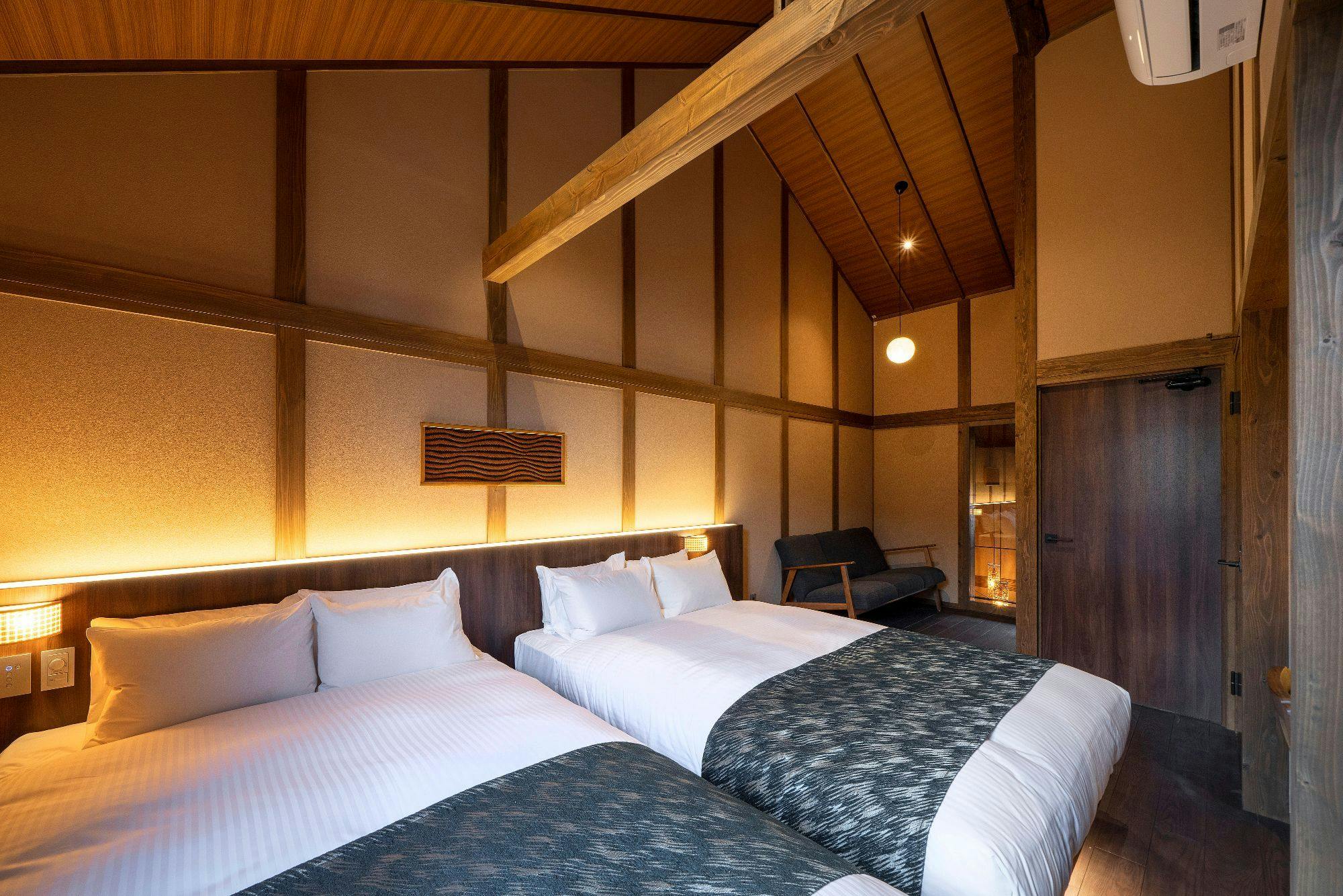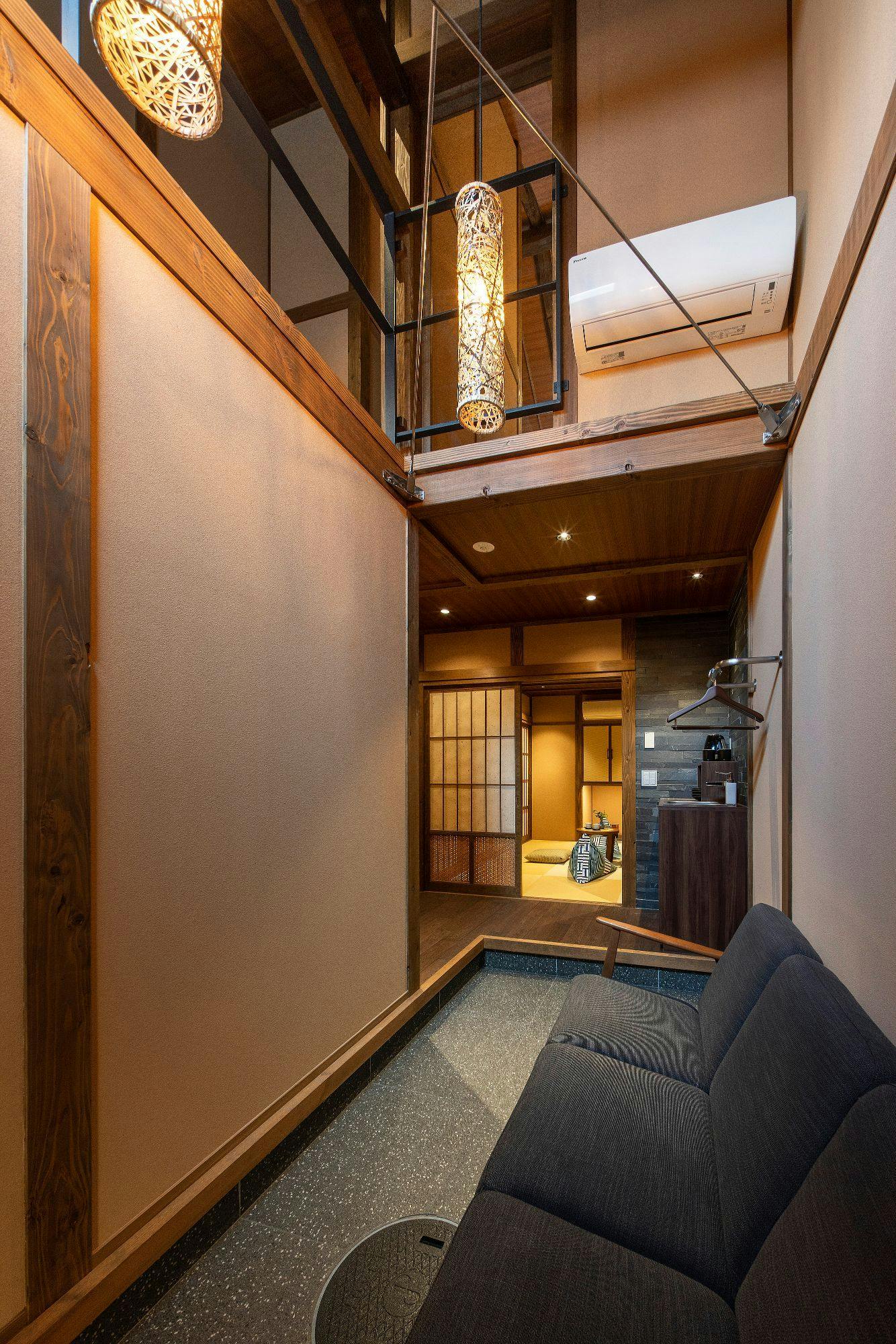 開放的な吹き抜けを繊細な竹細工と照明の光が彩る町家宿。