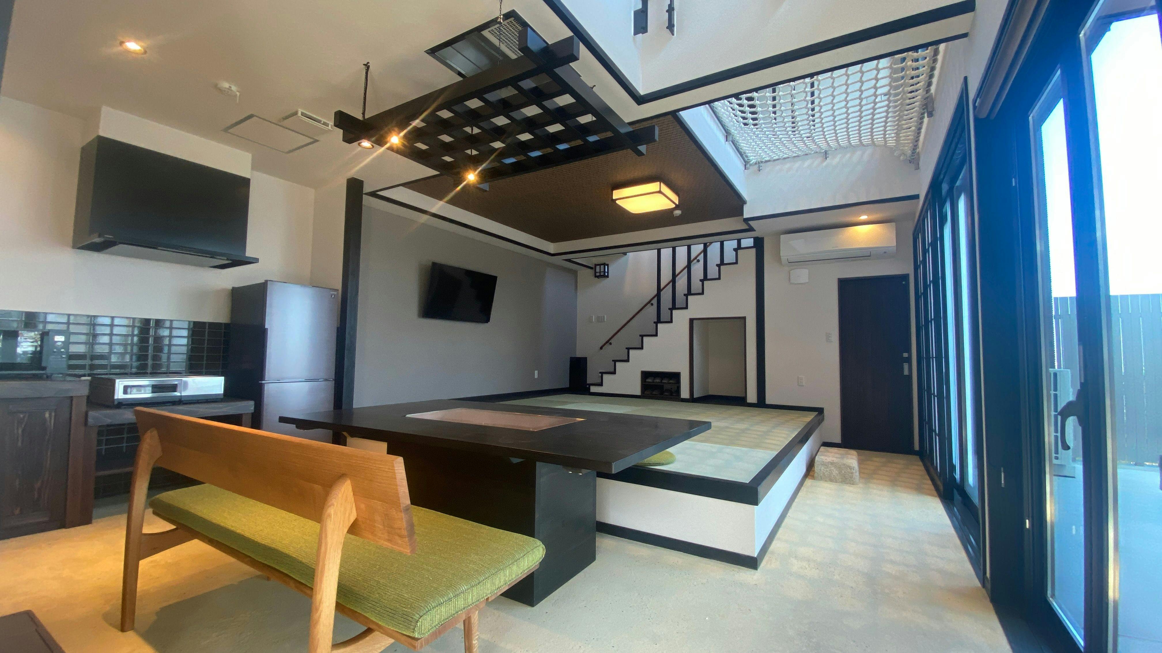 「くつろぎテラス」の名前通り、古民家風の落ち着いた室内、落ち着いた照明に囲まれ、信楽焼のお風呂もあり、ゆったりと上質な大人の時間を過ごして頂くために、ご準備致しました。月籠のエントランスの近くには、ヤギさんの小屋もあり、ヤギさんと触れ合うこともできます。