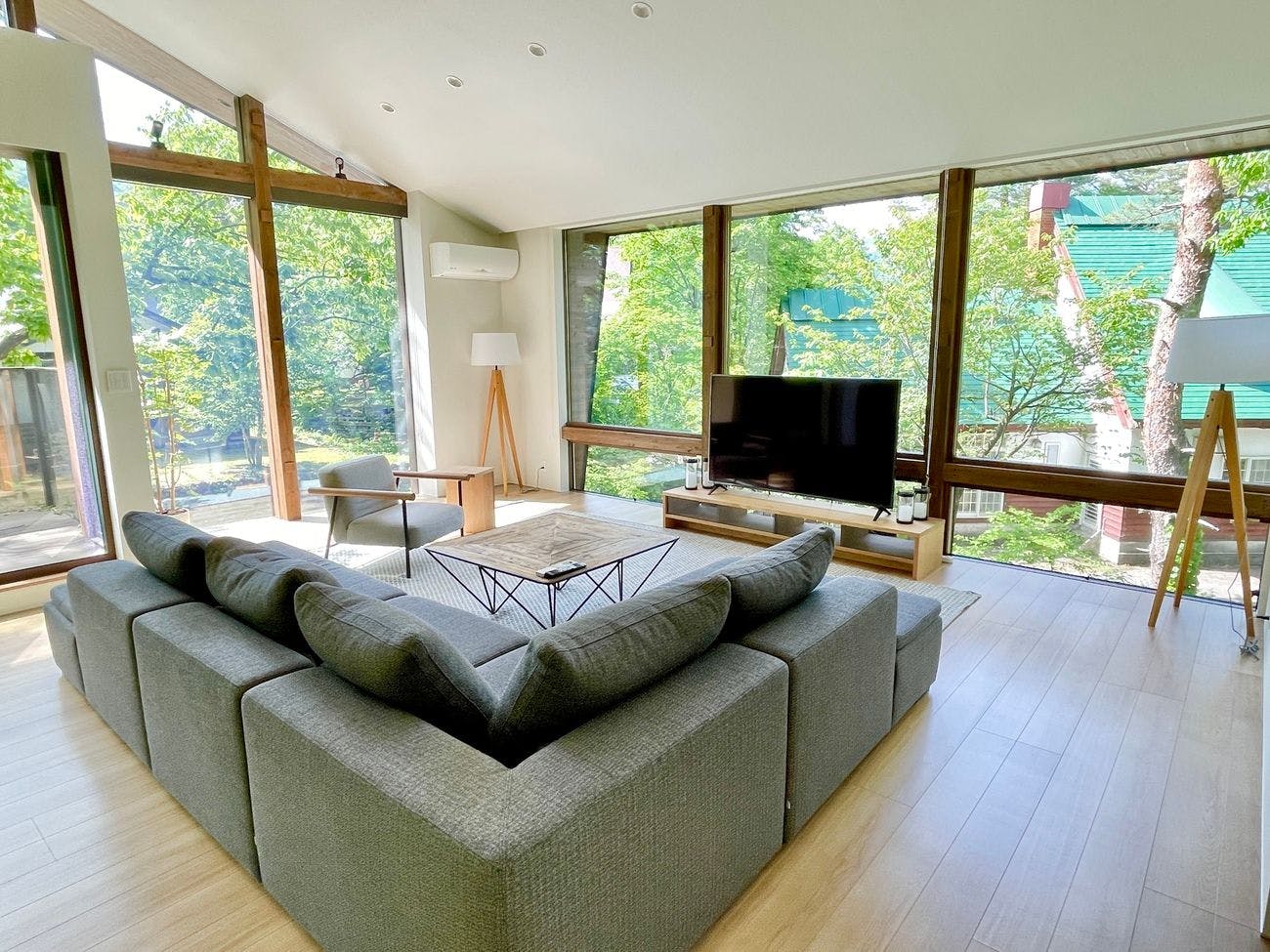 エコーランド地区の閑静なエリアにある3.5LDKの高級貸別荘。 2階の大きな窓から木々に囲まれた自然の景色を眺めながら、優雅にお過ごしいただけます。ペットフレンドリーのシャレーとしても大人気。