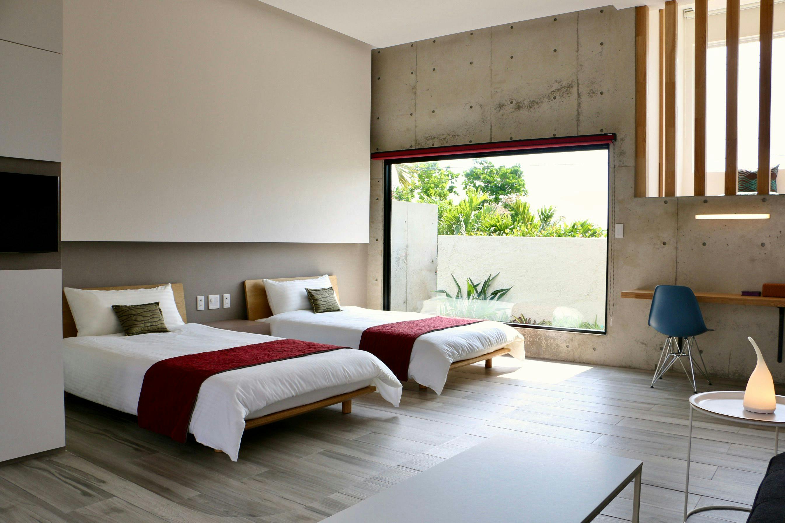 セミダブルのツインベッドを配し、2名様のご利用に最適なロッジですが、珊瑚の海を望むロフトを利用して、3名様までのご宿泊が可能です。