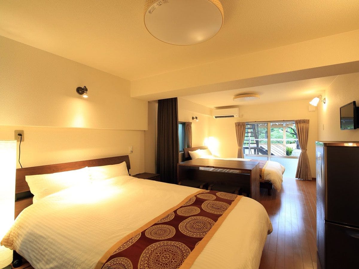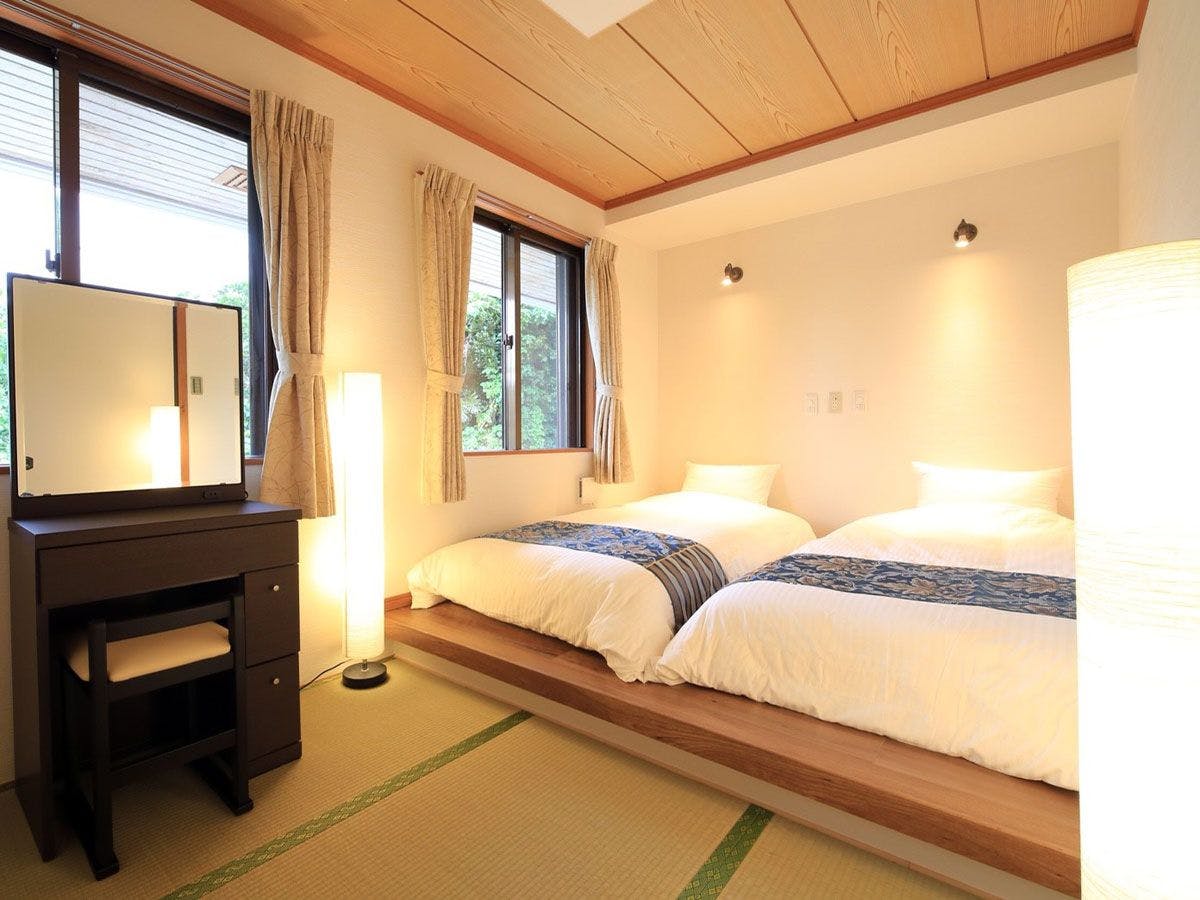 リビングルーム、ダイニングルーム、和室、寝室、離れ寝室和室12畳×布団4名和室ツインルーム×シングルベッド2台和室小上がりツインルーム×シングルベッド2台本邸隣接の離れツインルーム×セミダブルベッド2台