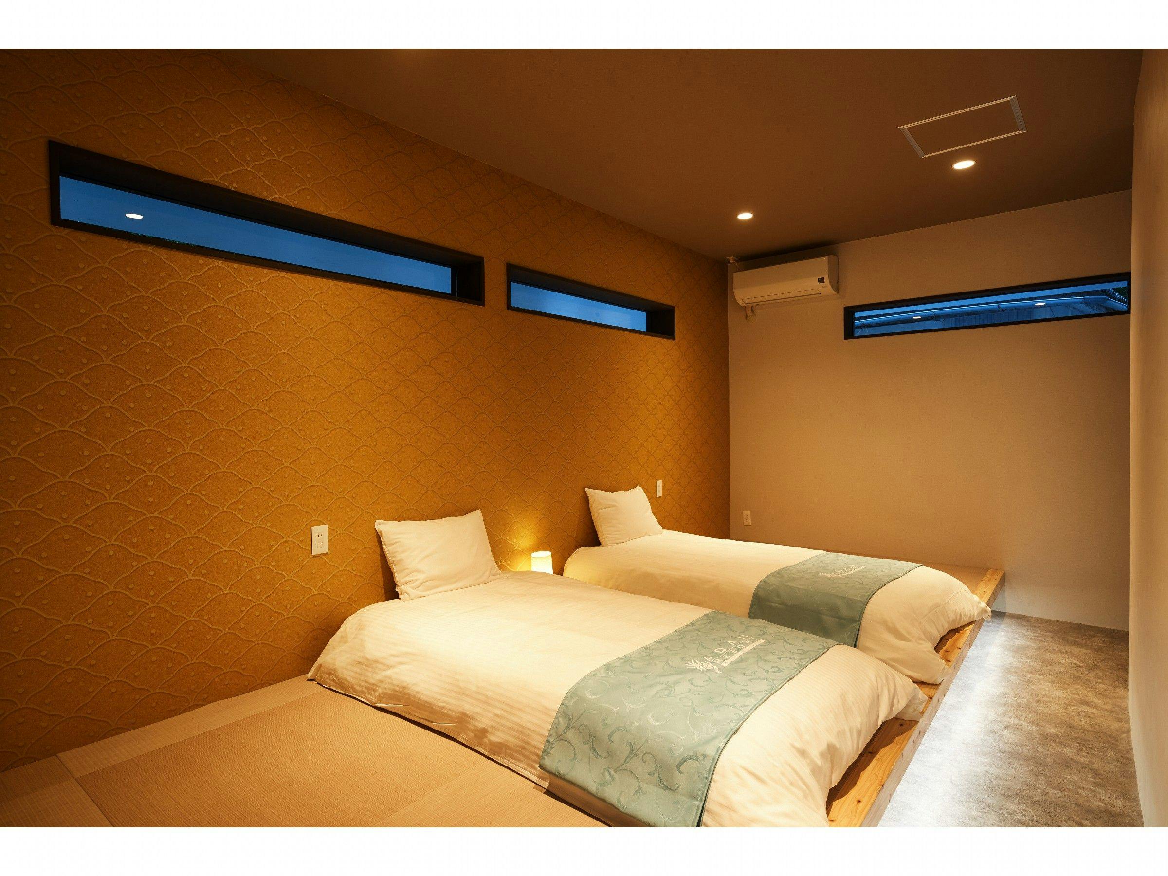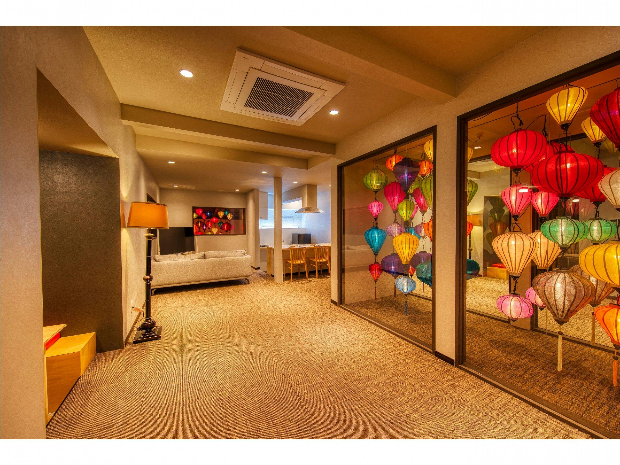 幻想的な雰囲気漂うフクギ並木内に建つ、一棟貸しのリゾートヴィラ。本場ベトナムから取り寄せたランタンが灯る癒しの室内。空やフクギが眺められる半露天風呂も魅力!キッチンや洗濯機を備え長期滞在にも最適。