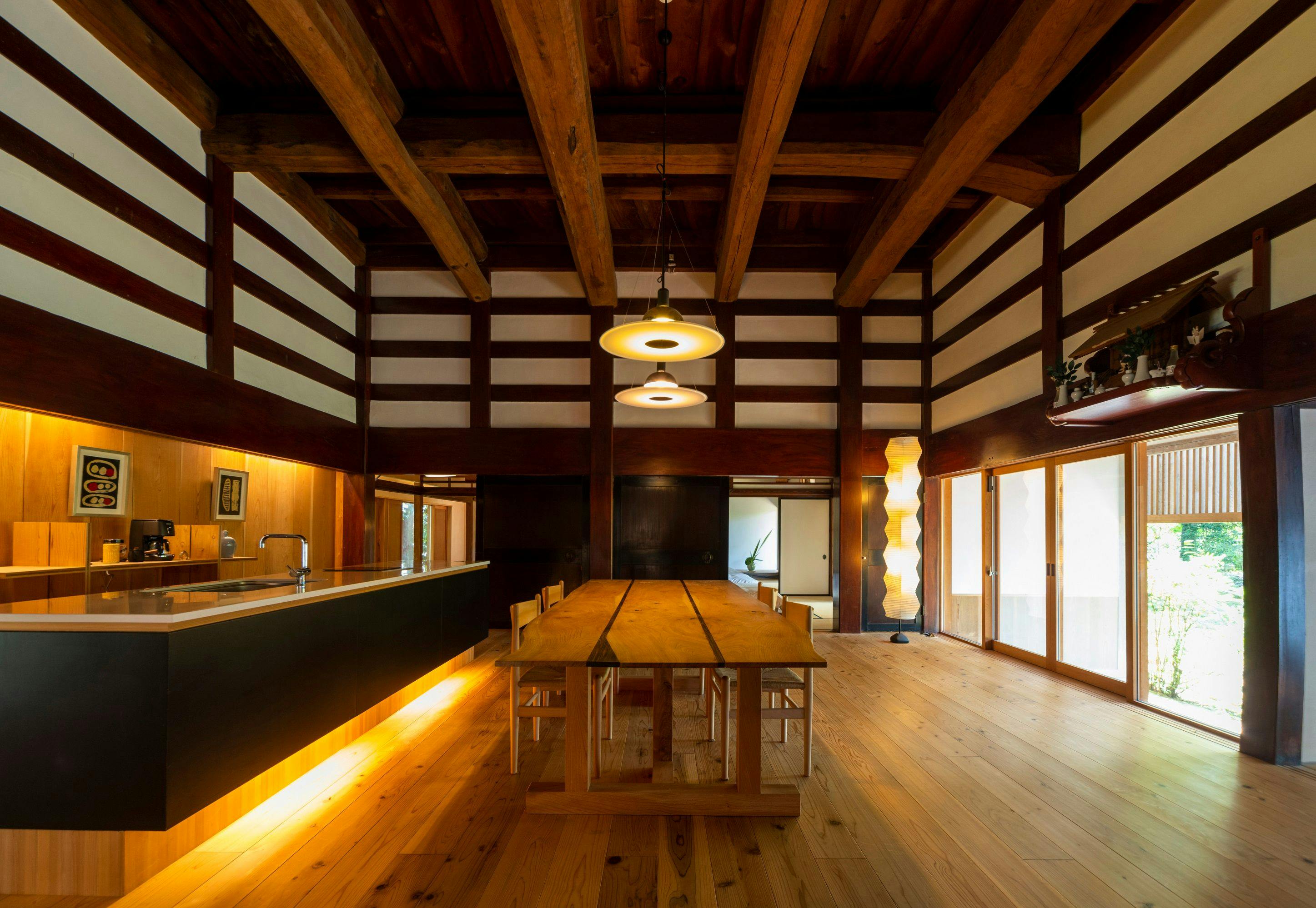 「埜の家」は、築130年の古民家に伝統の大工の技で新しい息吹を注ぎ込んだ、一棟貸しの宿です。北陸特有の 建築様式「枠の内」をそのまま残しています。 枠の内とは、大雪に耐えるため太い梁を井桁のように組み上げる構法です。家の中心にある大広間は高い吹き抜けになっていて、かつては 囲炉裏のまわりに人が集まる場所でした。現代では手に入らない立派な木材がふんだんに使用されており、うっとりする美しさと懐かしい安らぎに満ちた空間です。※4名様以上の場合和室にお布団をご用意します。