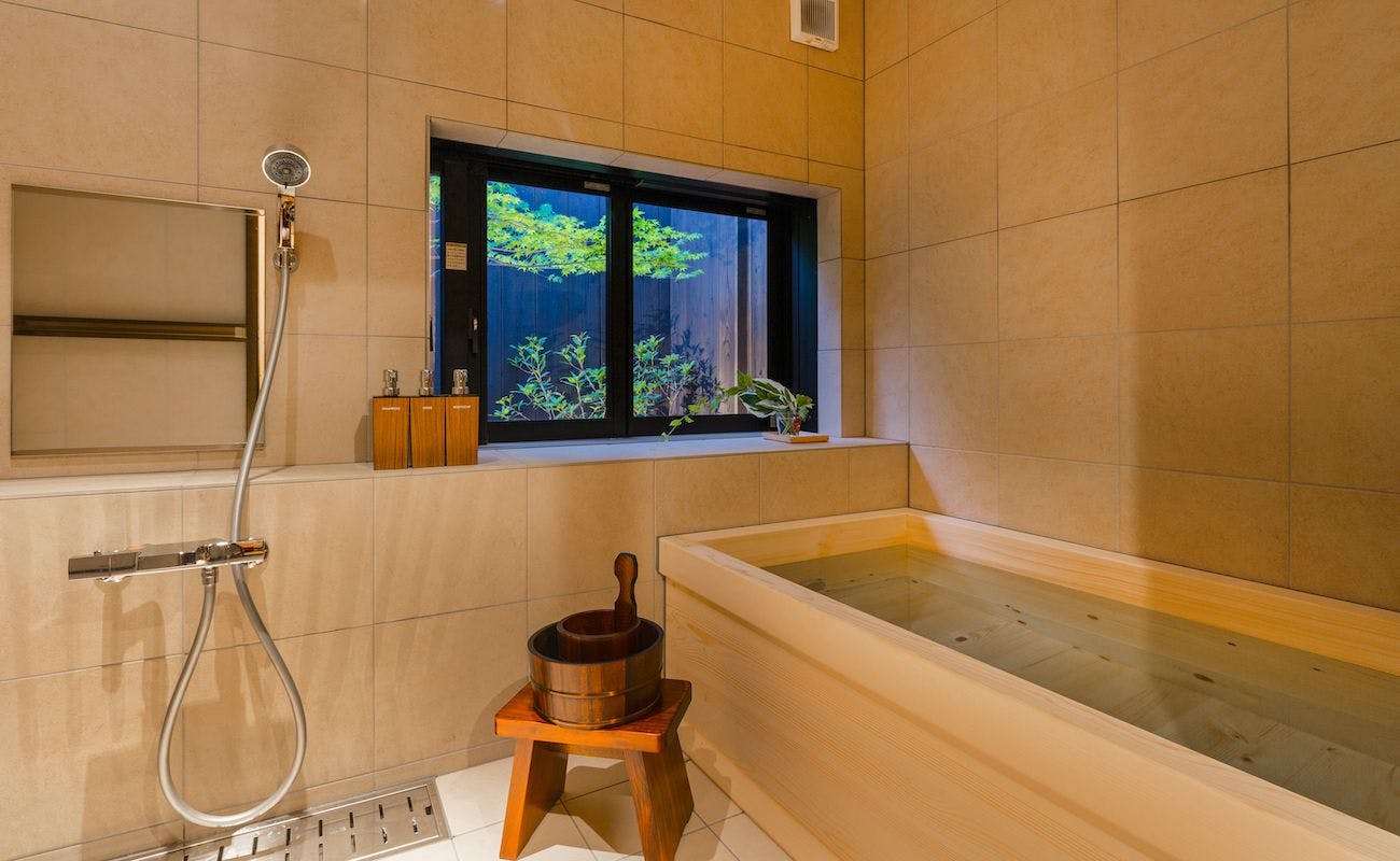 お風呂は高級槙の浴槽で、坪庭を眺めながらおくつろぎいただけます。