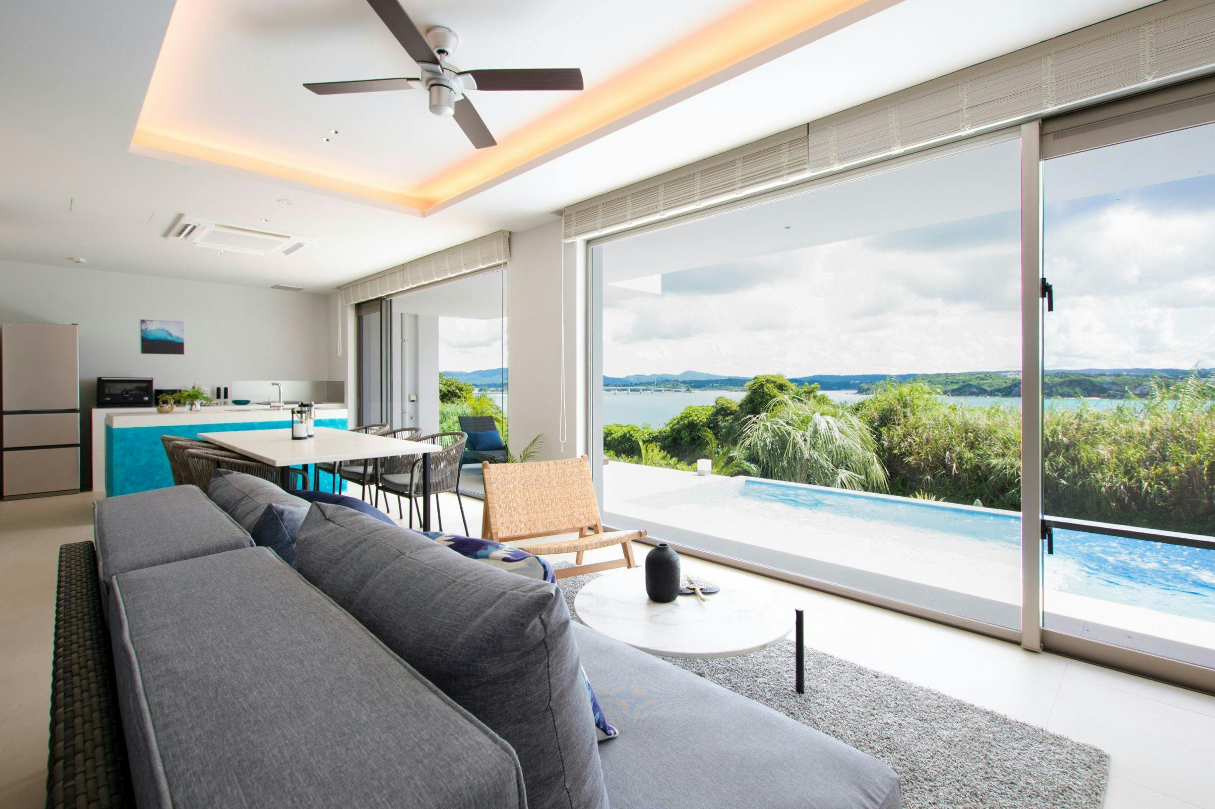 古宇利大橋が一望できるオーシャンビューのロケーション、開放的なリビングダイニングキッチン、テラスにはプライベートプールがあるのが特徴です。