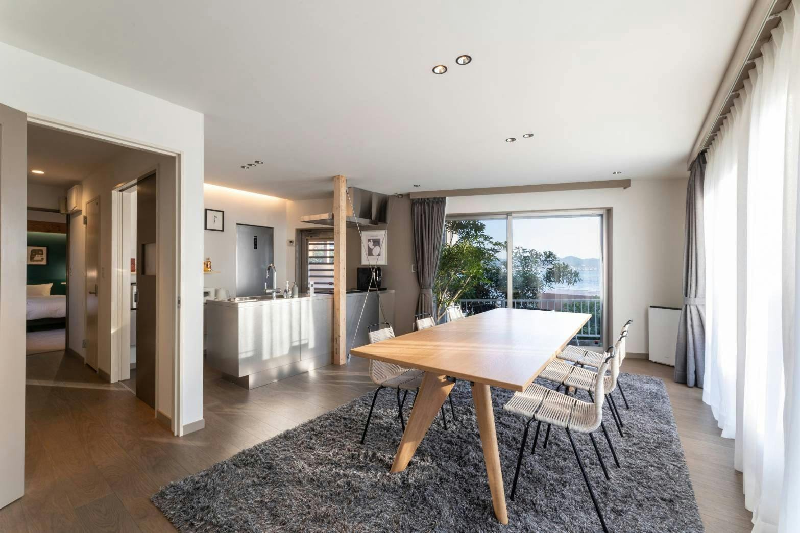 室内は木の温もり感じるリビング・ダイニング、すぐに利用可能なオープンキッチン、ミニバーとしてドリンクやアルコールも常備。